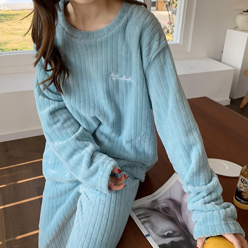 월야시 따뜻한 세트 산호 벨벳 잠옷 여성용 2025 가을 겨울 외출 가능 두꺼운 보온 세로 줄무늬 홈웨어스토어 가기