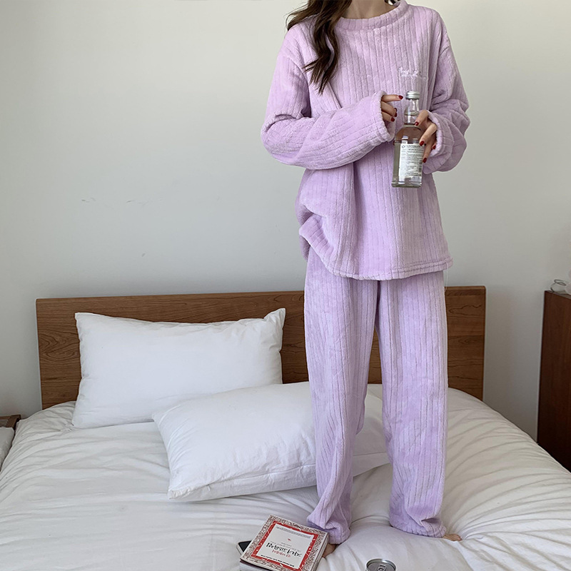 월야시 따뜻한 세트 산호 벨벳 잠옷 여성용 2025 가을 겨울 외출 가능 두꺼운 보온 세로 줄무늬 홈웨어
