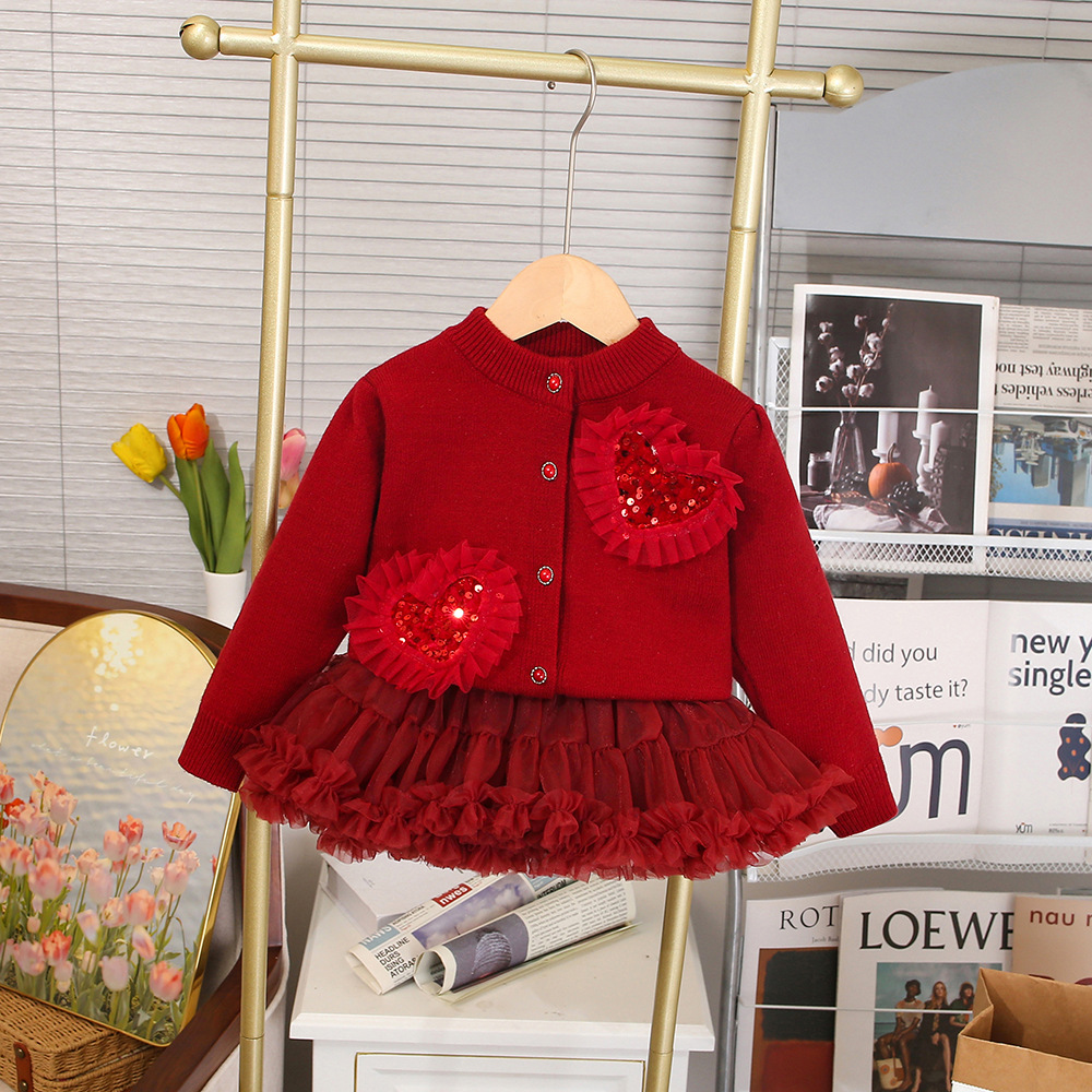 여자 가디건 스웨터 가을과 겨울 새로운 하트 니트 가디건 + 메쉬 푹신한 스커트 아기 소녀 공주 스커트 세련된