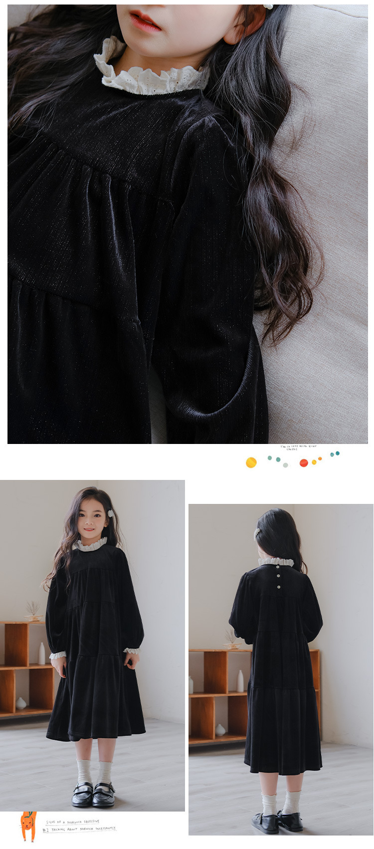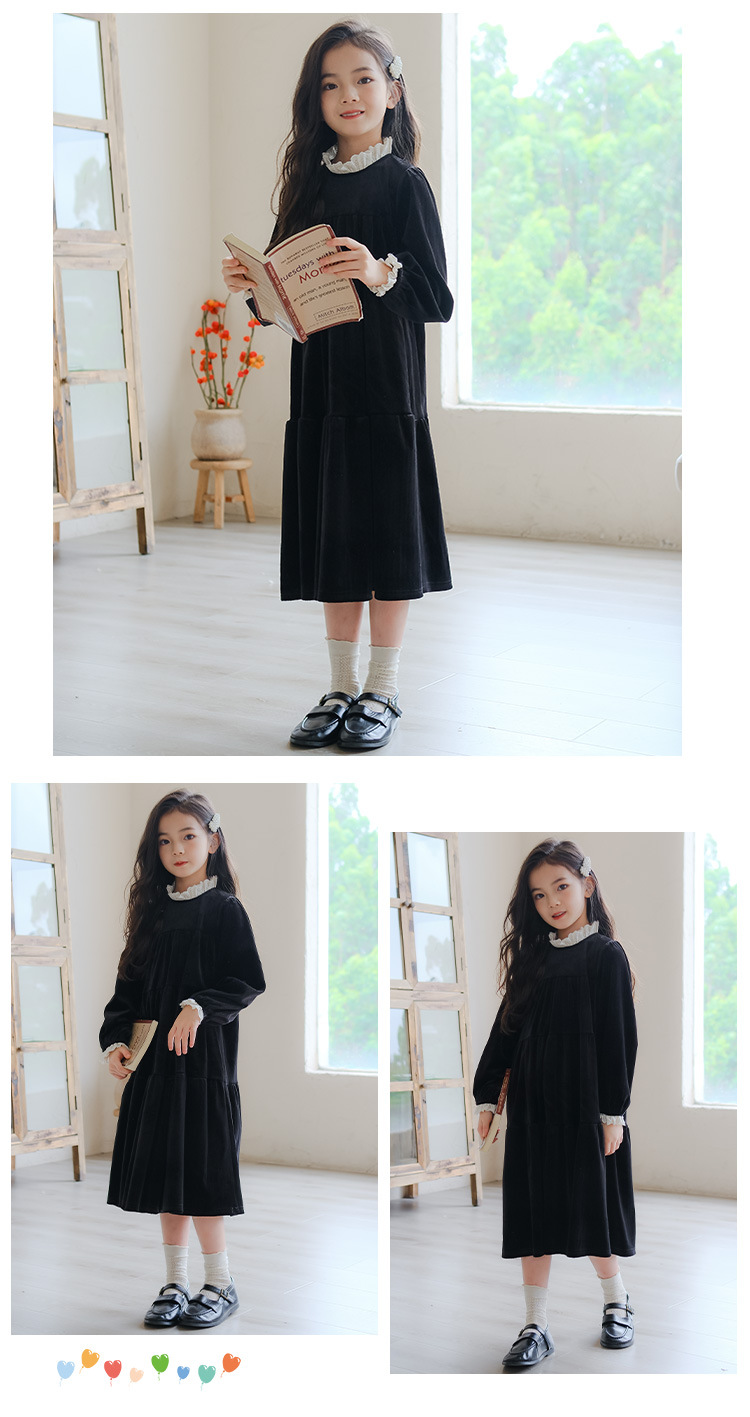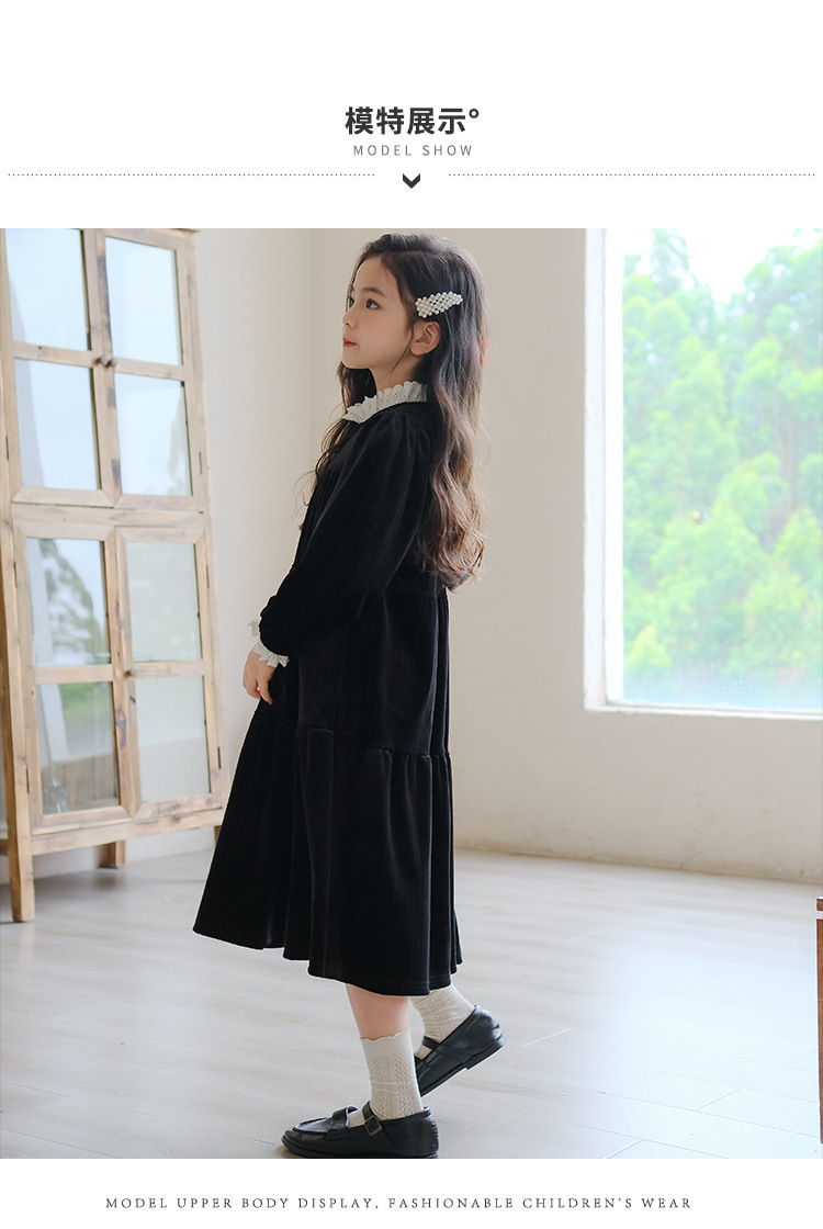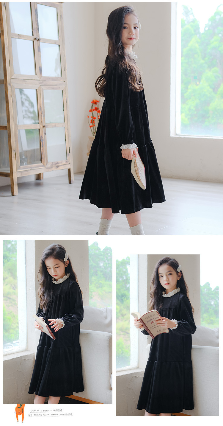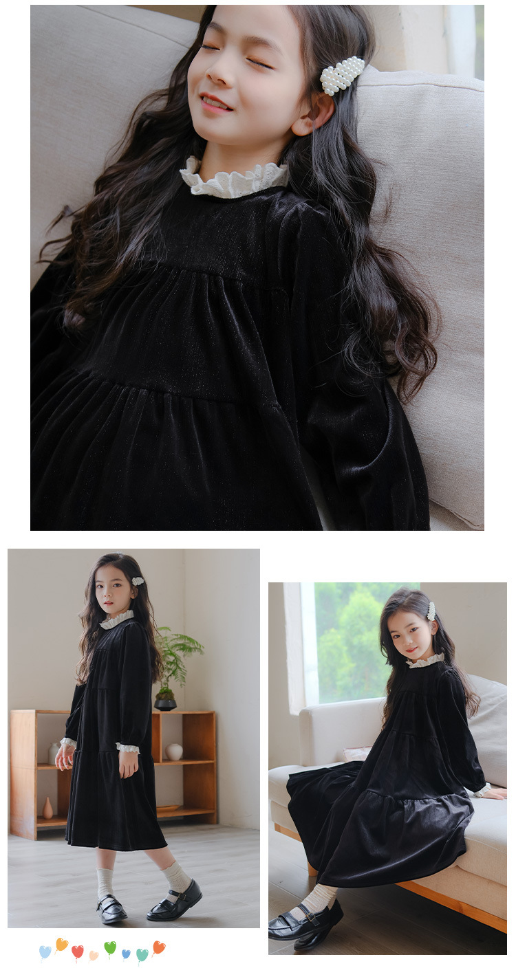 소녀 블랙 벨벳 원피스 2024 가을 겨울 서양식 긴 소매 대비 레이스 기모 케이크 스커트스토어 가기