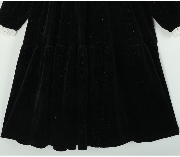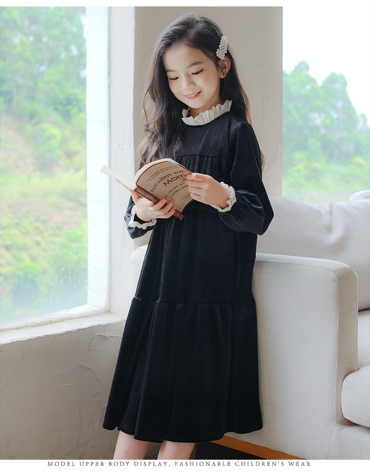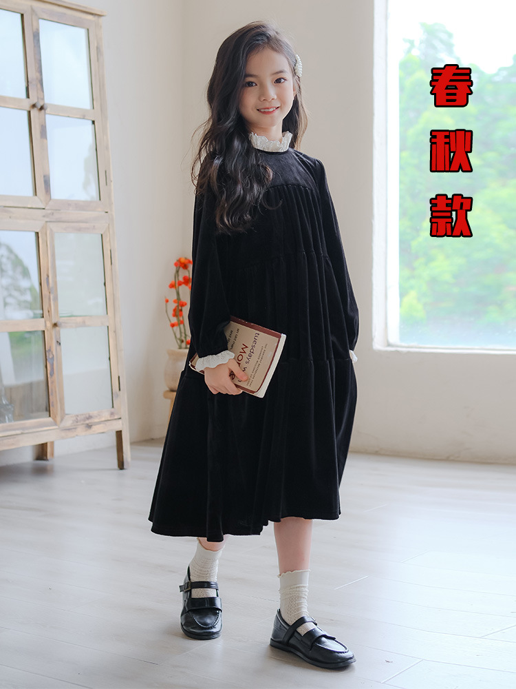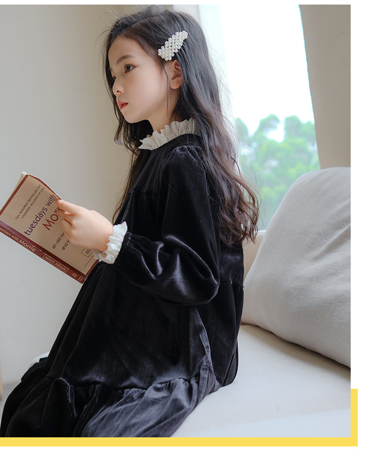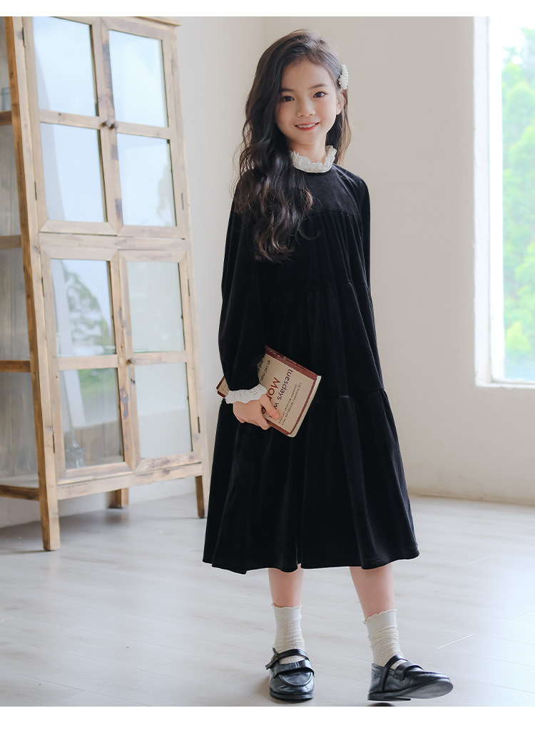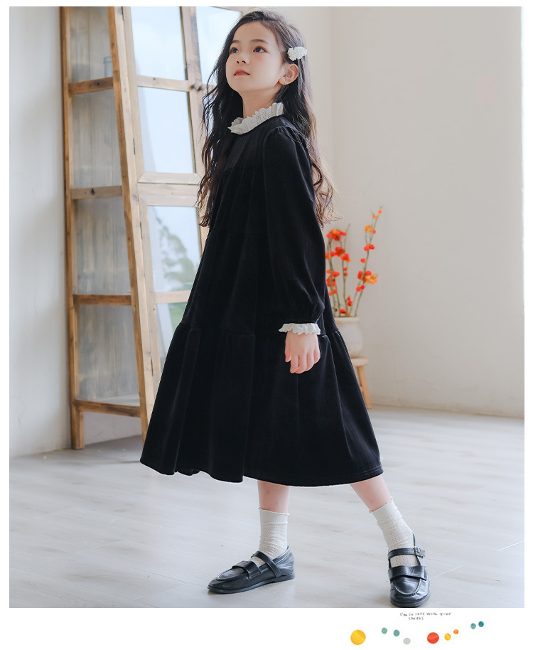 소녀 블랙 벨벳 원피스 2024 가을 겨울 서양식 긴 소매 대비 레이스 기모 케이크 스커트스토어 가기