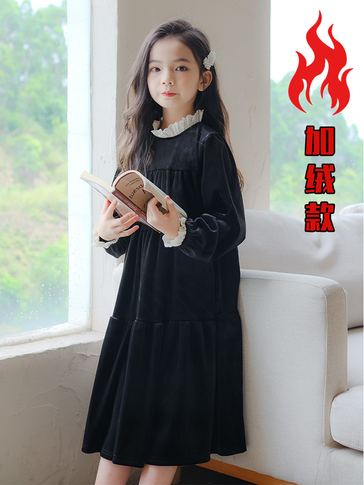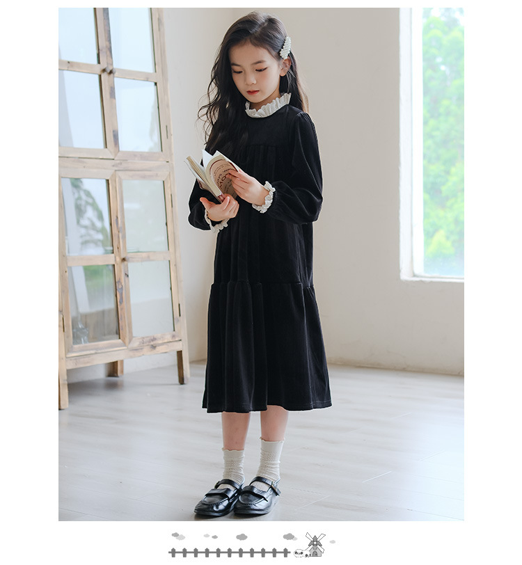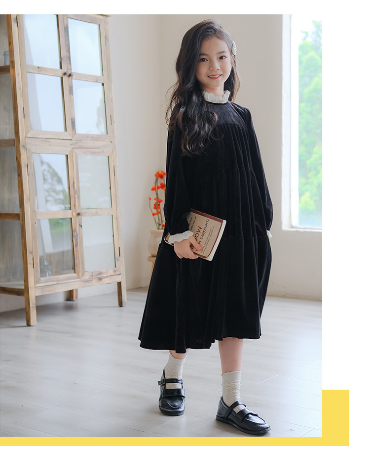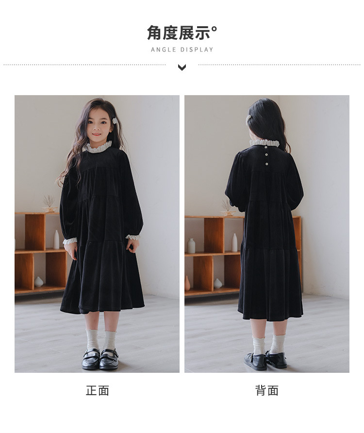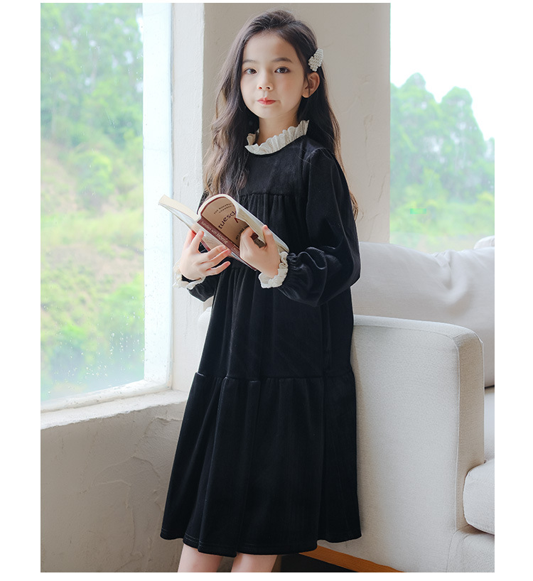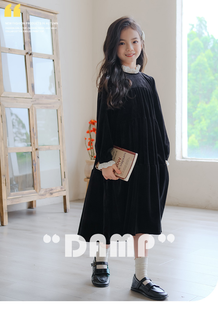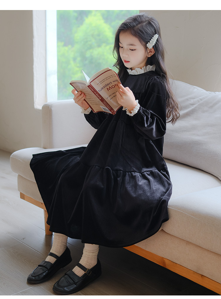소녀 블랙 벨벳 원피스 2024 가을 겨울 서양식 긴 소매 대비 레이스 기모 케이크 스커트스토어 가기
