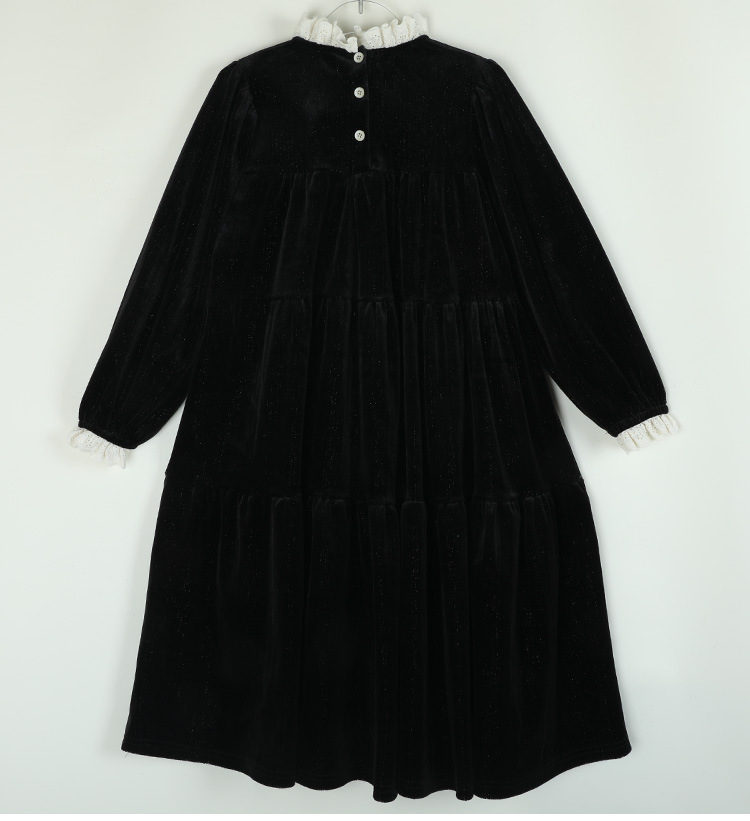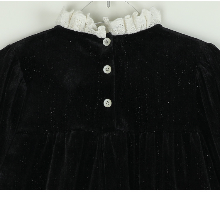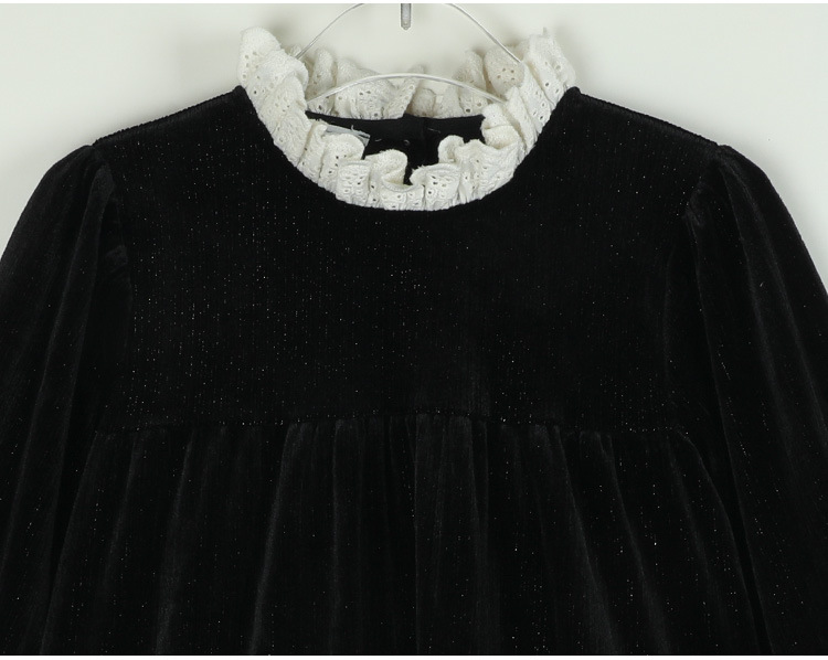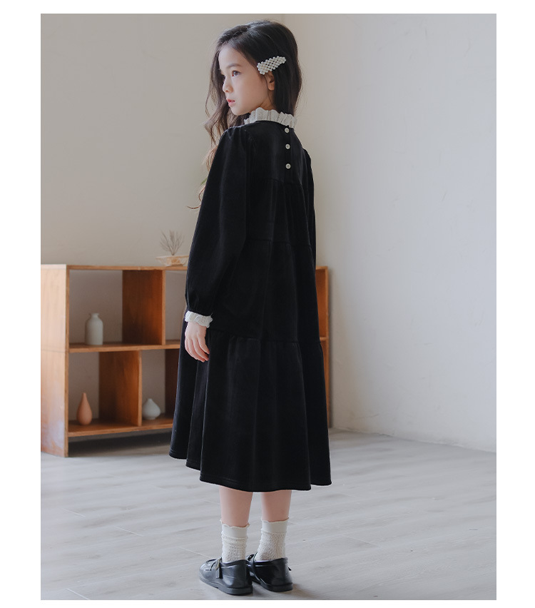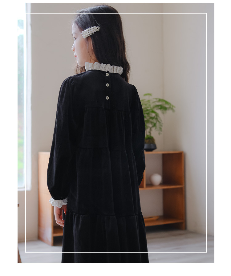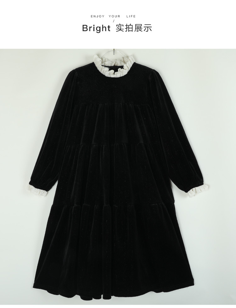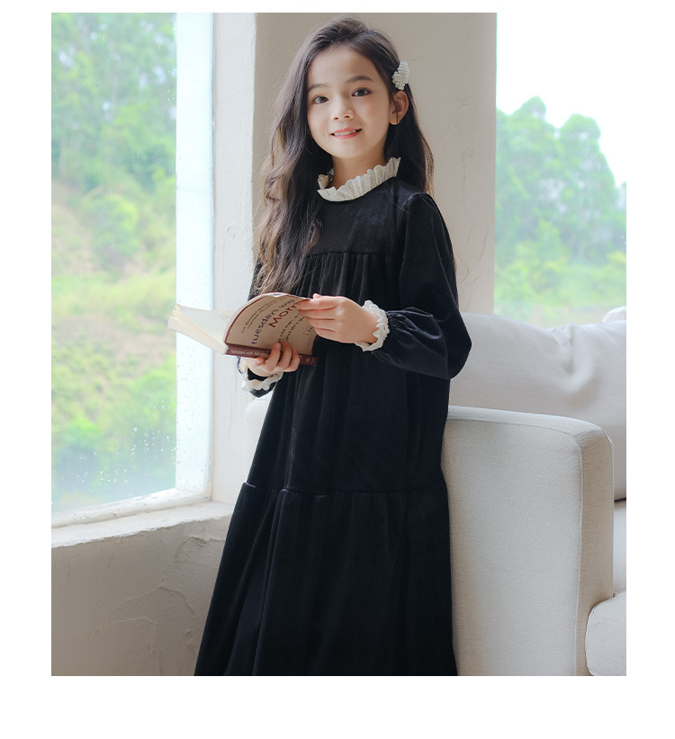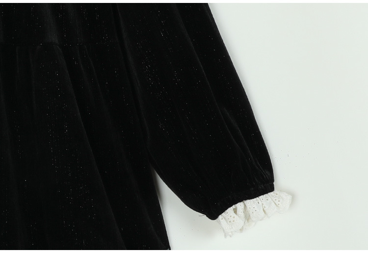 소녀 블랙 벨벳 원피스 2024 가을 겨울 서양식 긴 소매 대비 레이스 기모 케이크 스커트스토어 가기