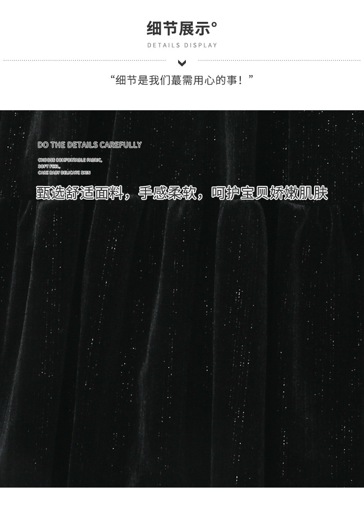 精选优质丝绒面料,质感超赞的,整件裙子重量比较重,垂感超好的,面料纹路呈暗条纹+点点银色反光效果(是丝绒织进面料里面的,不会掉),拿到实物,整件裙子闪闪发光一般,非常有特色,超好看的,建议穿亲子装,大人穿也很好看的