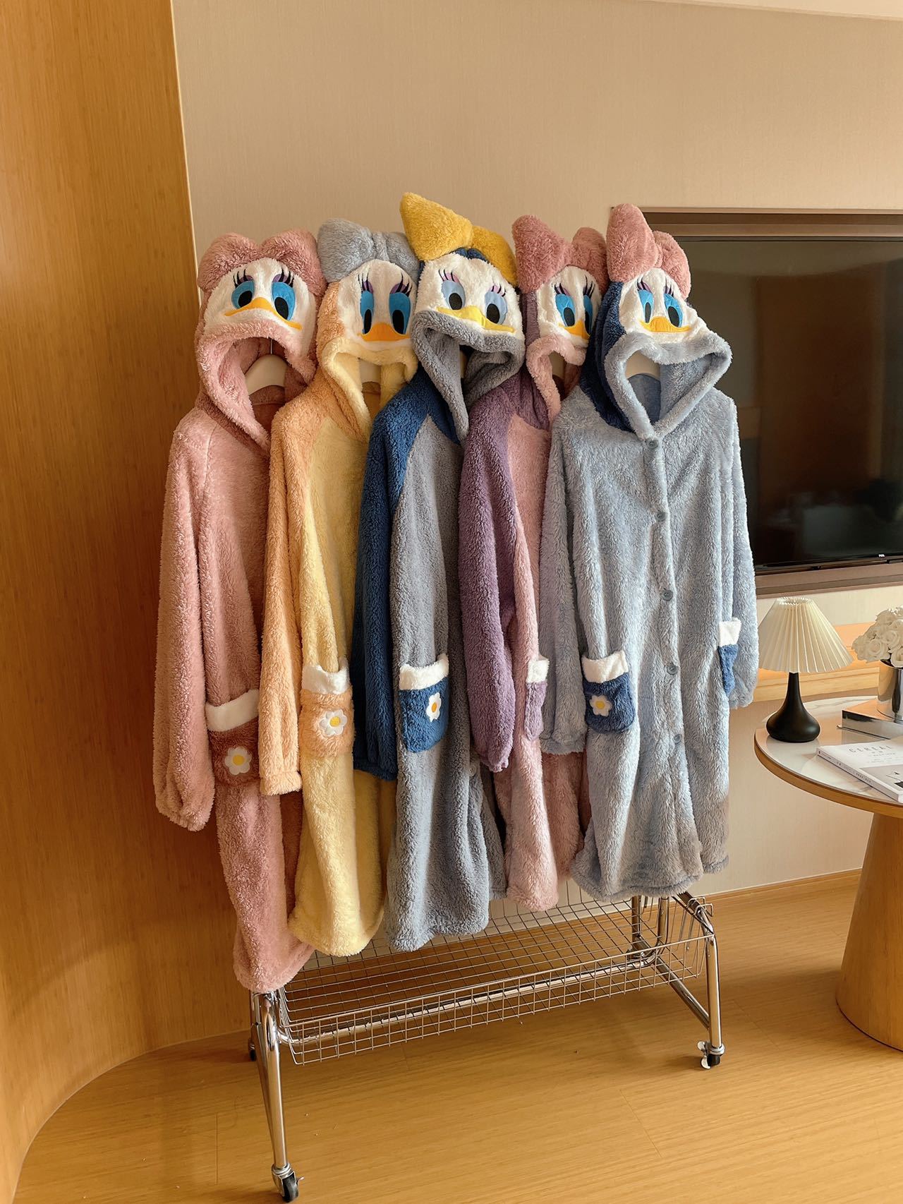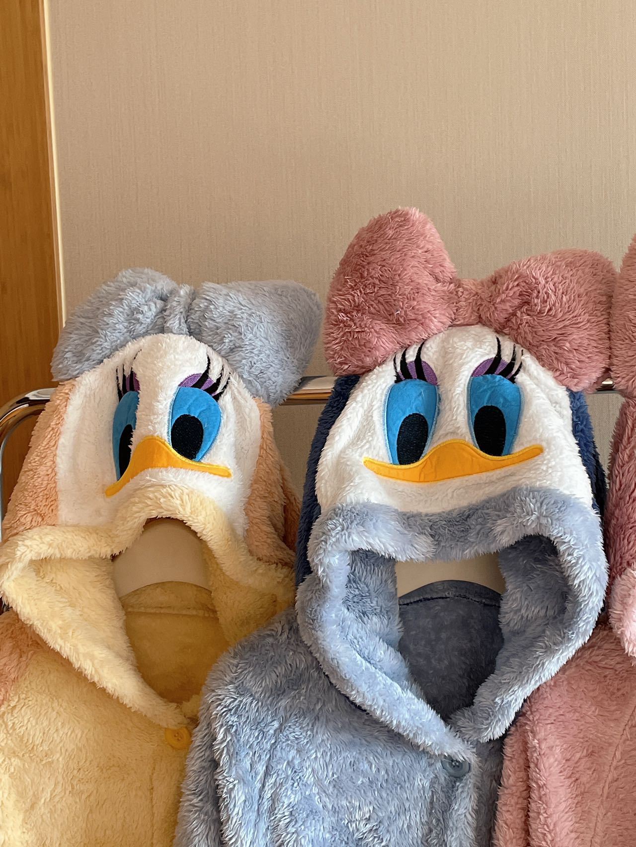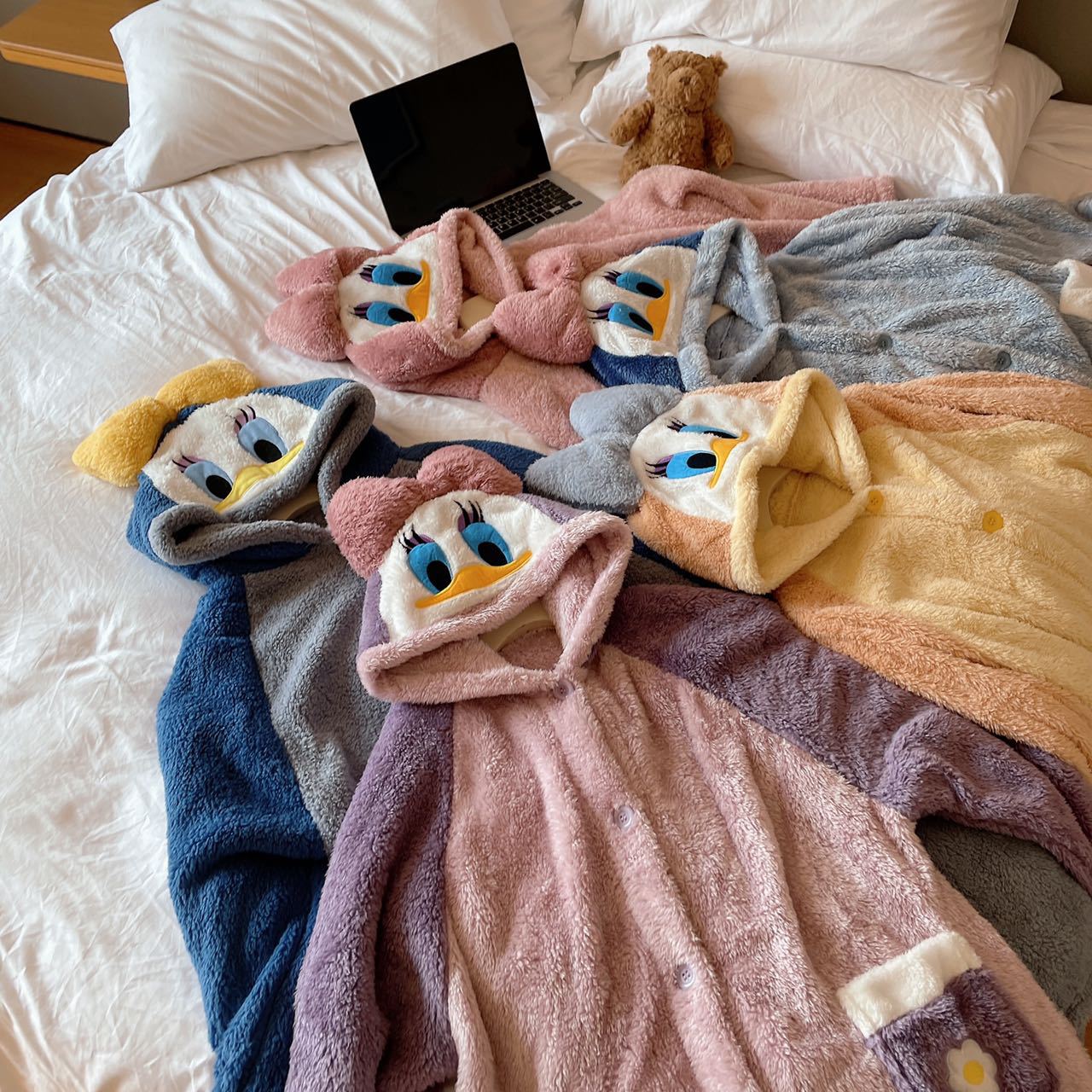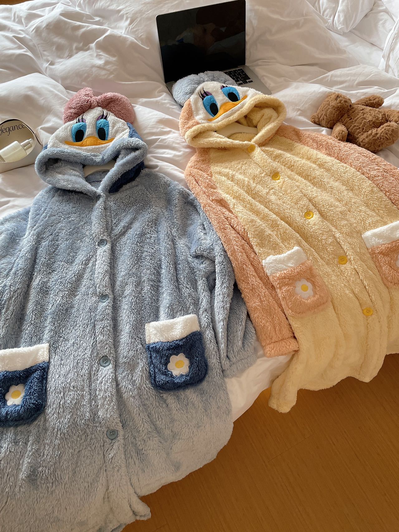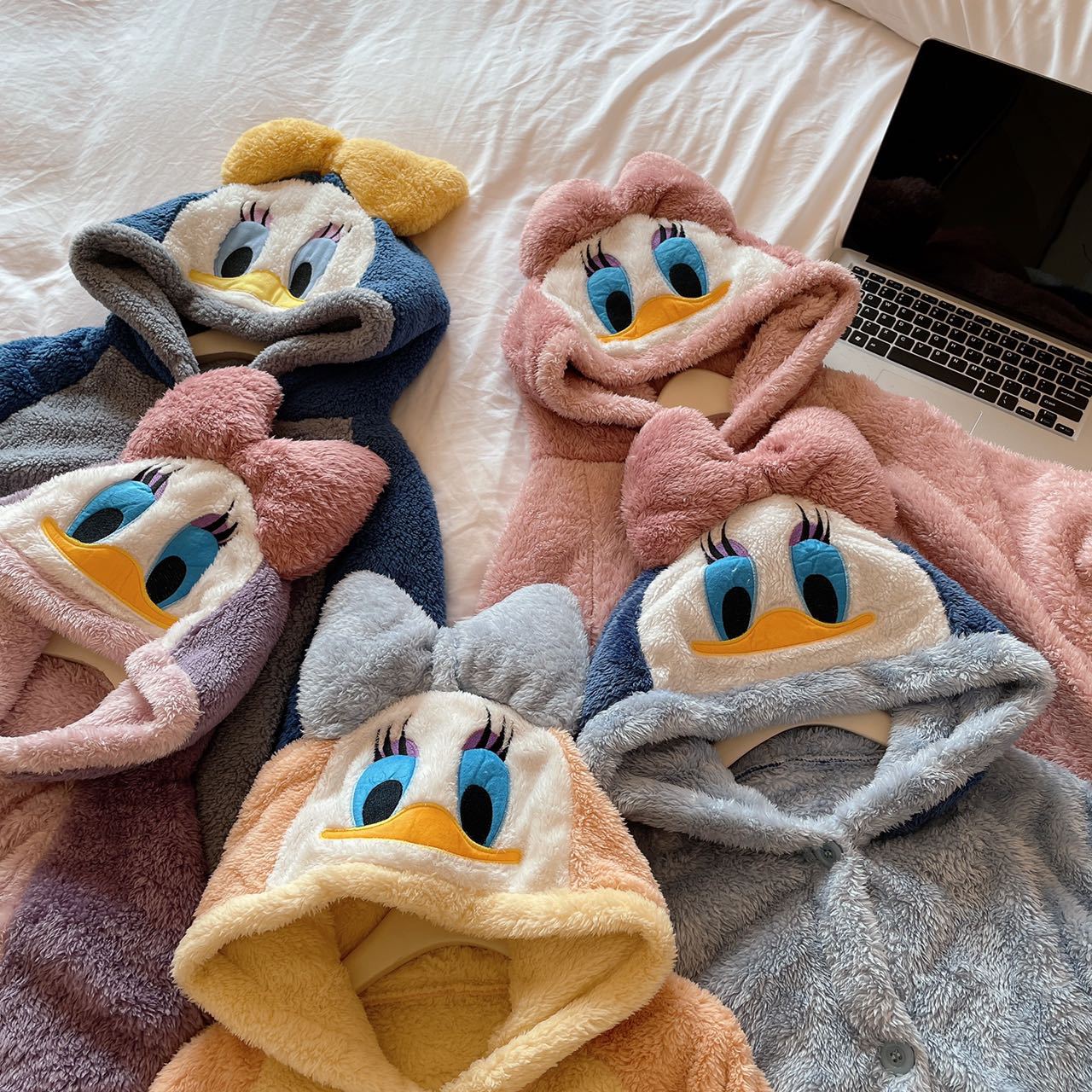 오리 잠옷 새로운 두꺼운 산호 양털 후드 잠옷 만화 겉옷 세트 따뜻한 부드러운 숙녀 가정 옷스토어 가기
