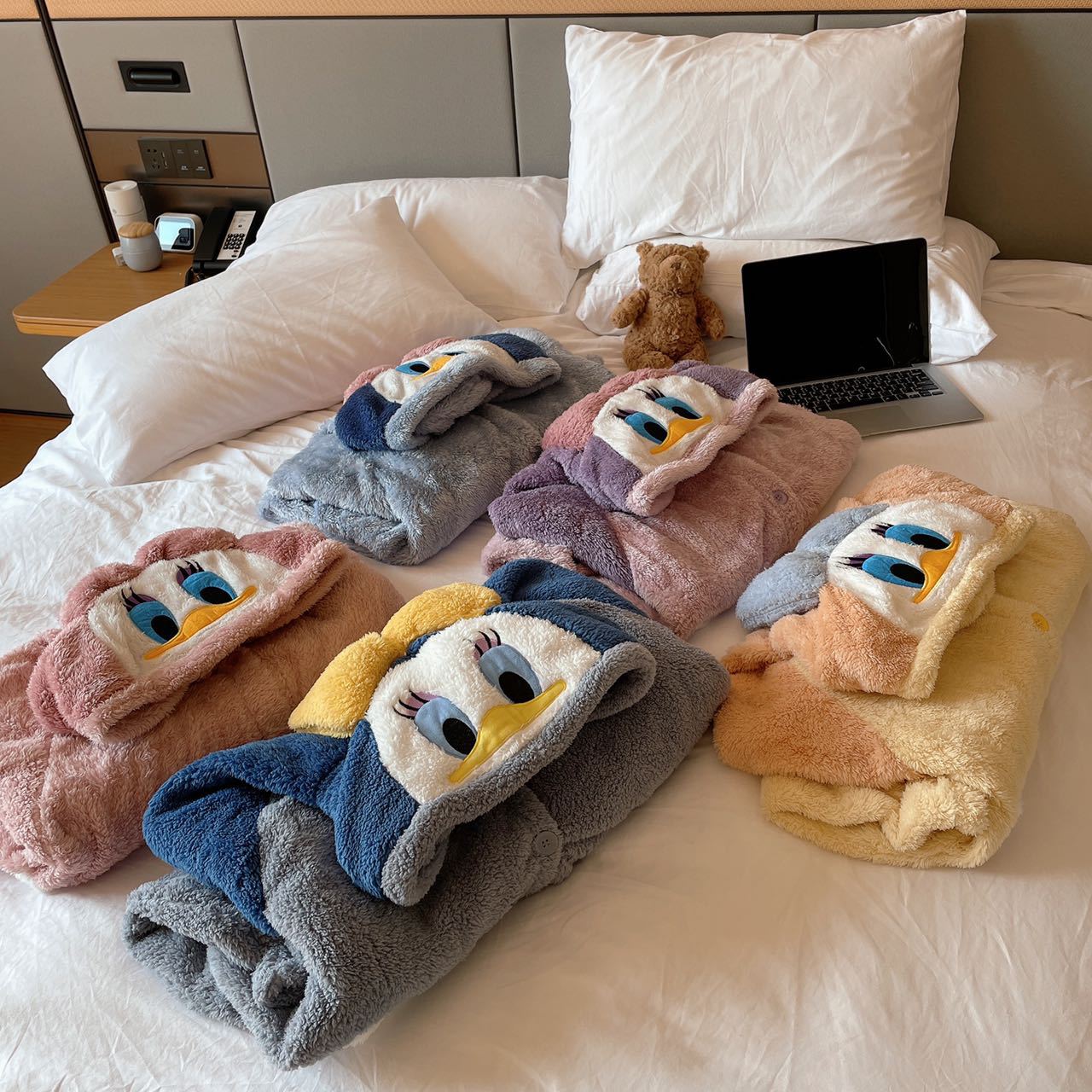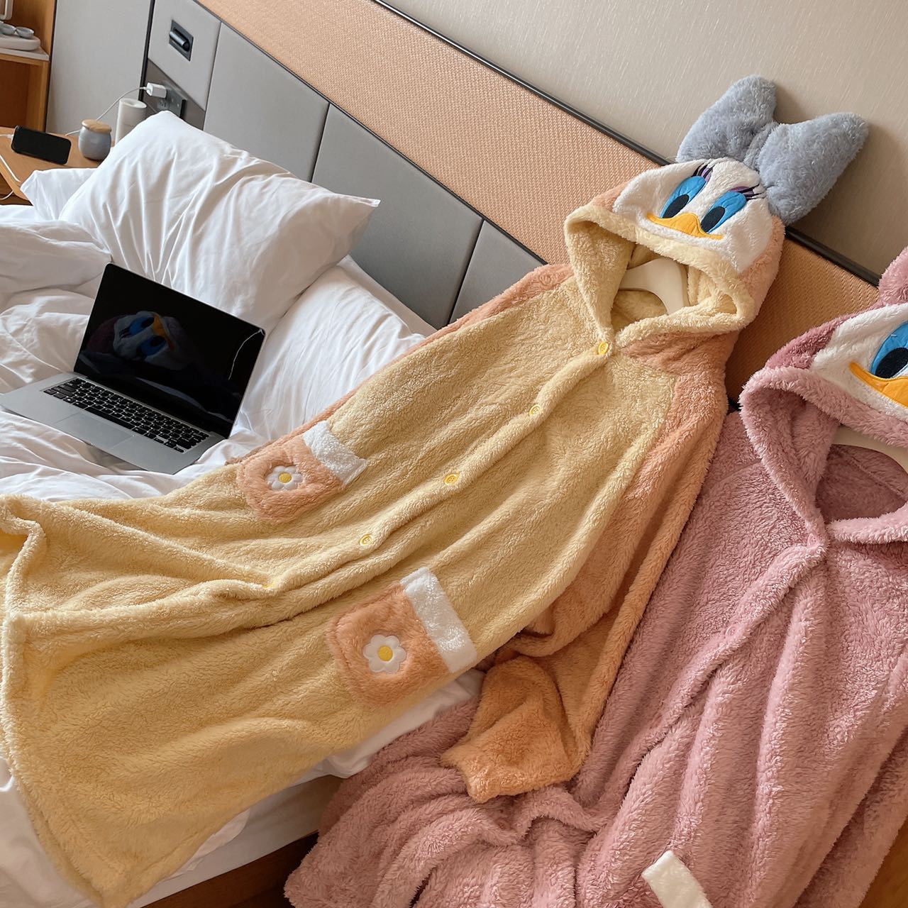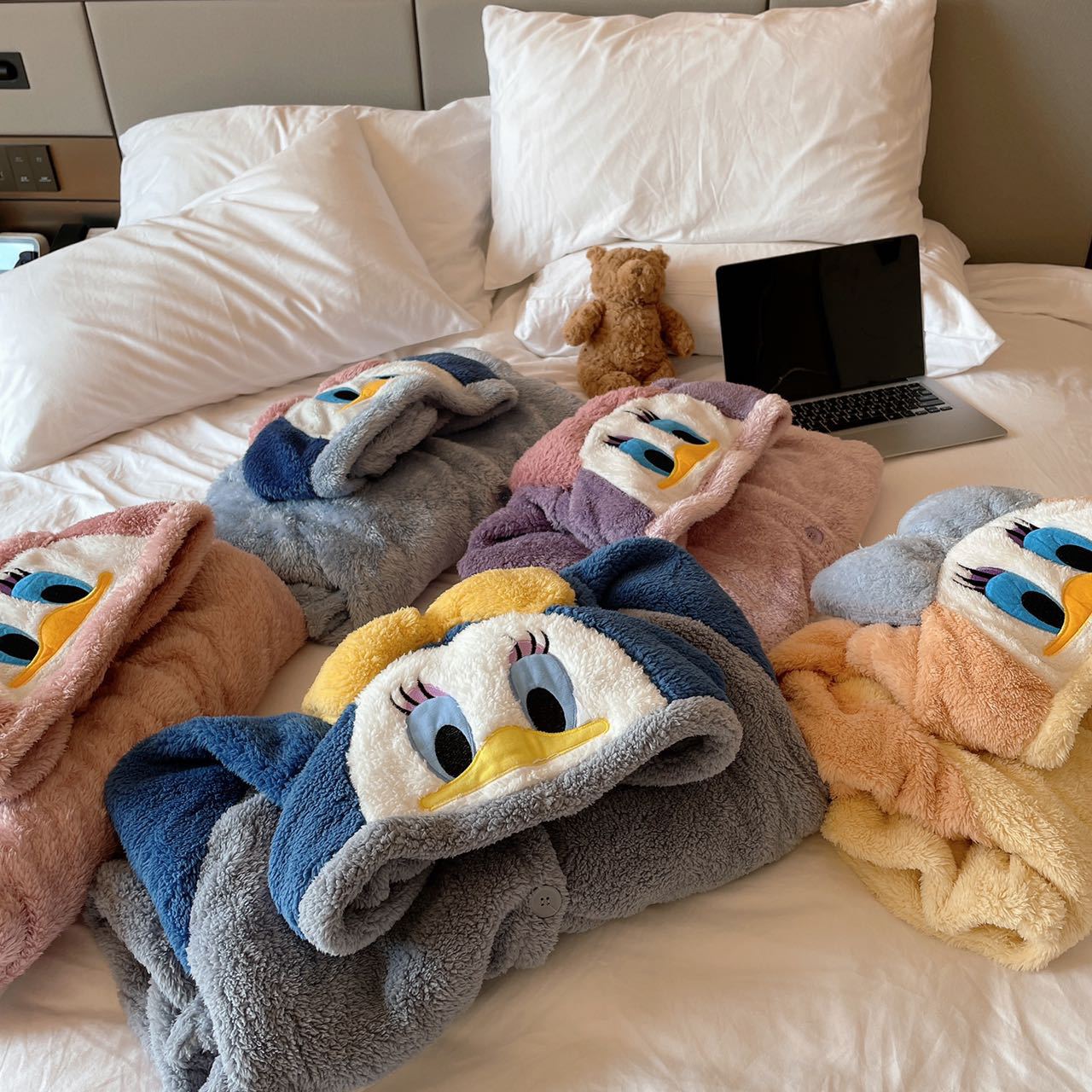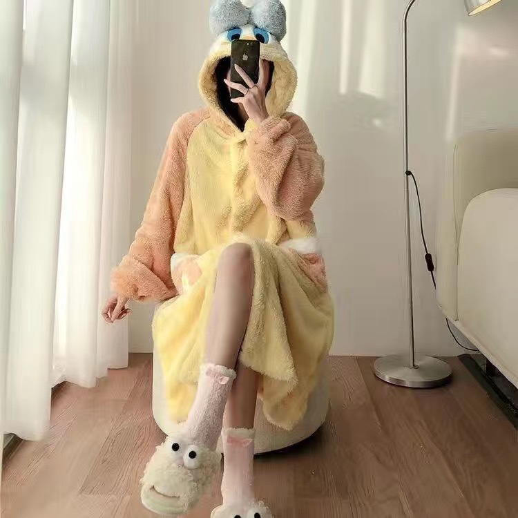 오리 잠옷 새로운 두꺼운 산호 양털 후드 잠옷 만화 겉옷 세트 따뜻한 부드러운 숙녀 가정 옷