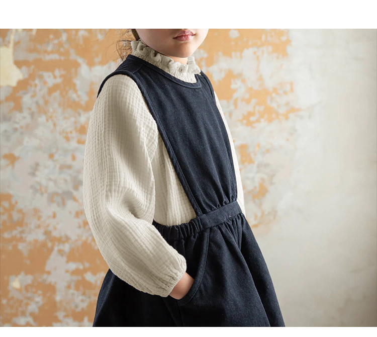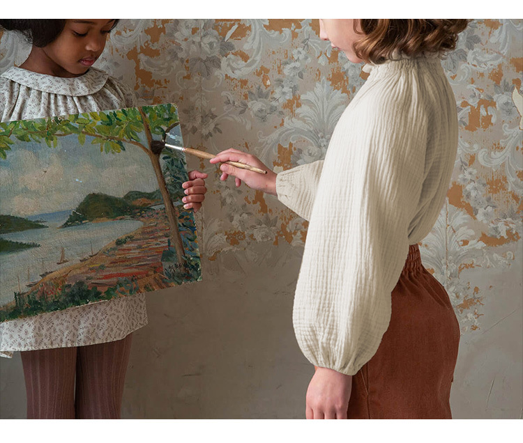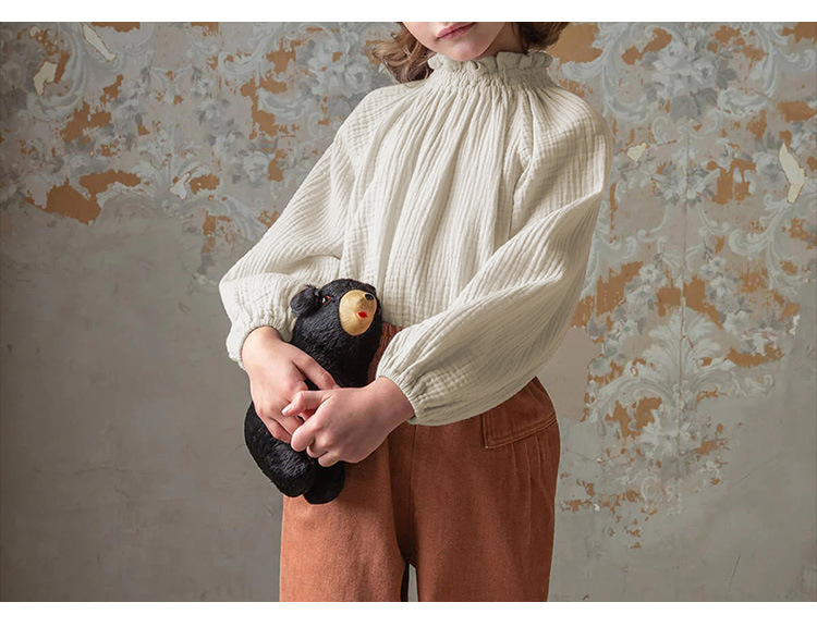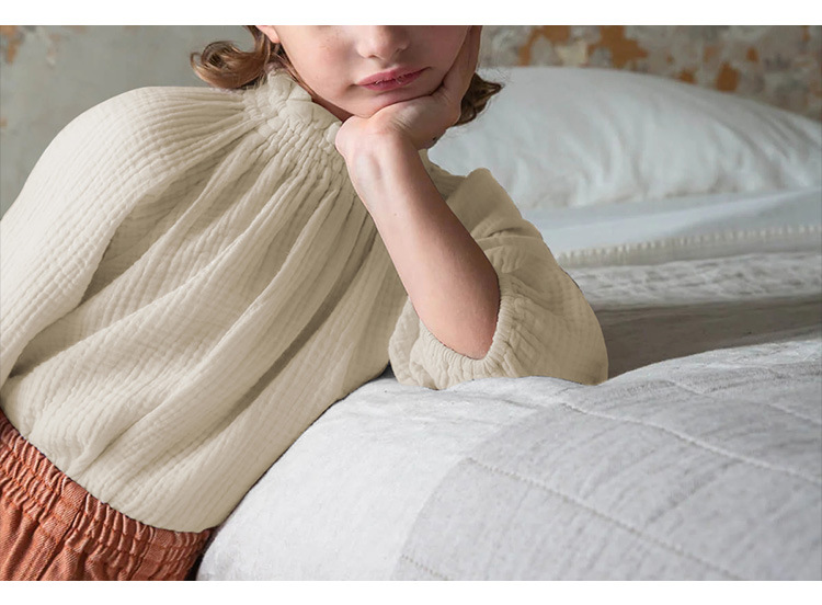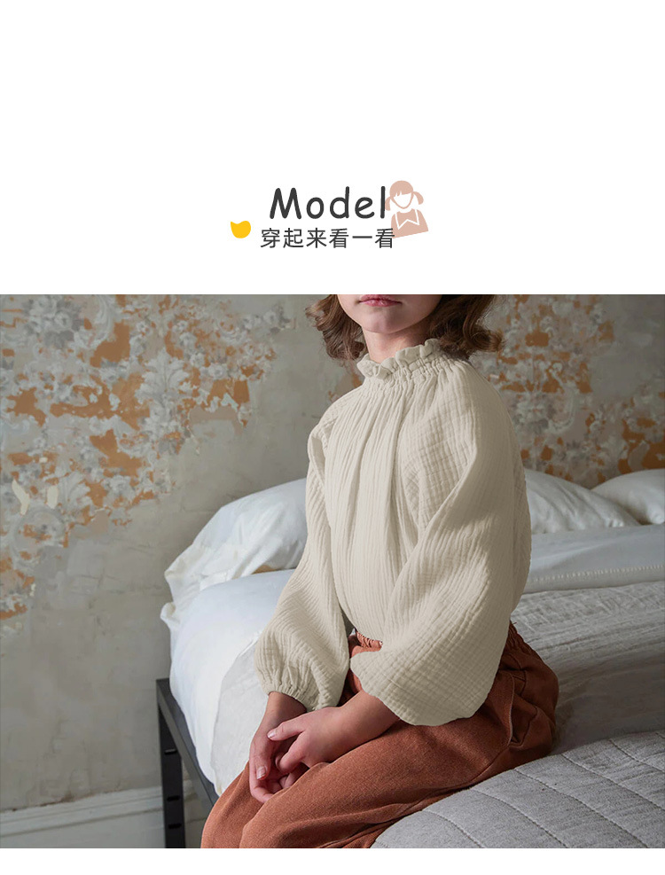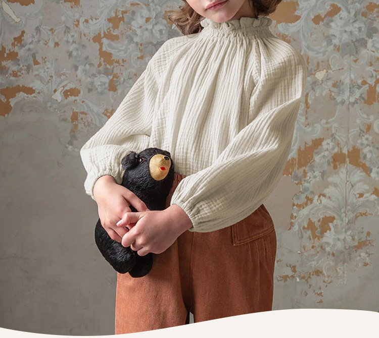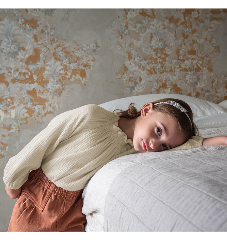 봄과 가을 새로운 어린이 셔츠 곰팡이 가장자리 풀오버 긴팔 탑 순수 코튼 더블 레이어 거즈 소녀를위한 피부 친화적 인 티셔츠