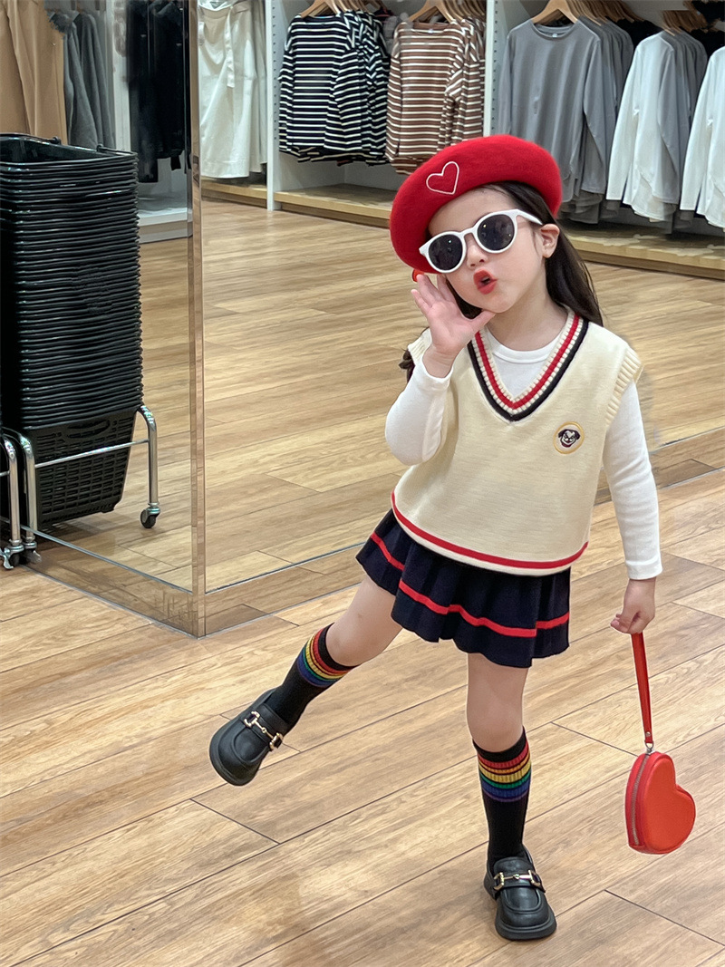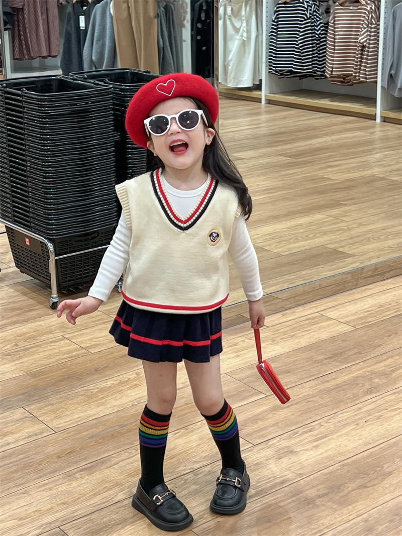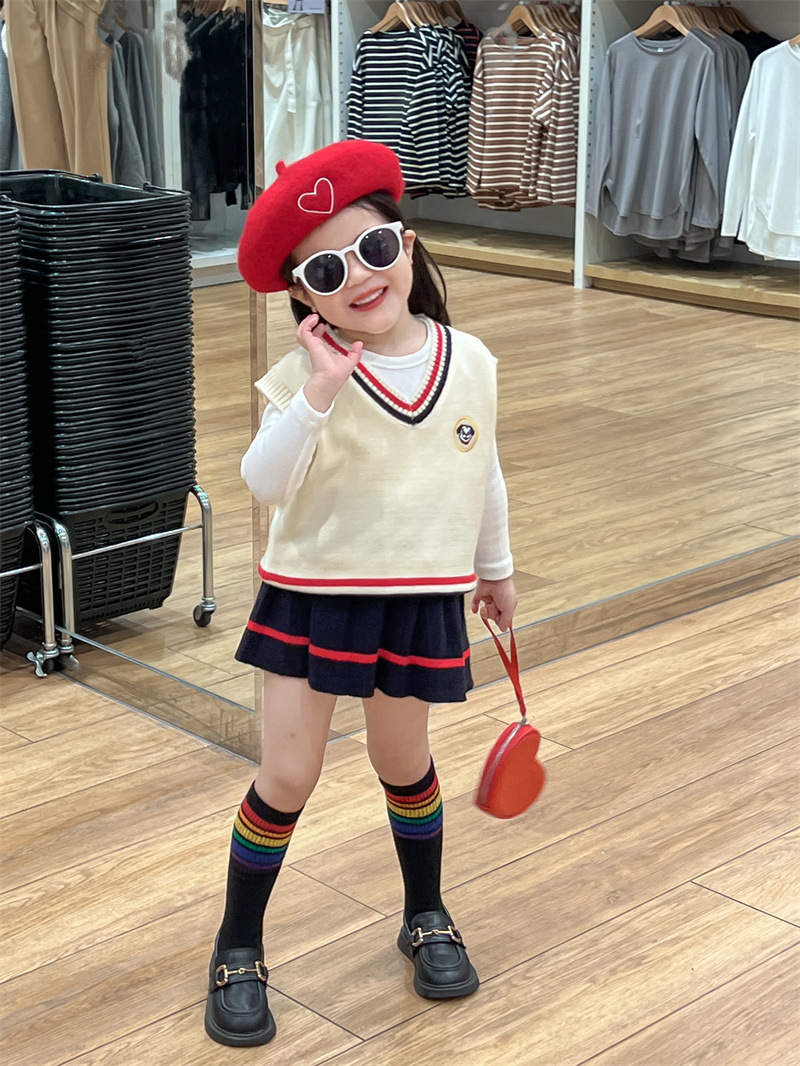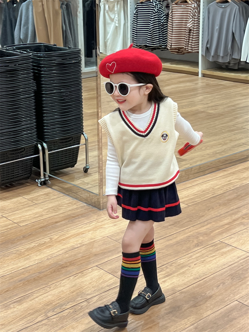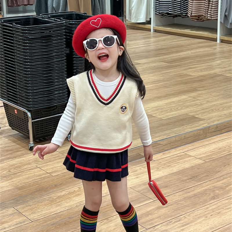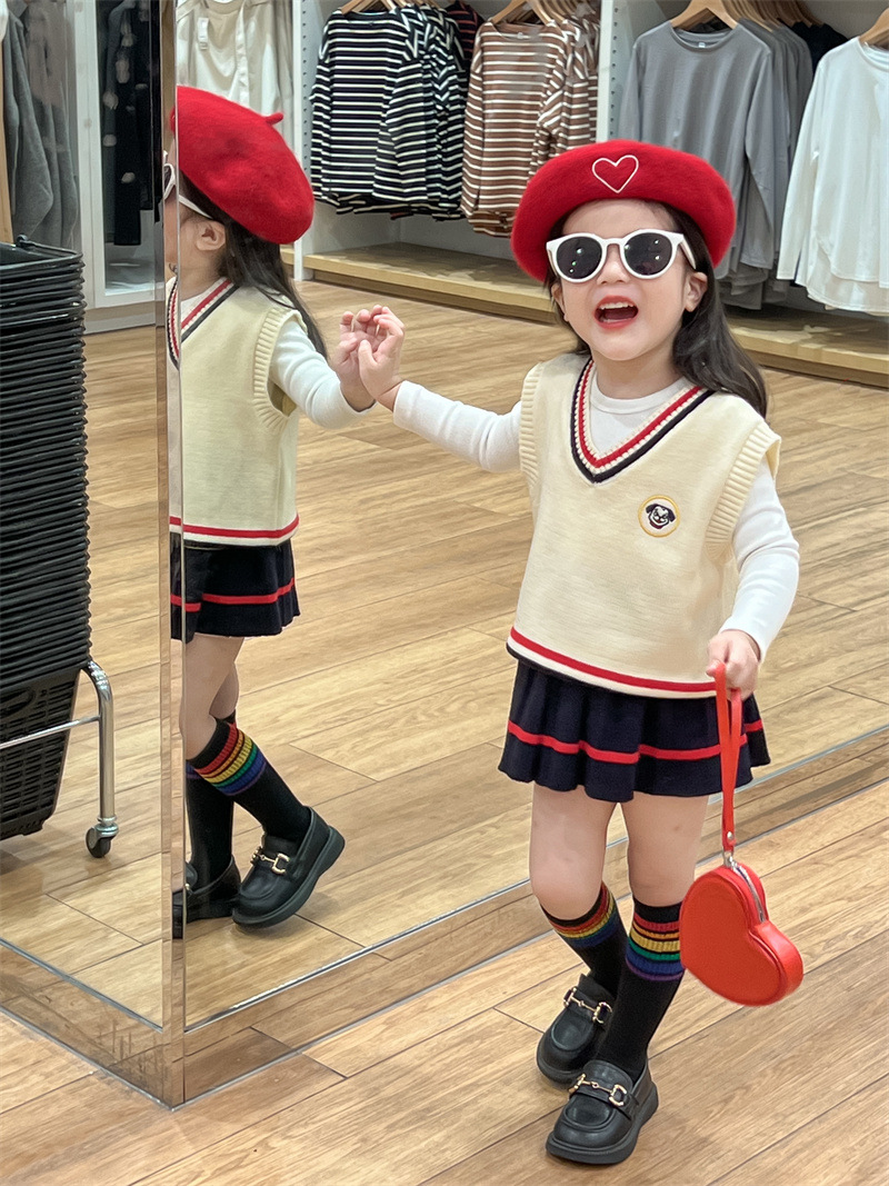 한국 스타일 여아 대학 스타일 V-넥 조끼 원피스 2023 새로운 가을 어린이 니트 조끼 스커트 투피스 원피스스토어 가기
