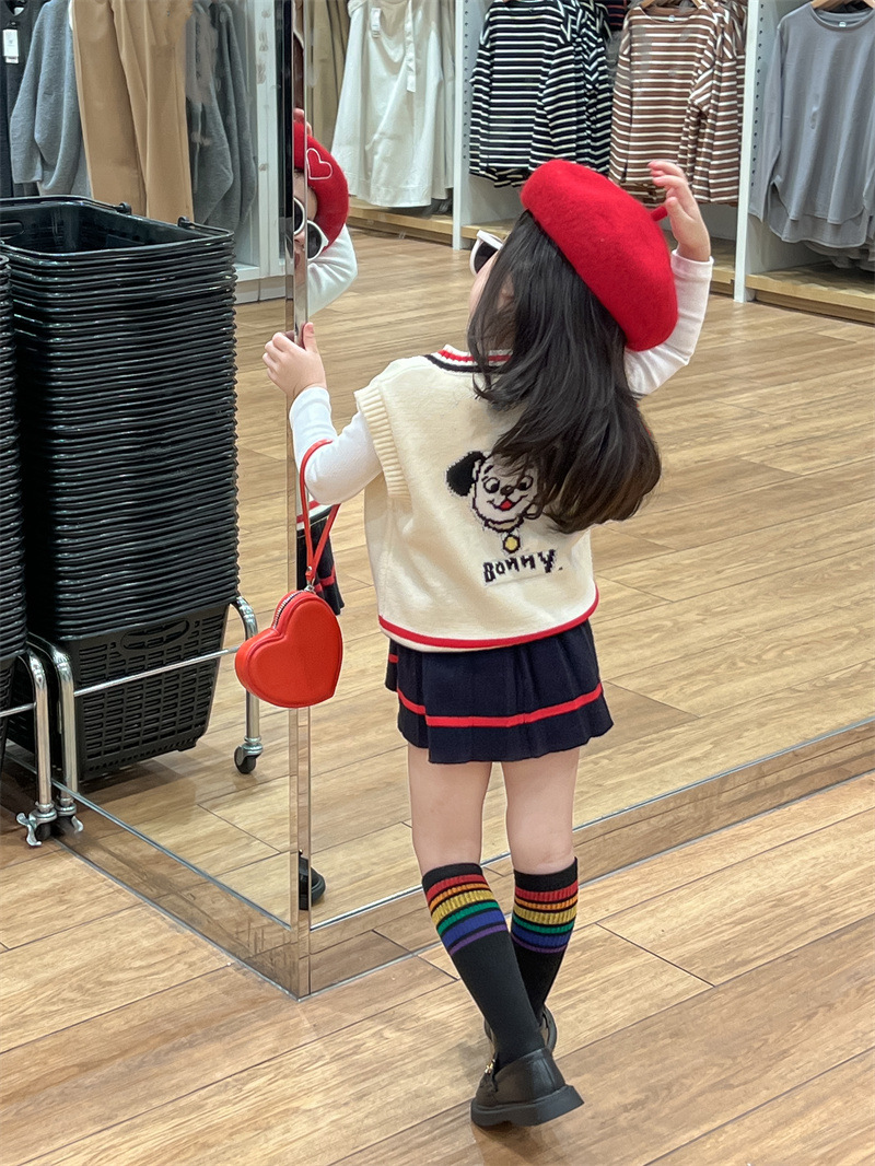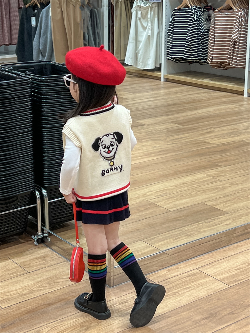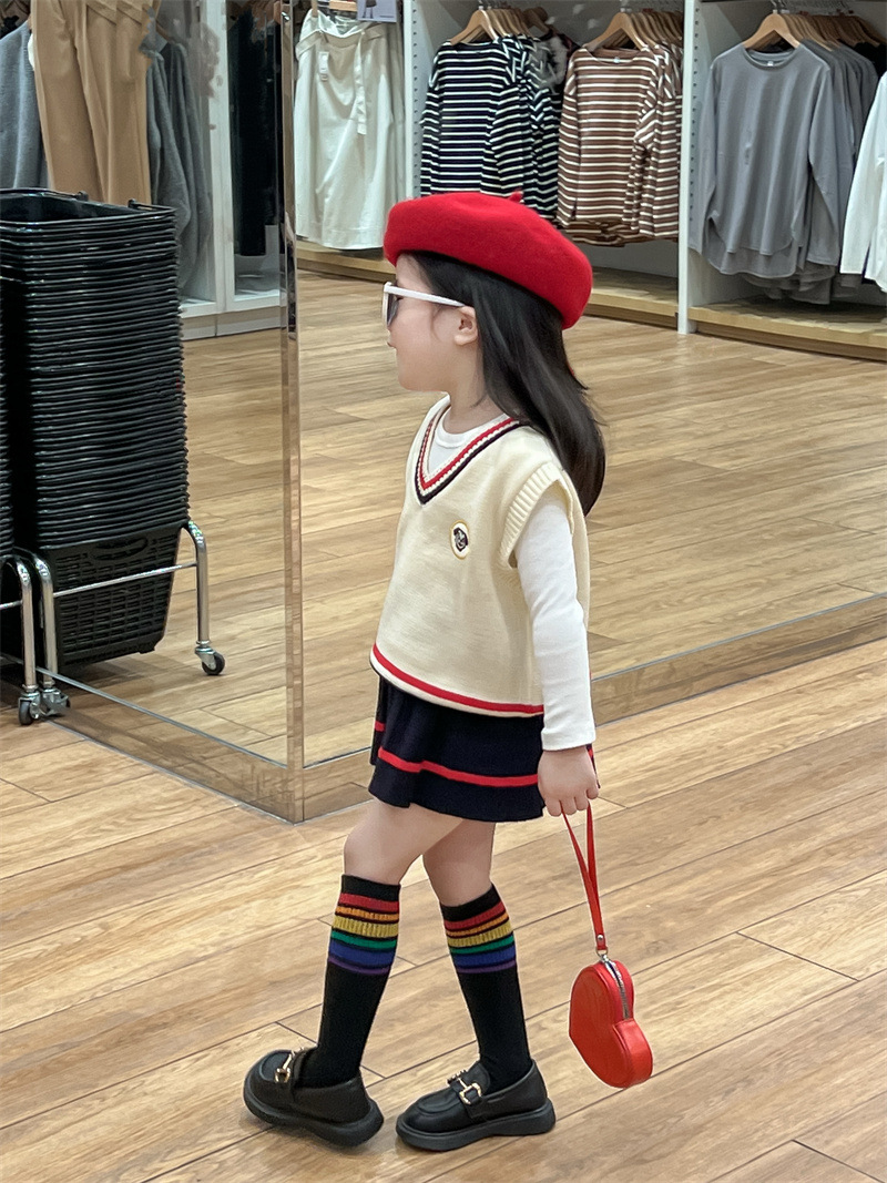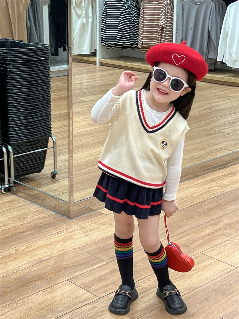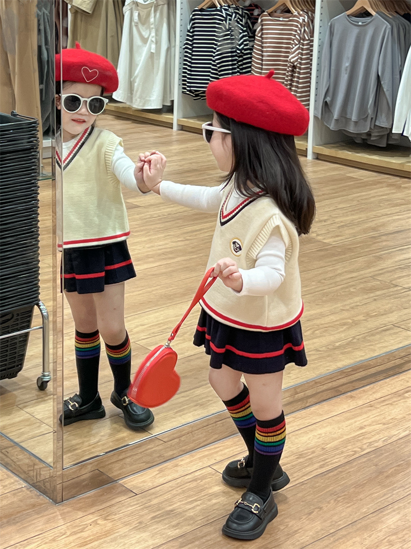 한국 스타일 여아 대학 스타일 V-넥 조끼 원피스 2023 새로운 가을 어린이 니트 조끼 스커트 투피스 원피스스토어 가기