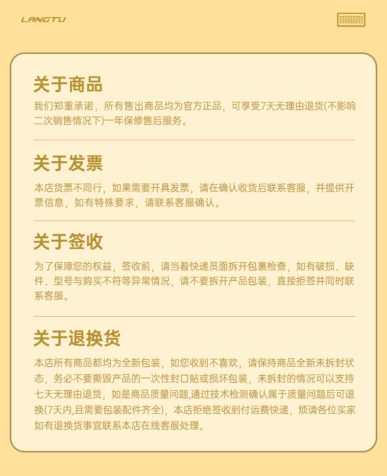可提供售前售后服务:国内外产品素材包,免费贴箱唛,免费赠送运费险,7天内无理由退货(运费顾客自己承担),15天内包换(质量问题我们承担运费),15到30天内(非人为损坏一人一半运费),1年内保修(非人为损坏运费顾客自己承担),最快24小时发货,一年保修等等,有需要的老板可联系客服了解详情。