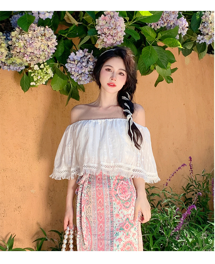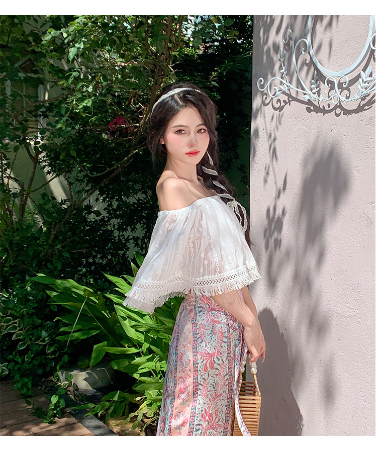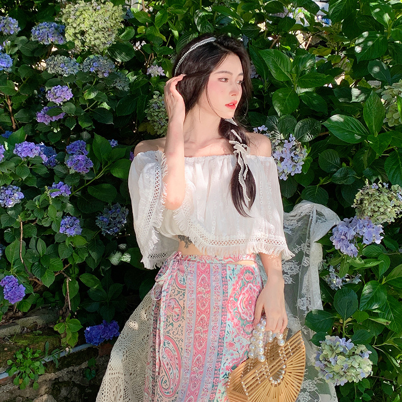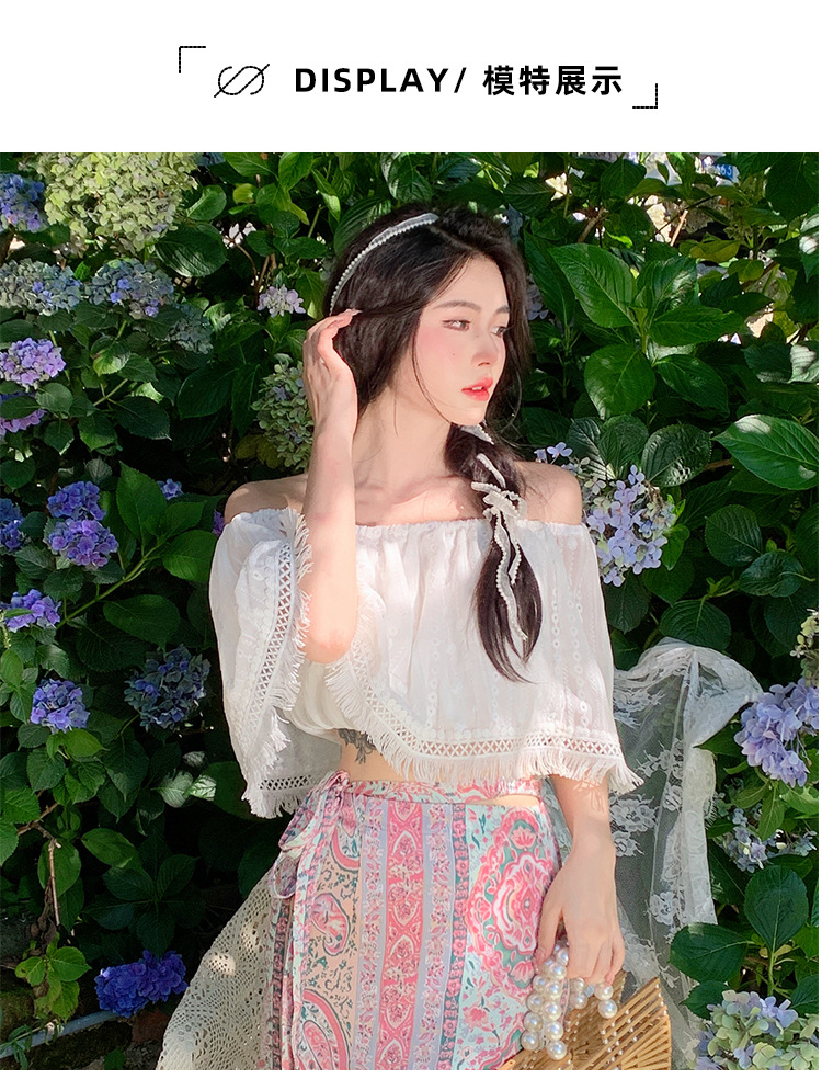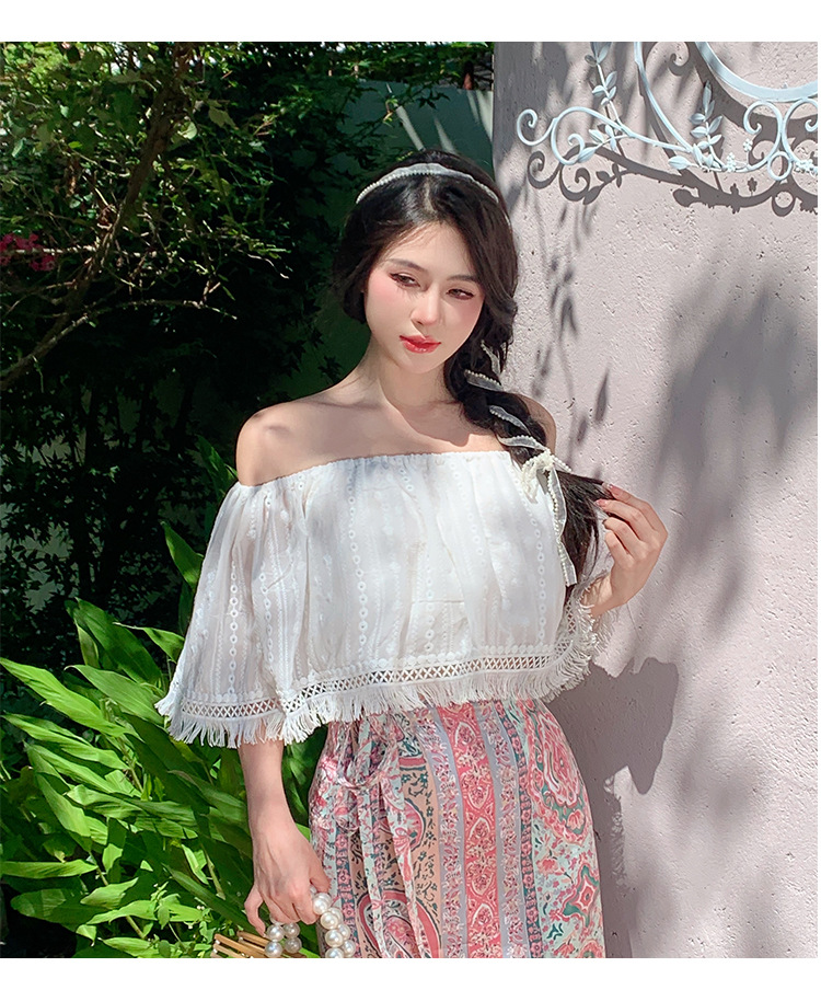 프랑스 스타일 오프 숄더 쉬폰 셔츠 여성용 2023 여름 짧은 보헤미안 탑 세련된 세련된 술 셔츠