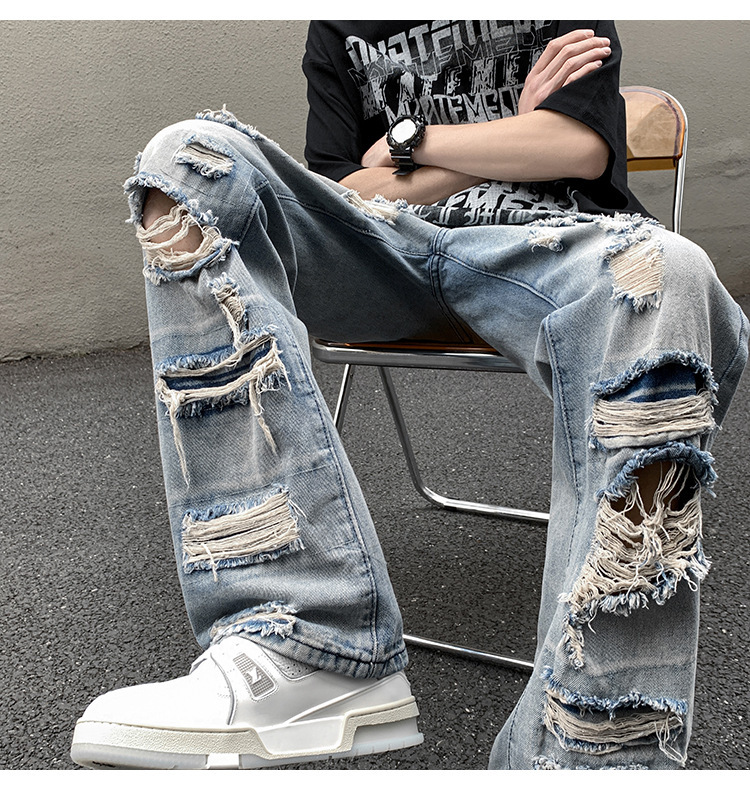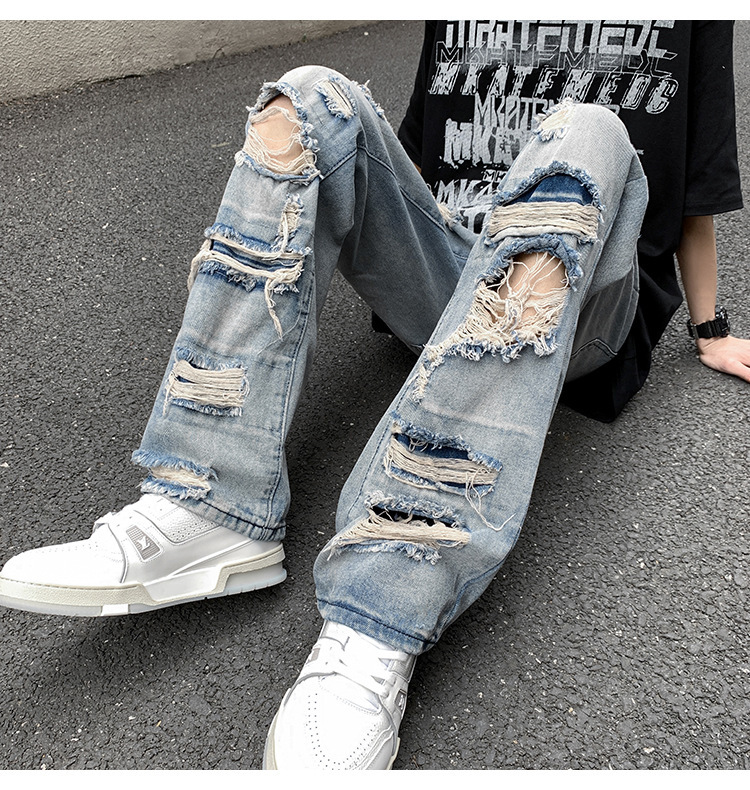 유럽과 미국의 하이 스트리트 분위기 바지 남자의 여름 씻어 찢어진 청바지 특대 스트레이트 바지 크롭 거지 바지스토어 가기