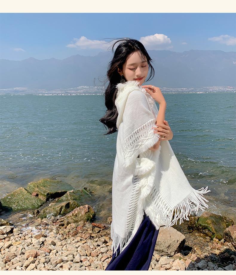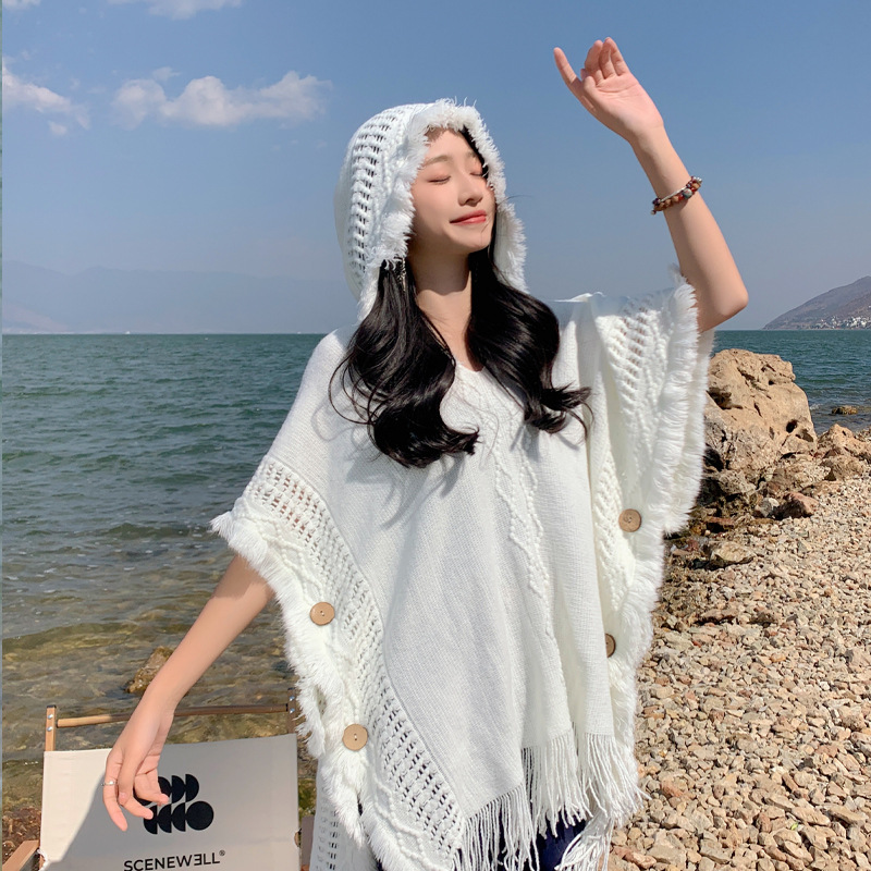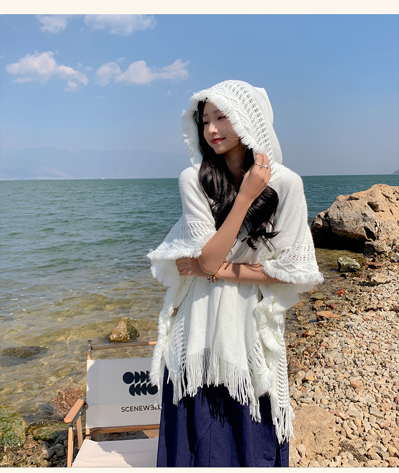 보헤미안 에스닉 스타일 후드 니트웨어 술 따뜻한 후드 여행 카드 사진 터틀넥 숄 케이프