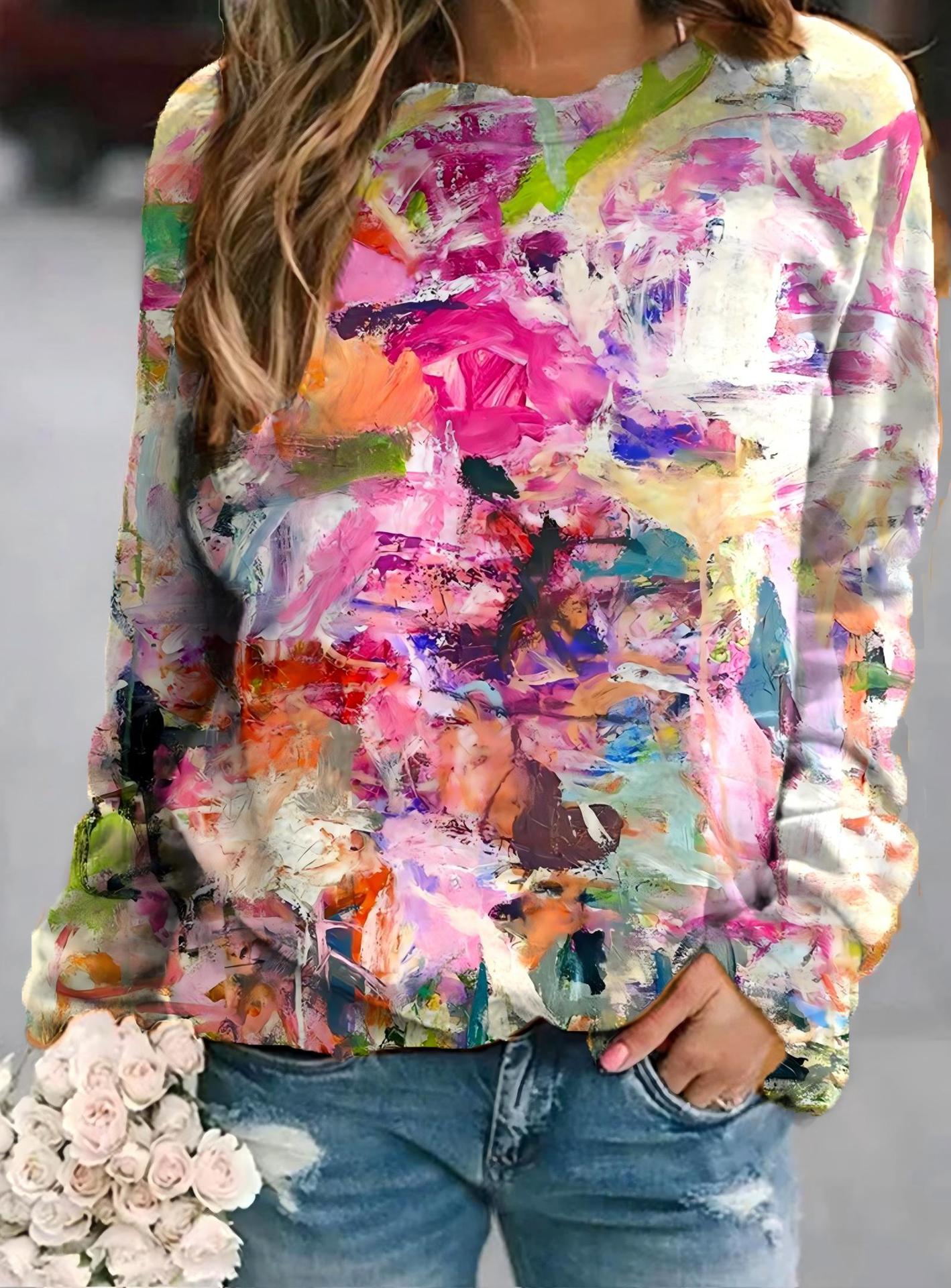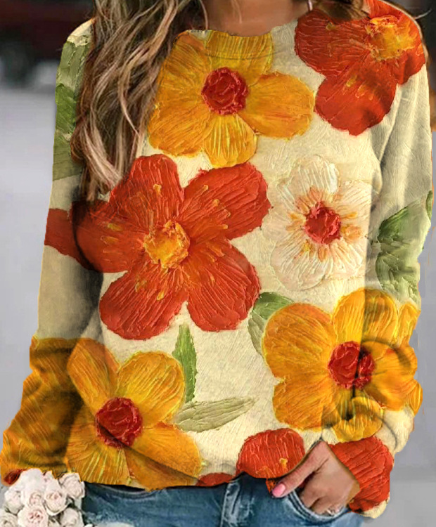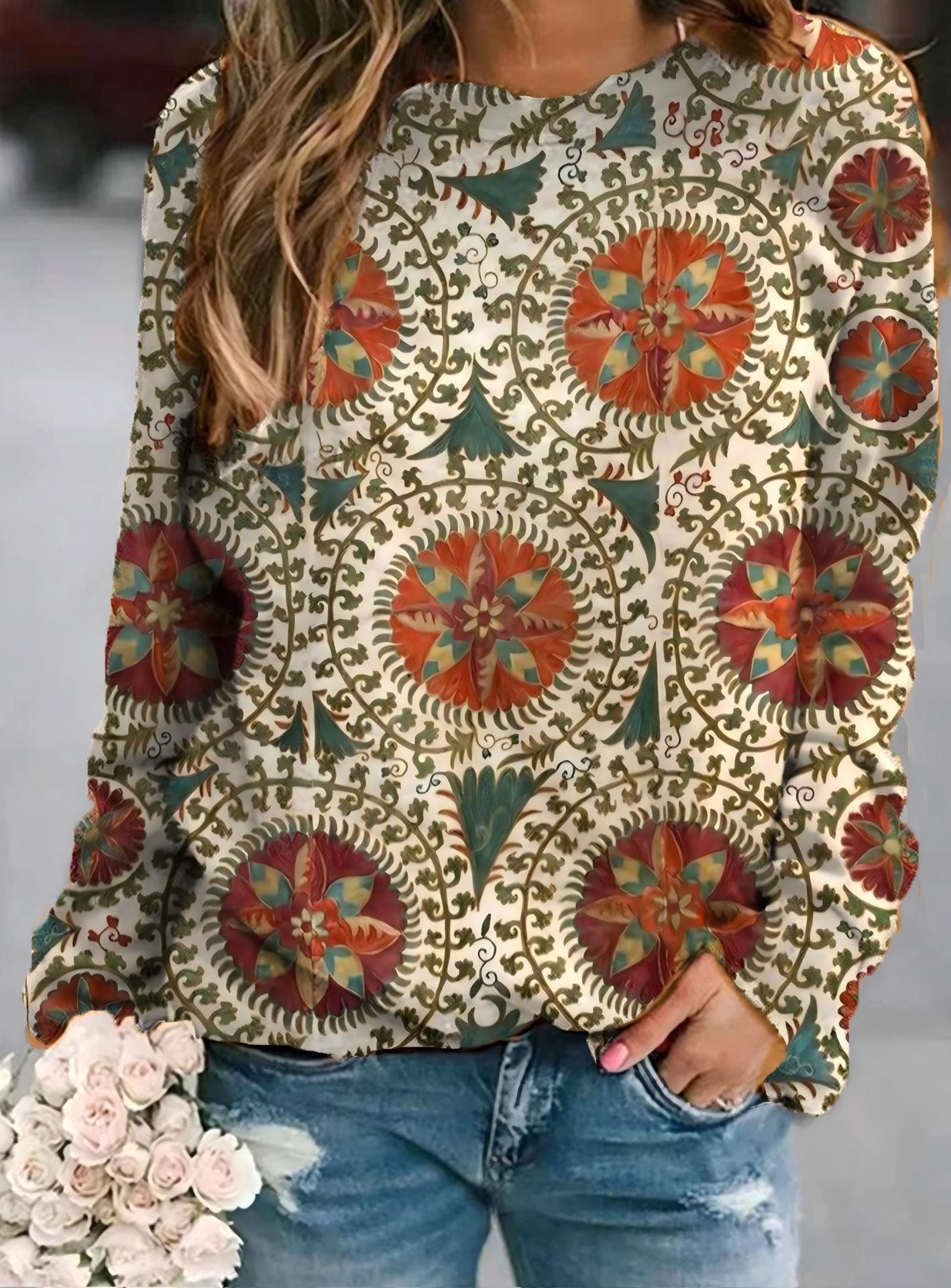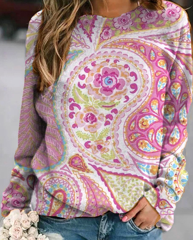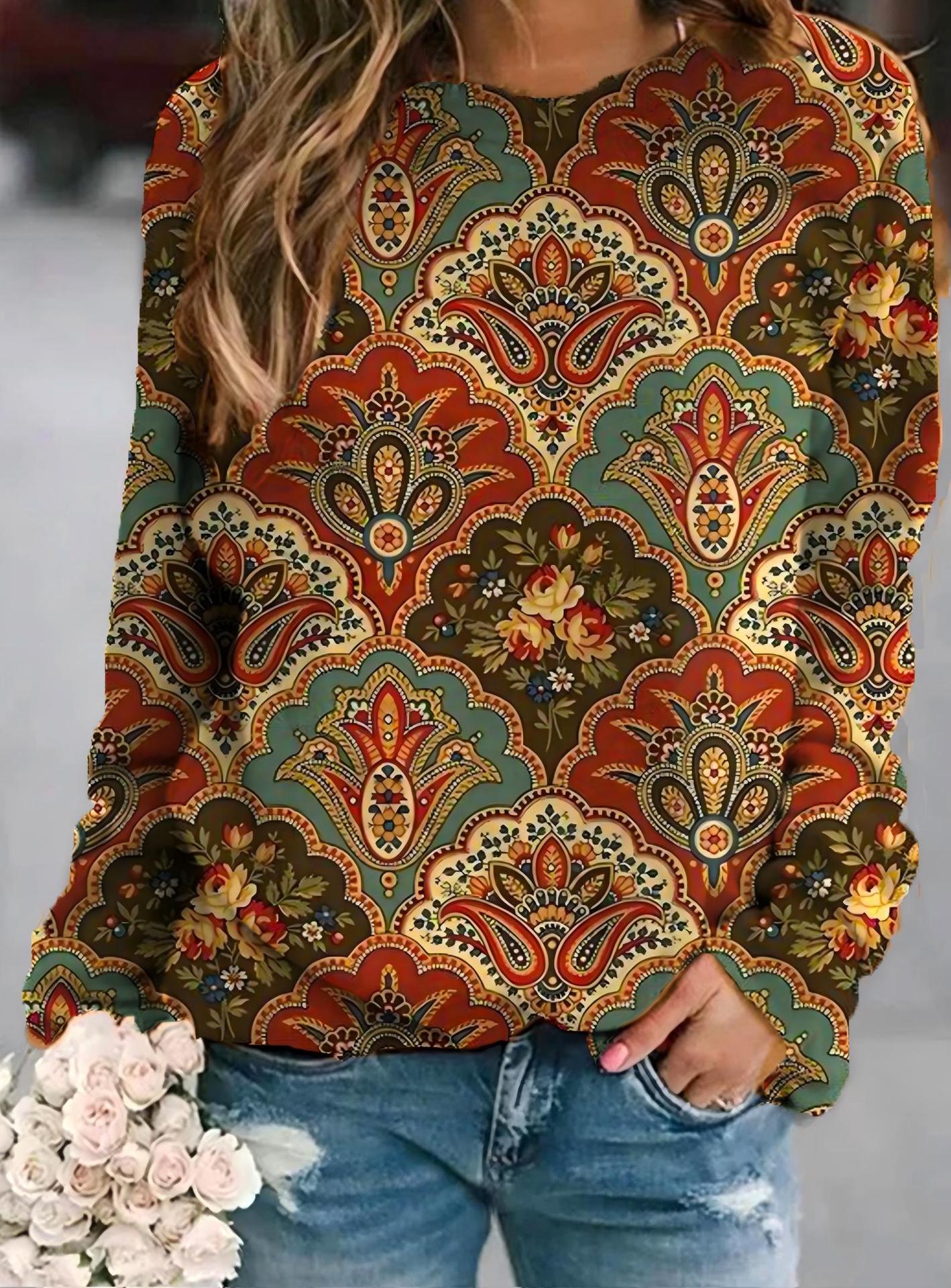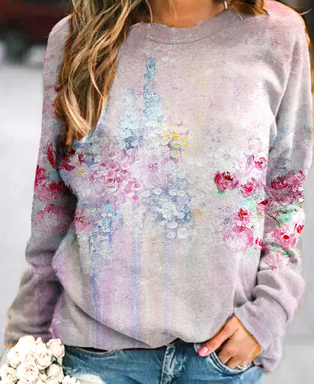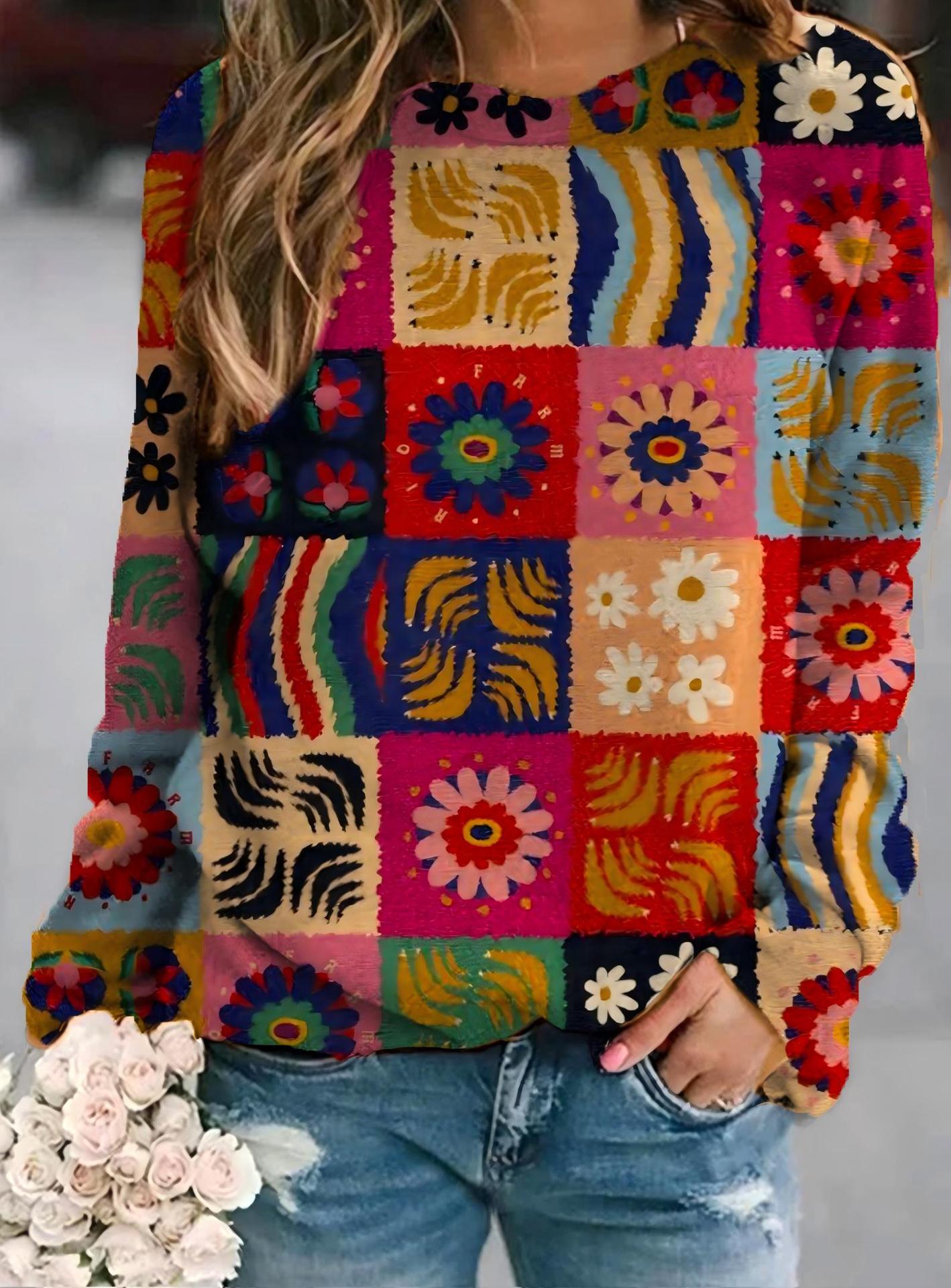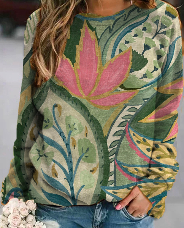 2022 아마존 AliExpress WISH 국경을 넘는 유럽과 미국의 새로운 꽃 인쇄 둥근 목 긴 소매 스웨터 여성 의류