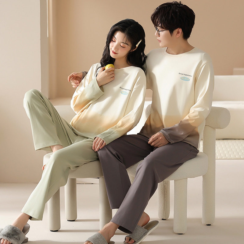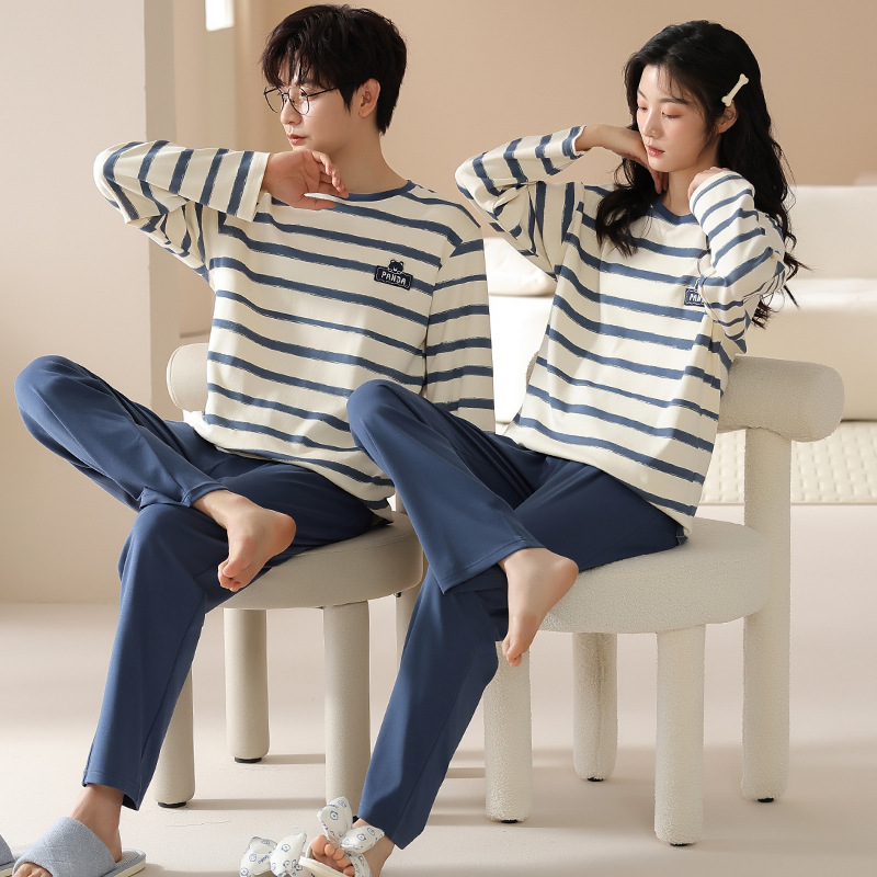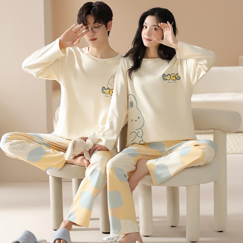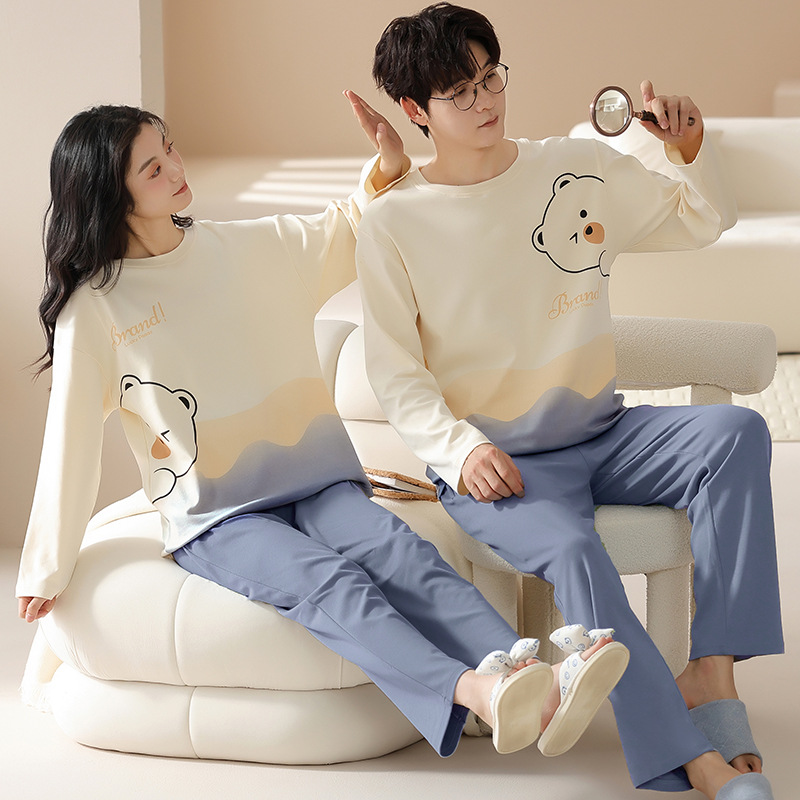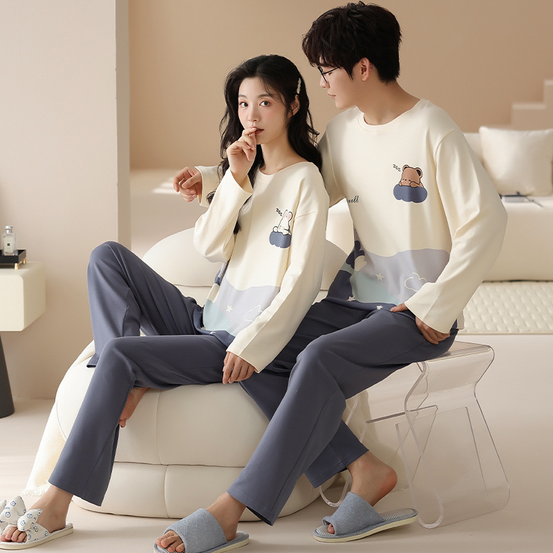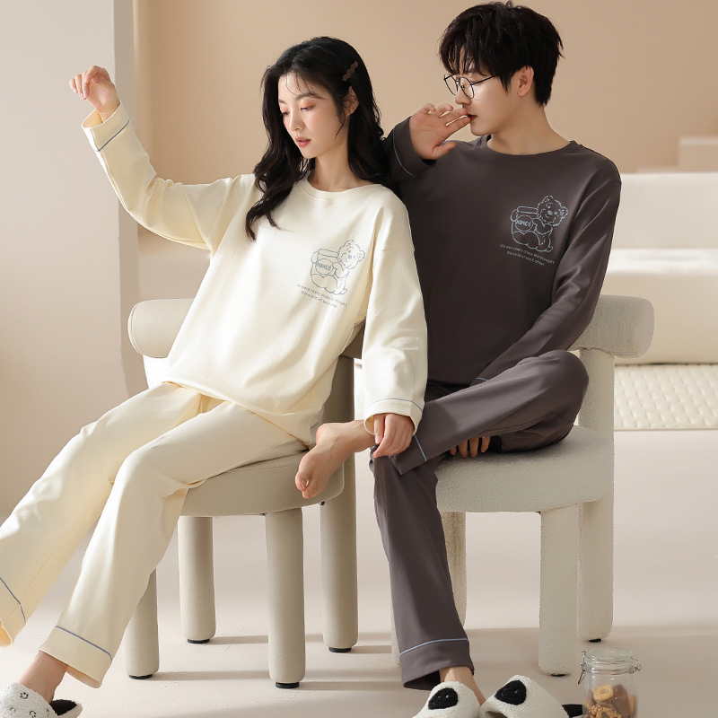 봄과 가을 커플 잠옷 긴팔 양면 순면 크루넥 신혼 부부 집 귀여운 만화 프린트를 입고스토어 가기