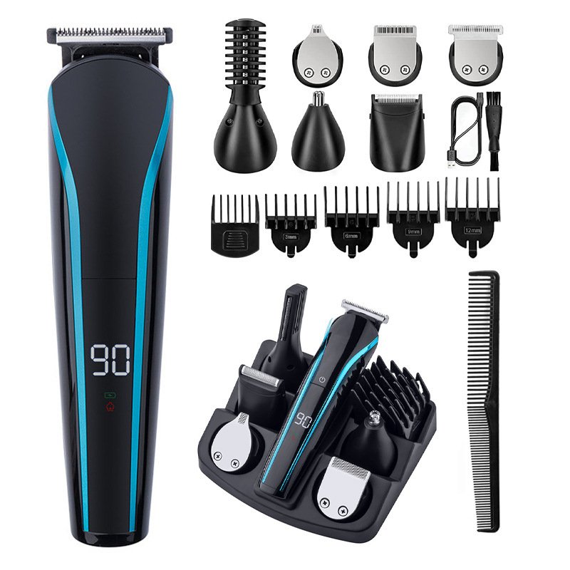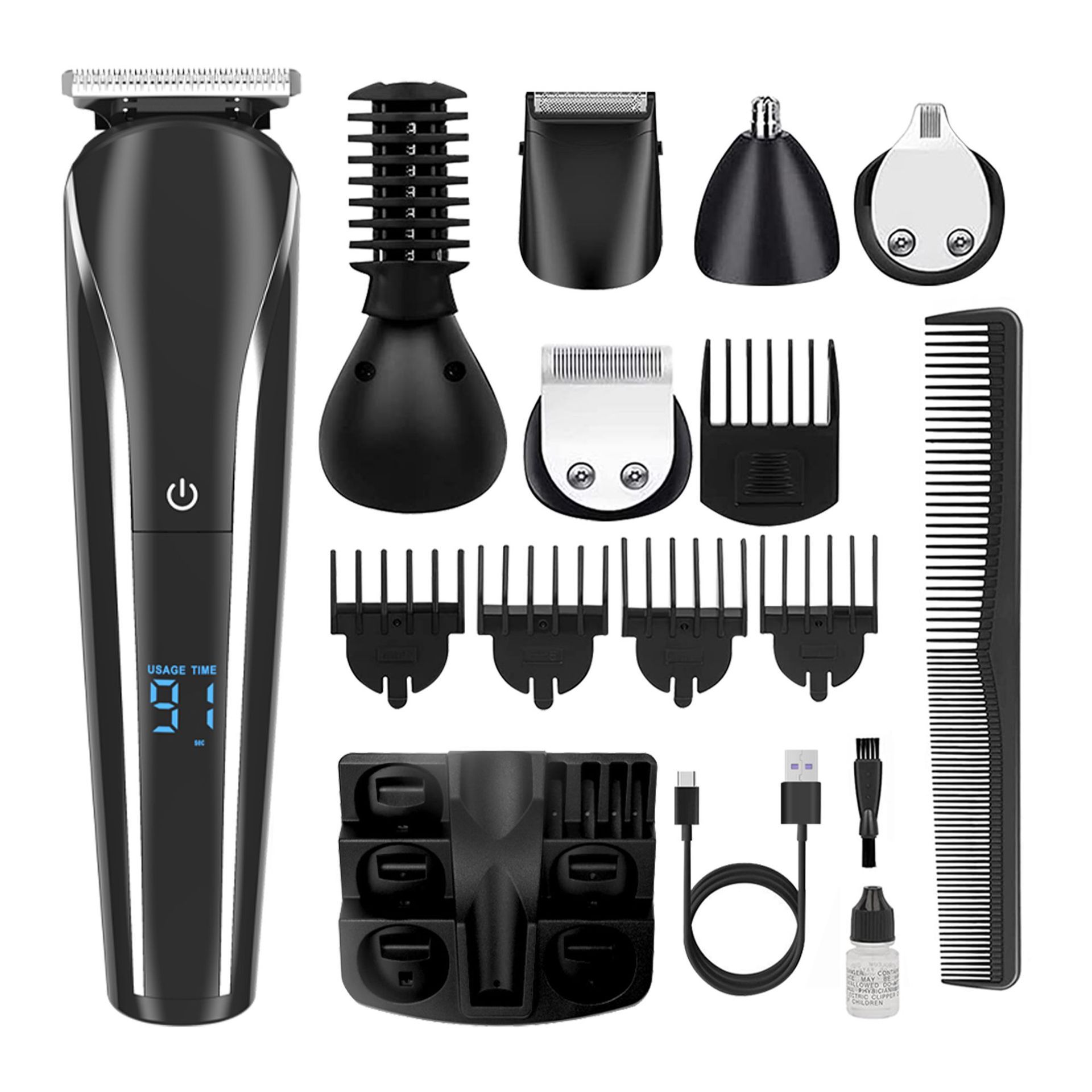 附件:收纳盒、T型刀、U型刀、鼻毛修剪器、剃须刀、刻字刀、剃毛刀、清洁刷、油瓶、USB线、限位梳(3/6/9/12MM)