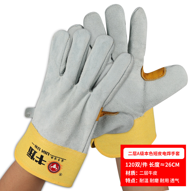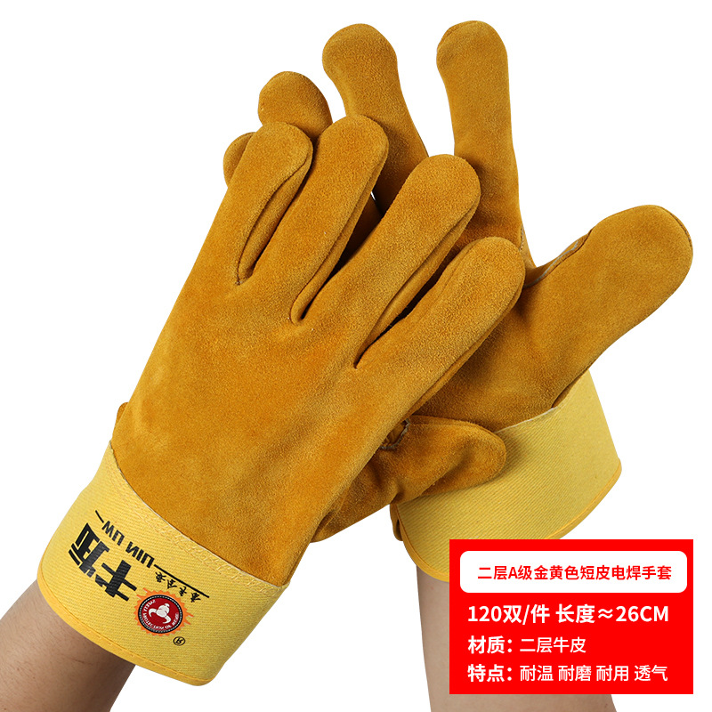 용접 장갑 2 층 소가죽 내마모성 단열 보호 노동 보호 고온 내성 튀김 방지 짧은 용접기 장갑 도매