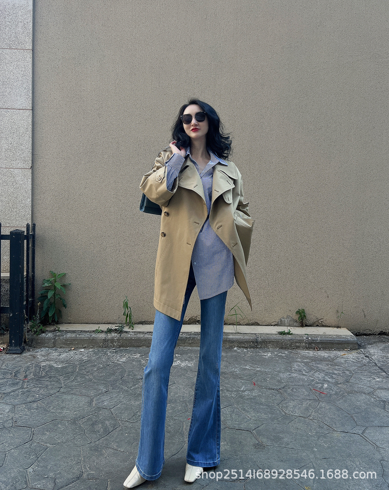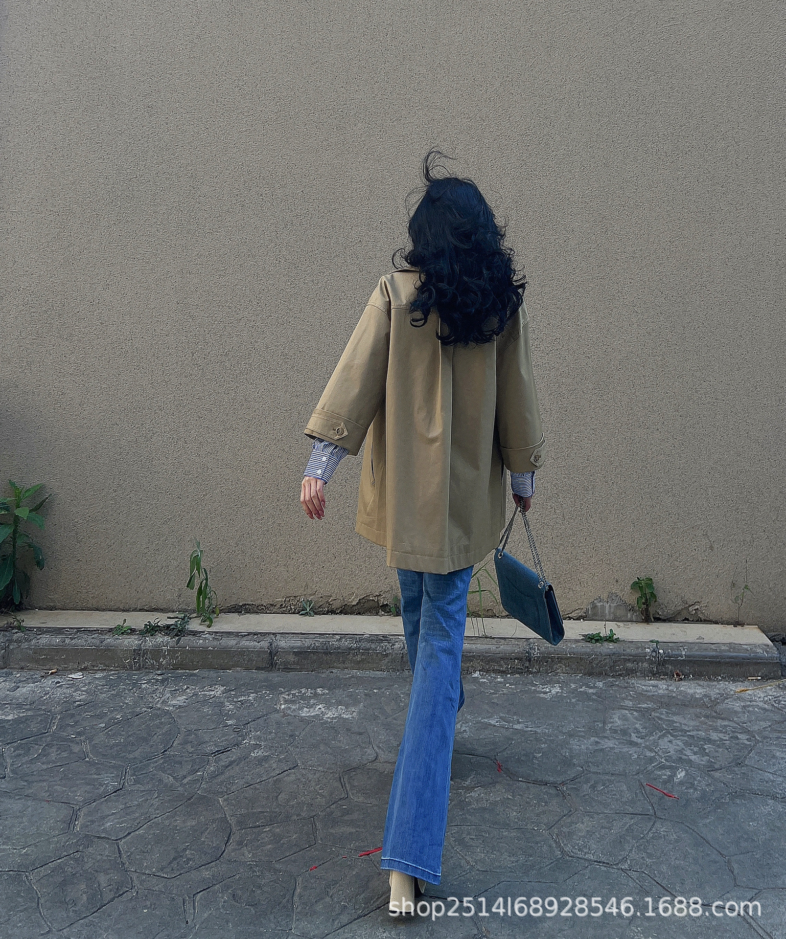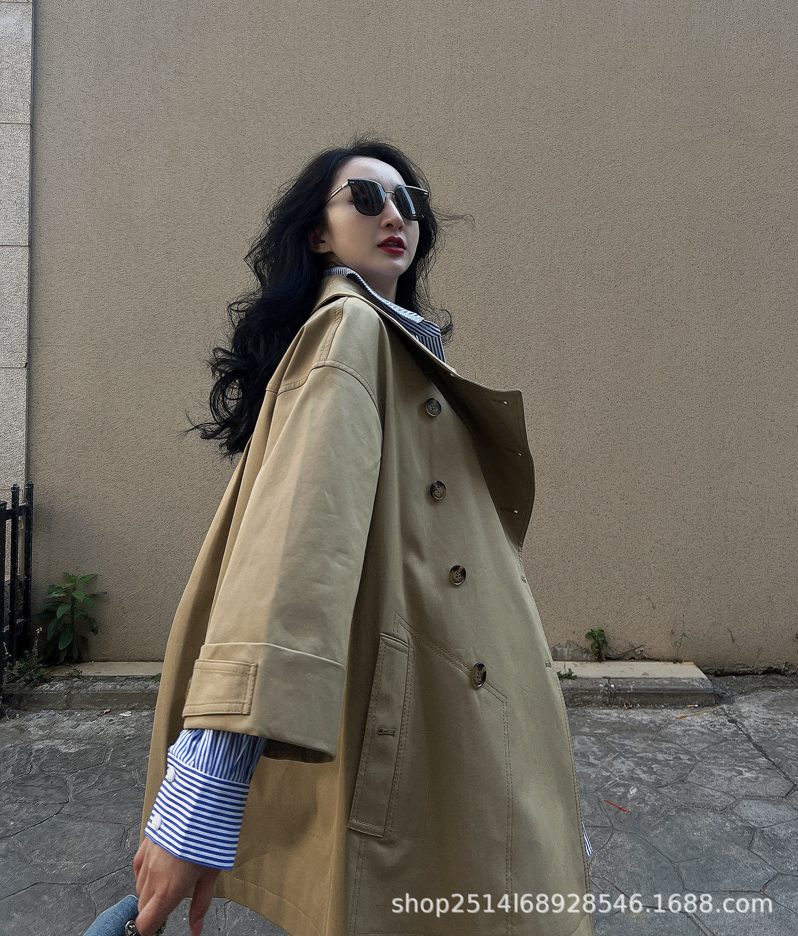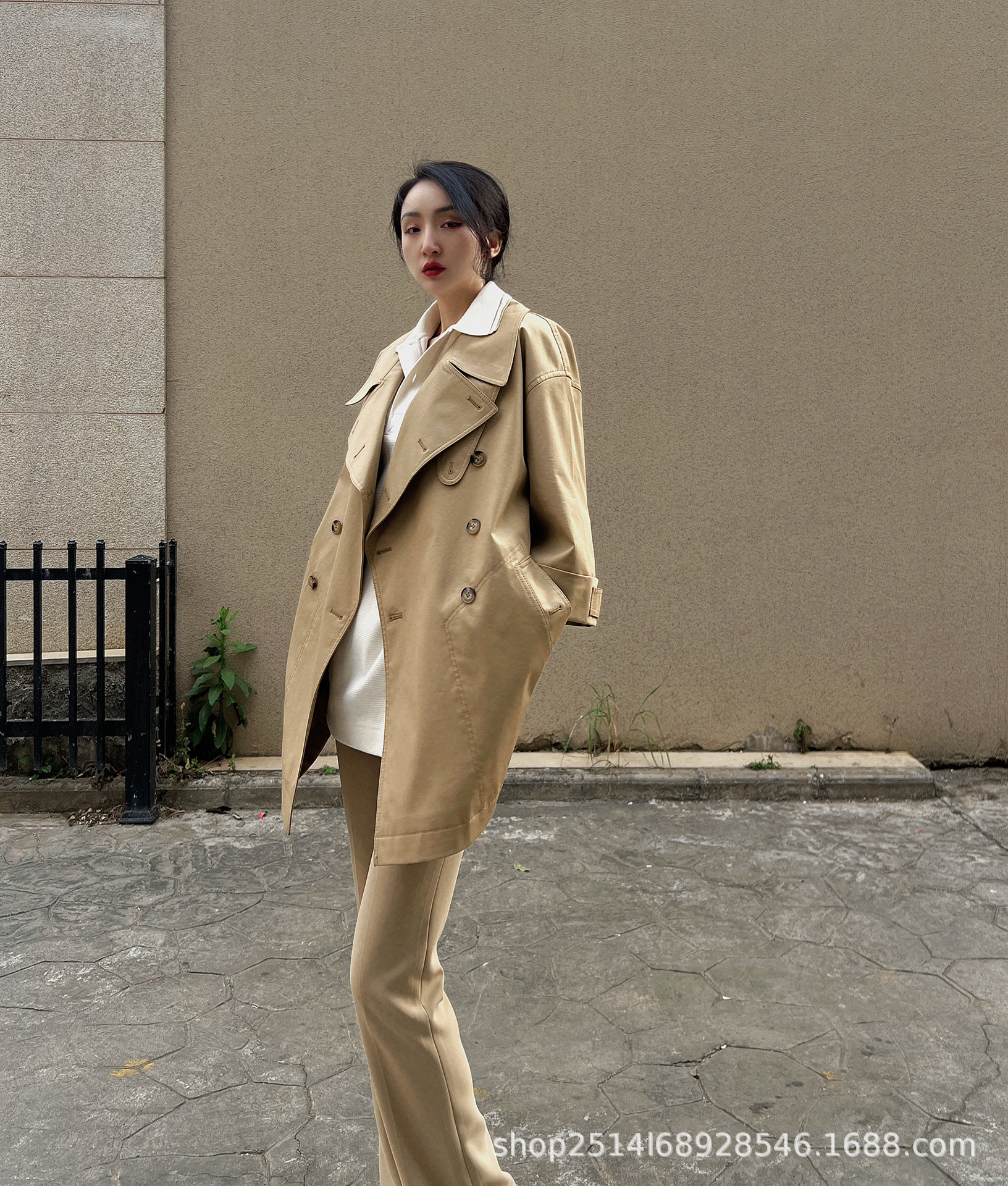 제가 새롭게 출시한 여성복 2024 가을 신상 카키색 라지 라펠 루즈핏 미디 기장 윈드브레이커 9부 소매 코트스토어 가기