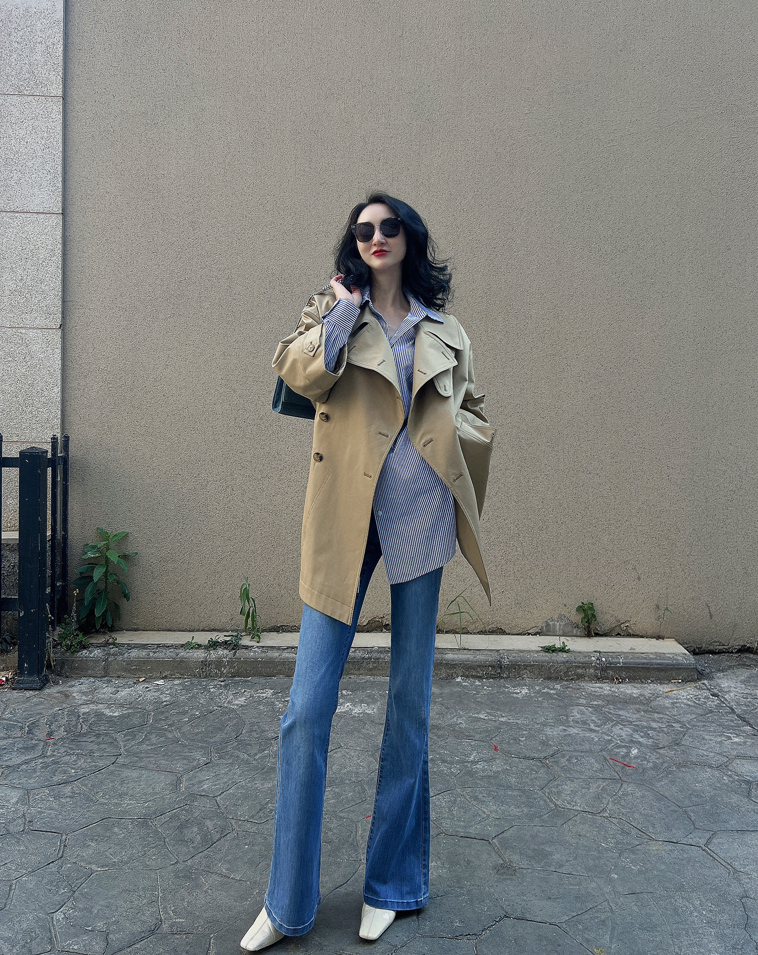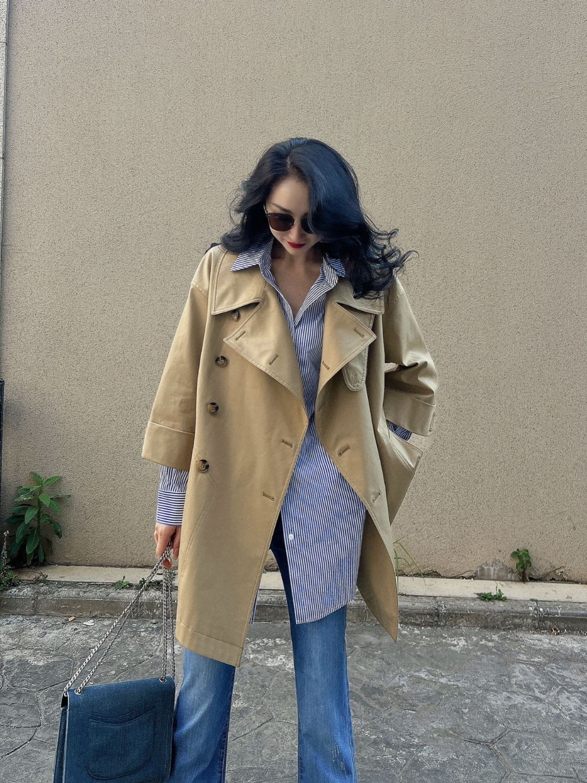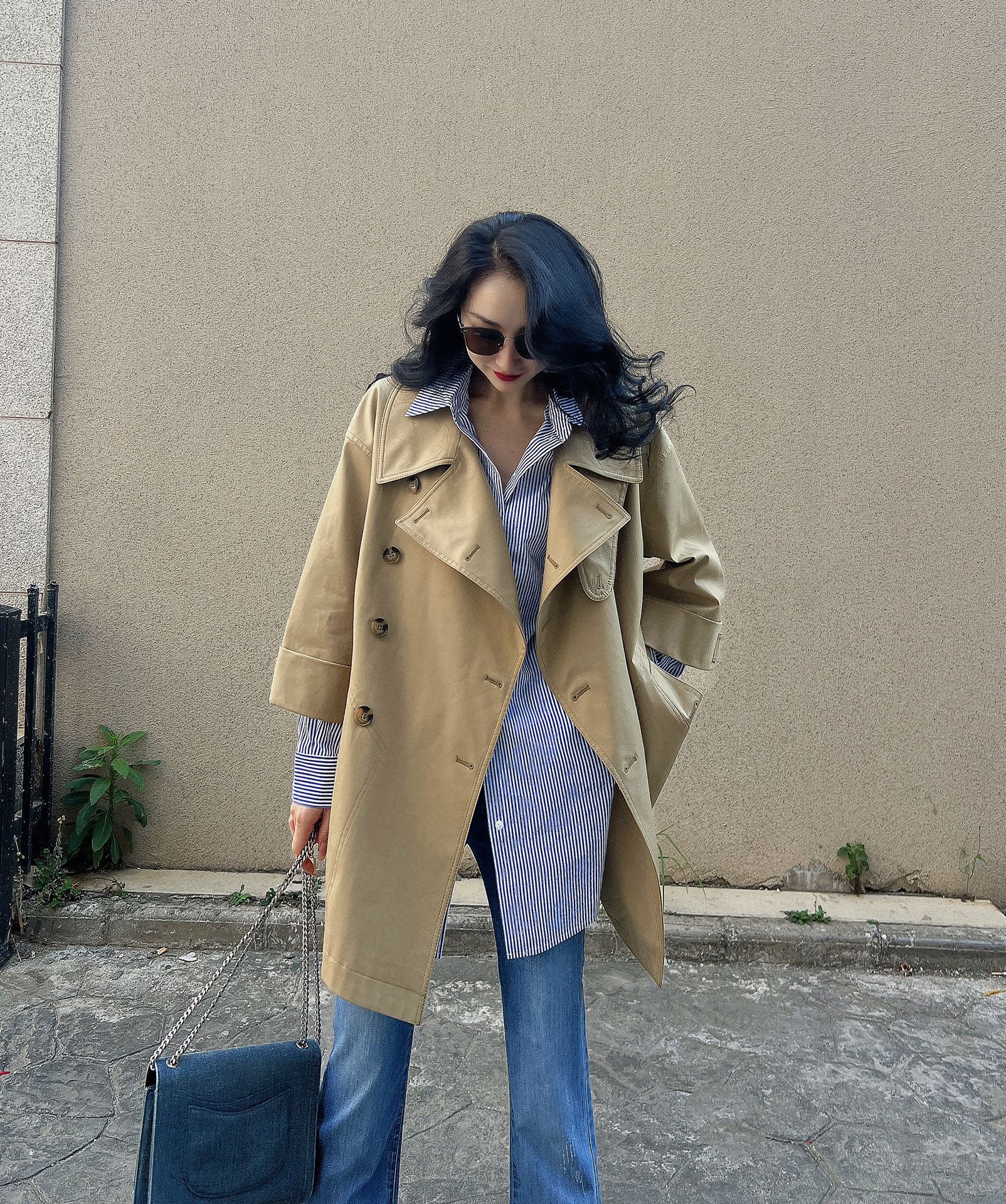 제가 새롭게 출시한 여성복 2024 가을 신상 카키색 라지 라펠 루즈핏 미디 기장 윈드브레이커 9부 소매 코트