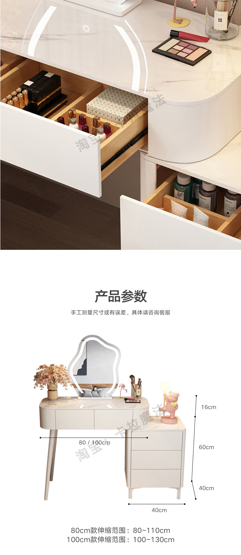 • 흰색 80cm 테이블 + 6 층 캐비닛 + 클라우드 미러 + 원형 스툴