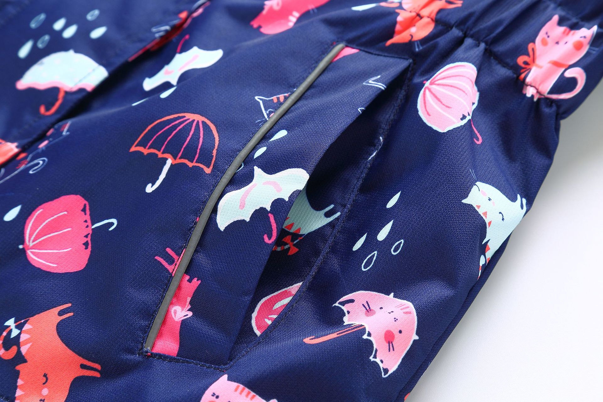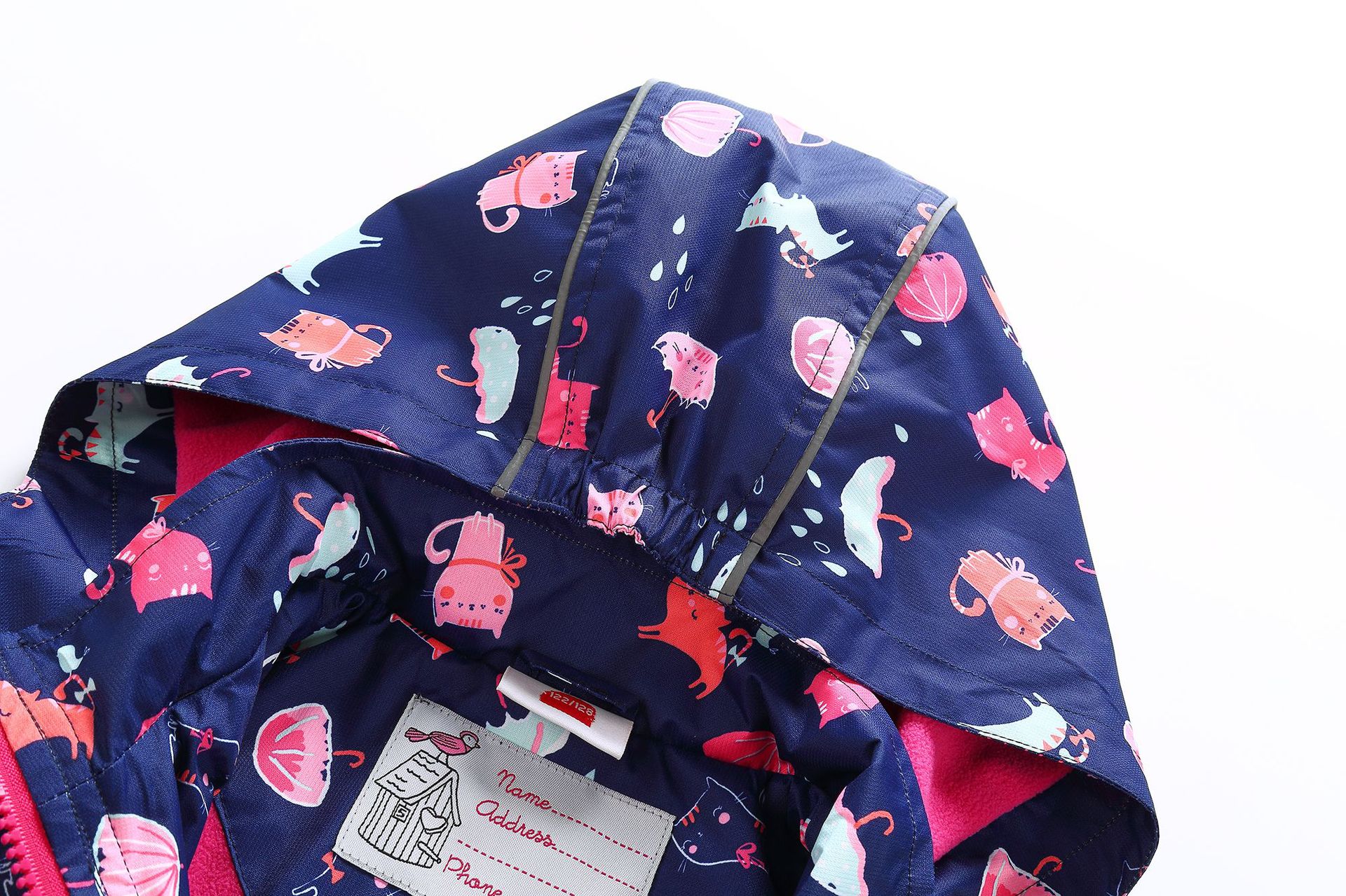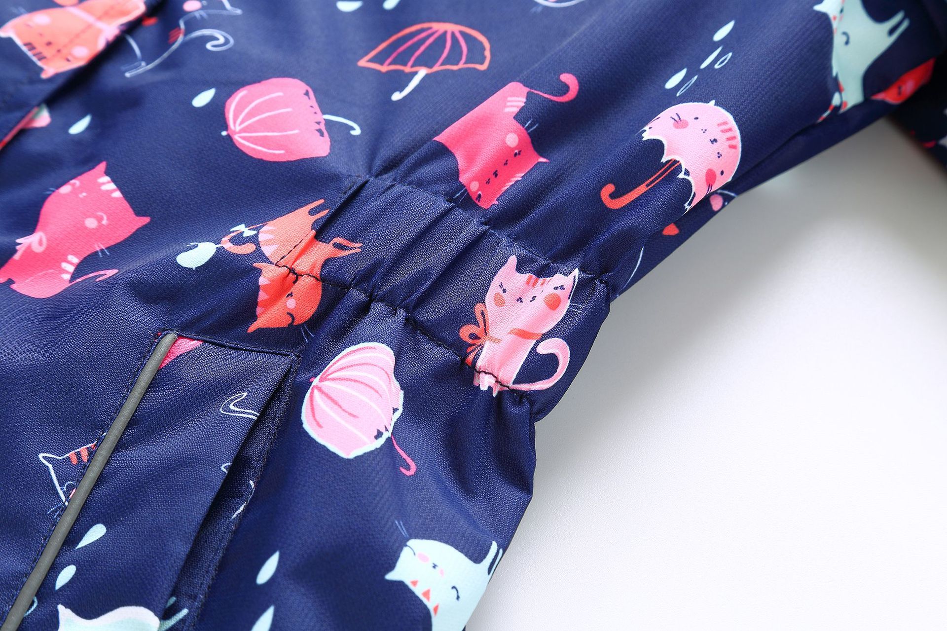 此款风衣很多细节配有安全闪光条,背面是的花朵反光标,袖子也是有反光标。帽子有反光绳。在夜晚非常闪亮,为宝宝夜晚出行安全护航