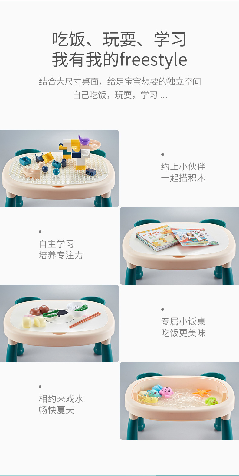 • 작은 모래 테이블 + 의자 + 빌딩 블록 150 개 + 낚시 13 개 + 녹색 모래 4kg + 모래 놀이 액세서리 77 개