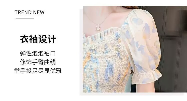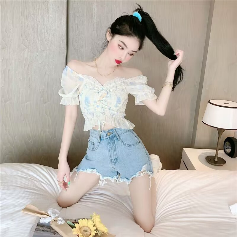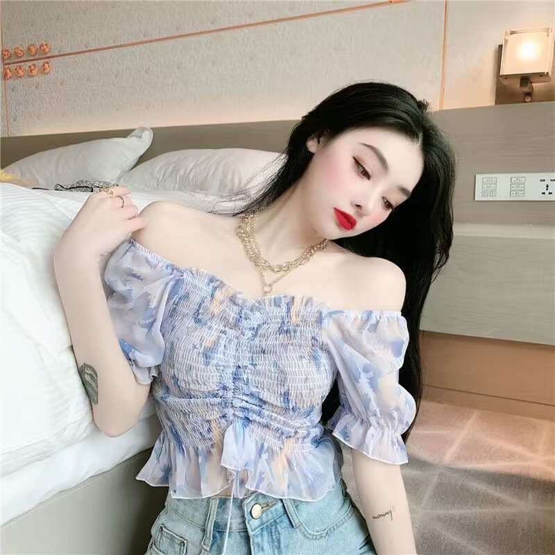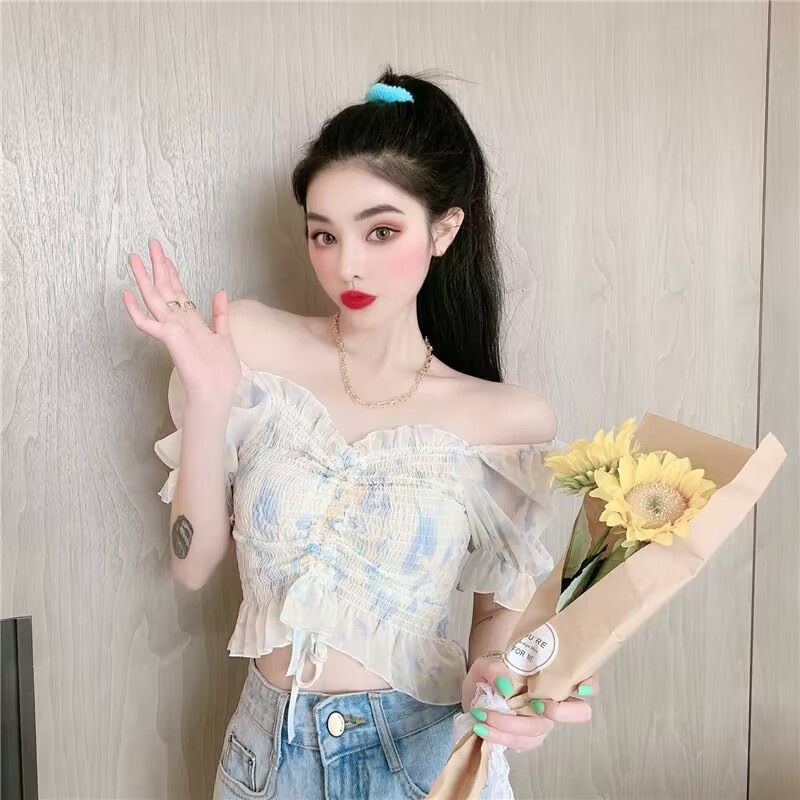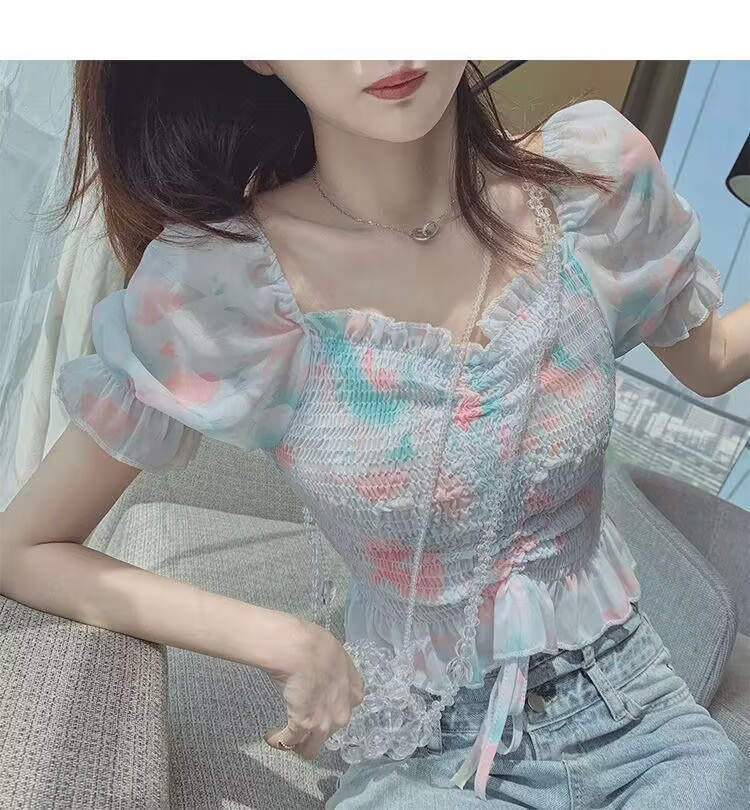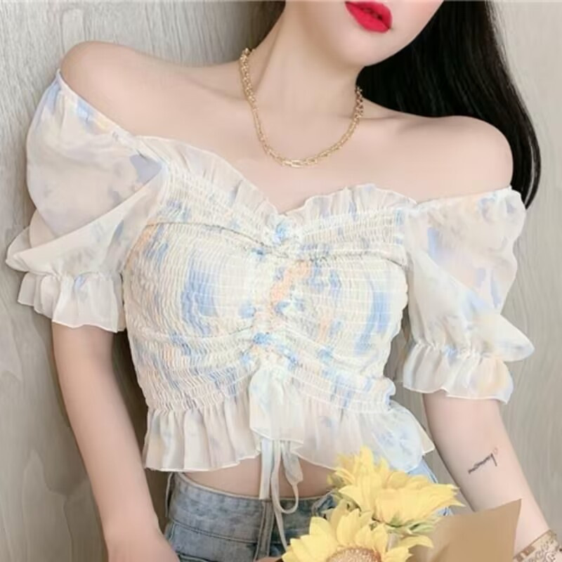 2025 여름 한국 스타일 러플 주름 쉬폰 셔츠, 달콤한 작은 사이즈 퍼프 소매 끈 조임 탑 여성 패션스토어 가기