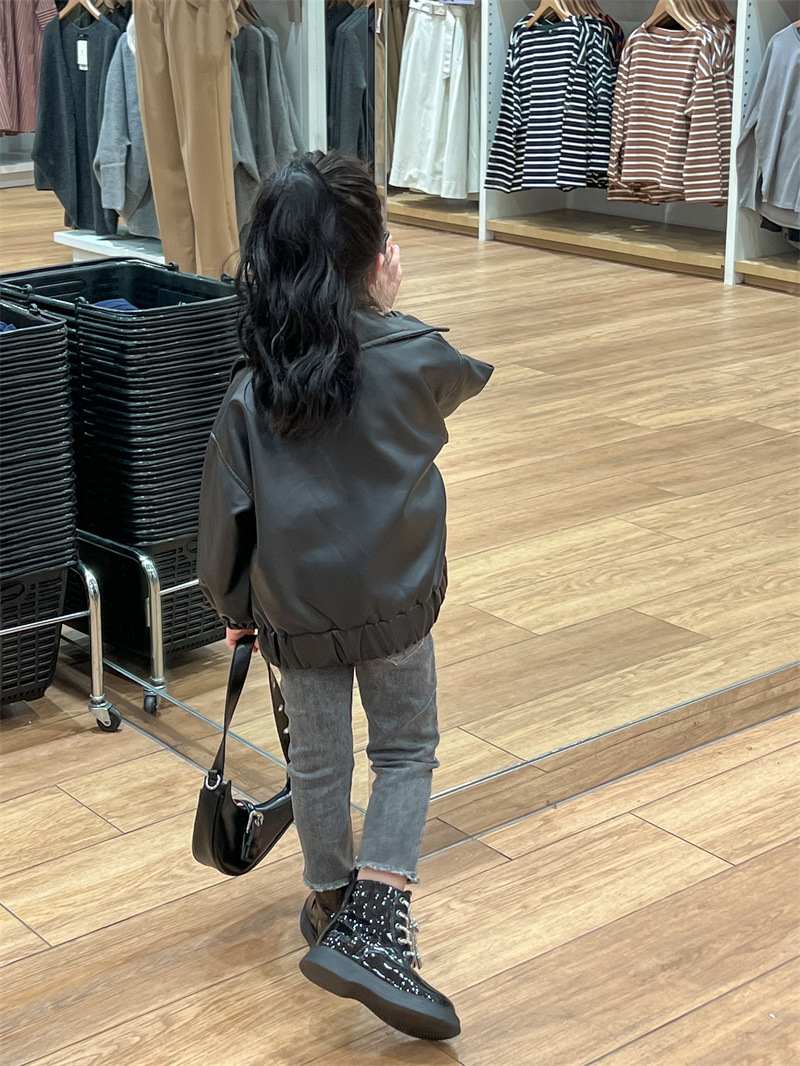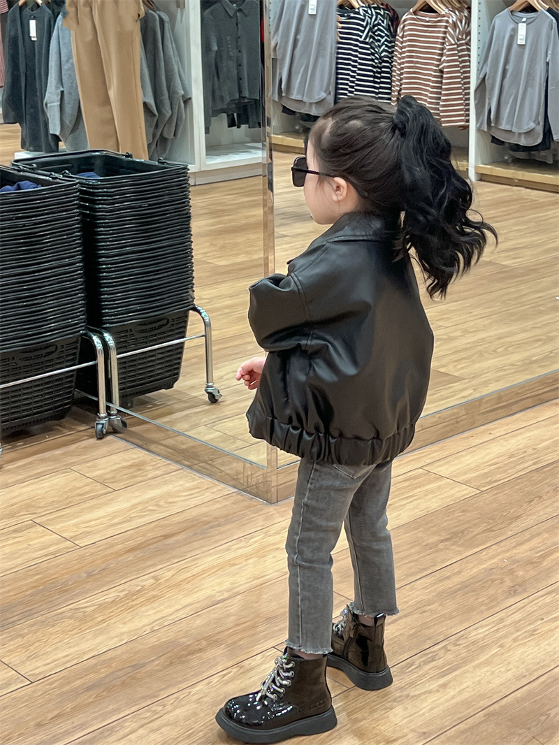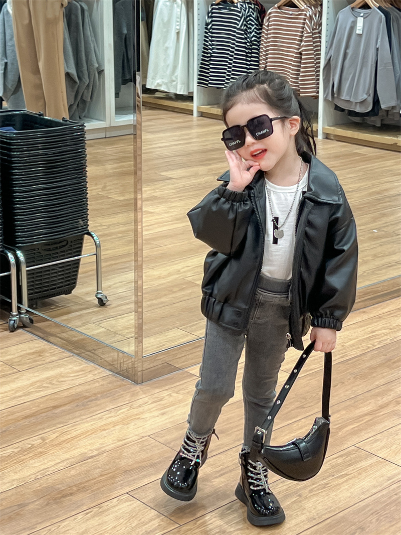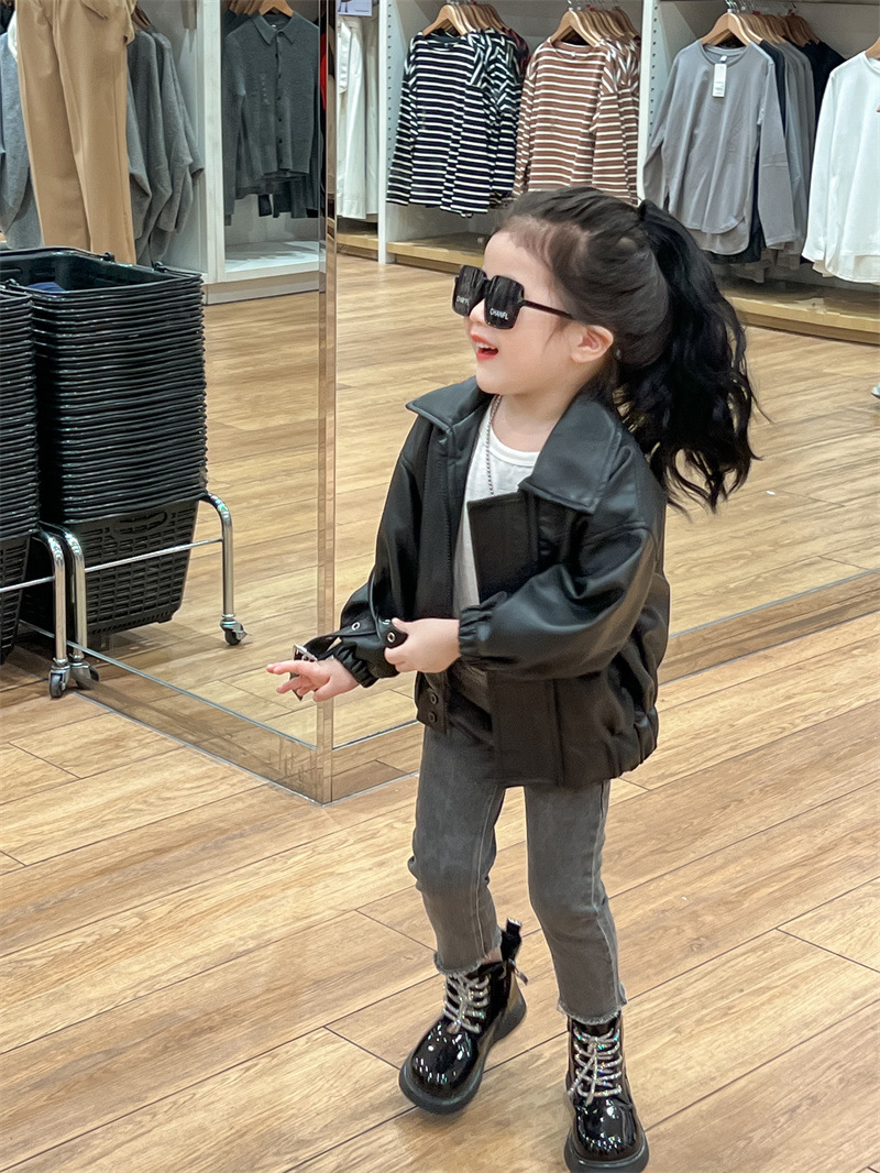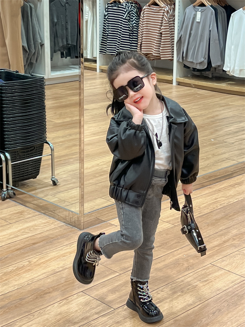 봄과 가을 여아 한국 느슨한 가죽 자켓 어린이 2023 새로운 어린이 블랙 가죽 자켓 슬림핏 청바지스토어 가기