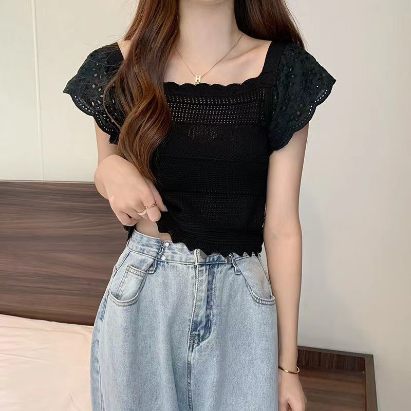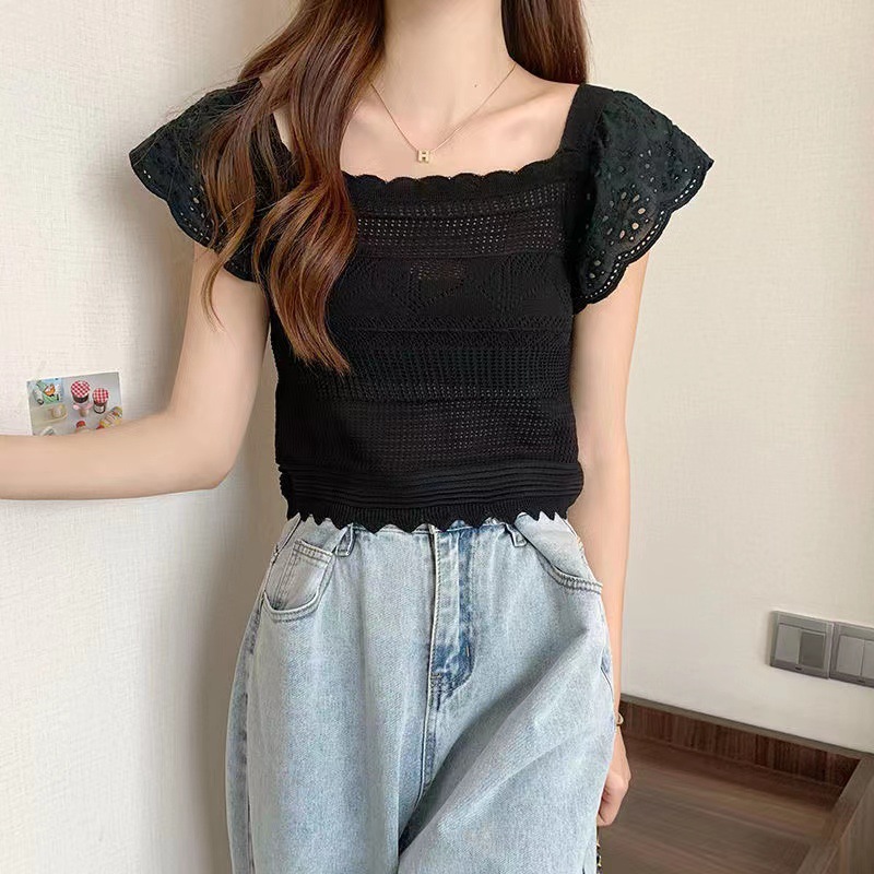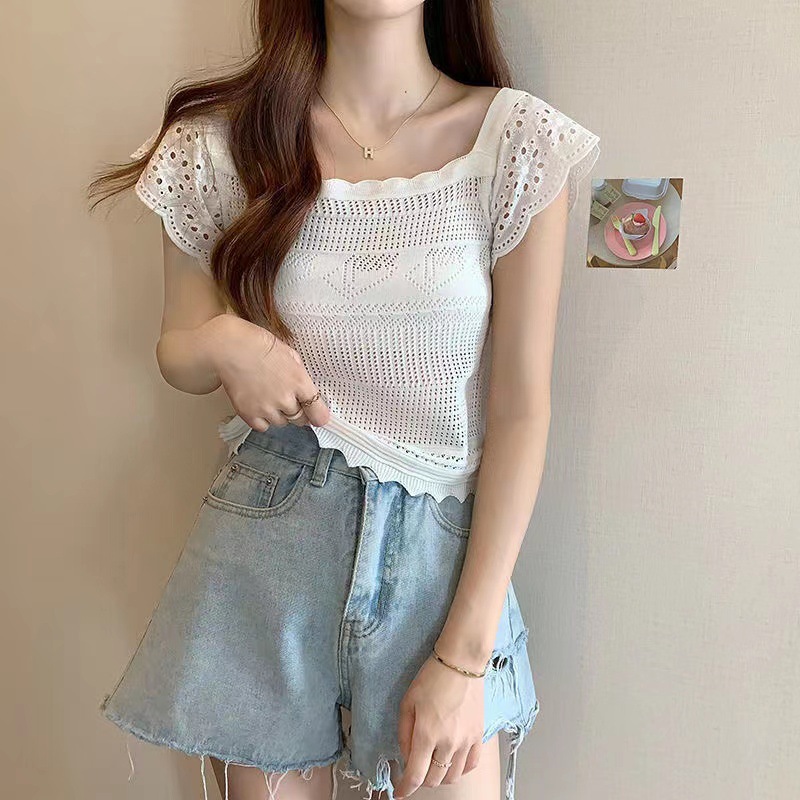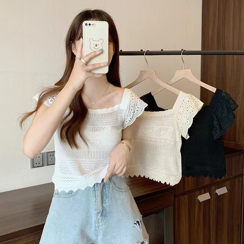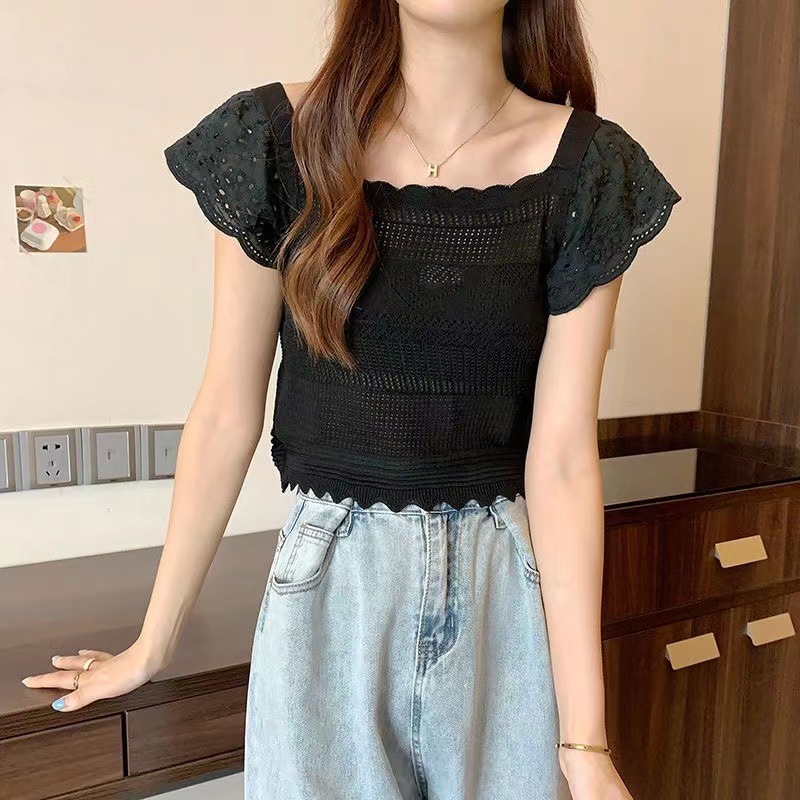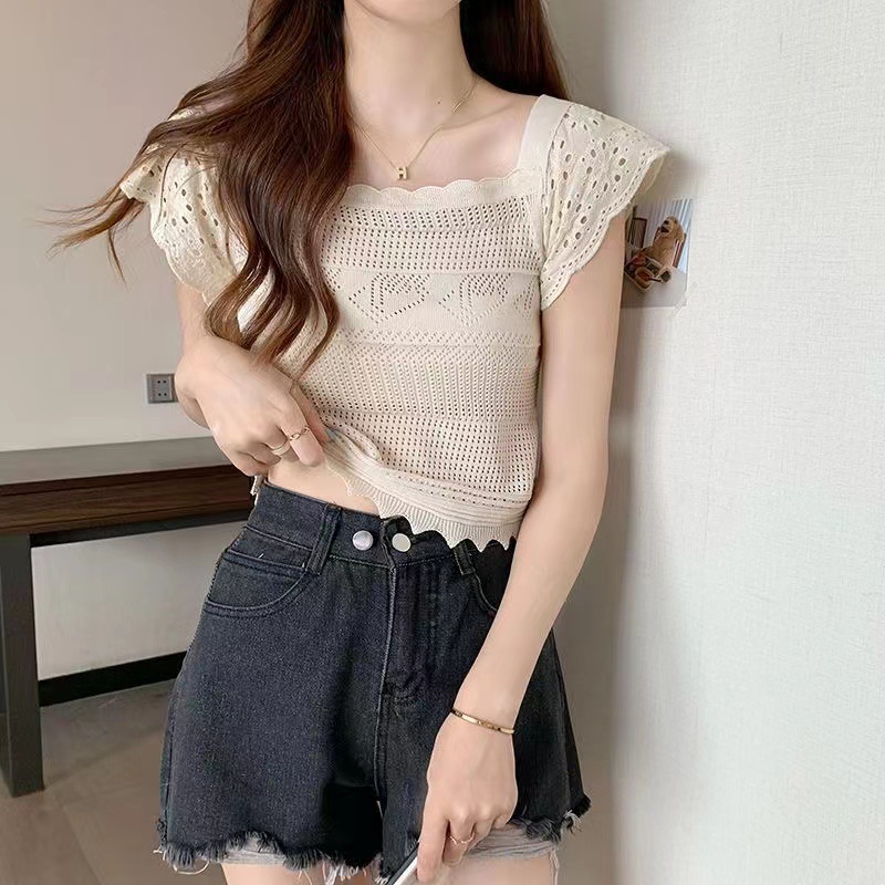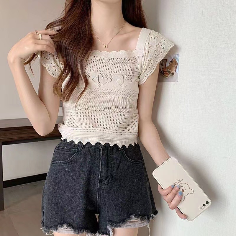 스퀘어 칼라 풀오버 반팔 짧은 니트 스웨터 여성용 여름 얇은 새로운 슬림핏 슬리밍 스몰 탑 여성용 스몰 셔츠스토어 가기