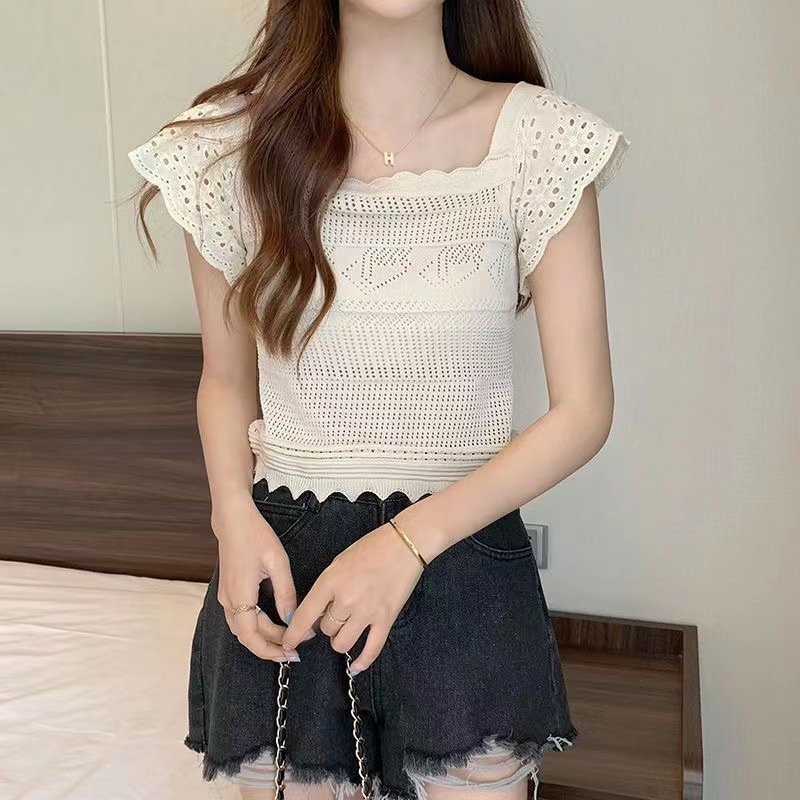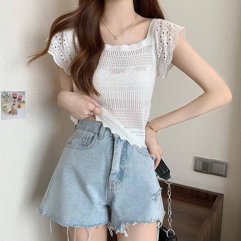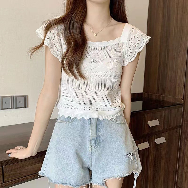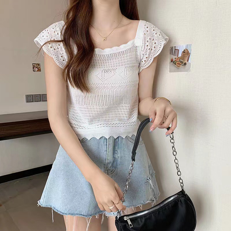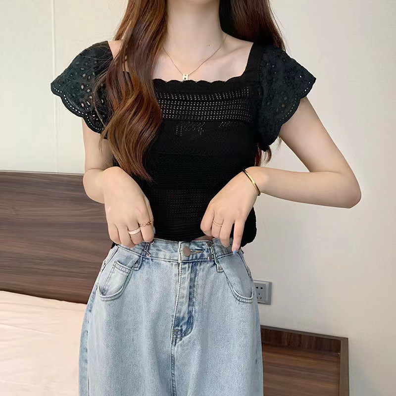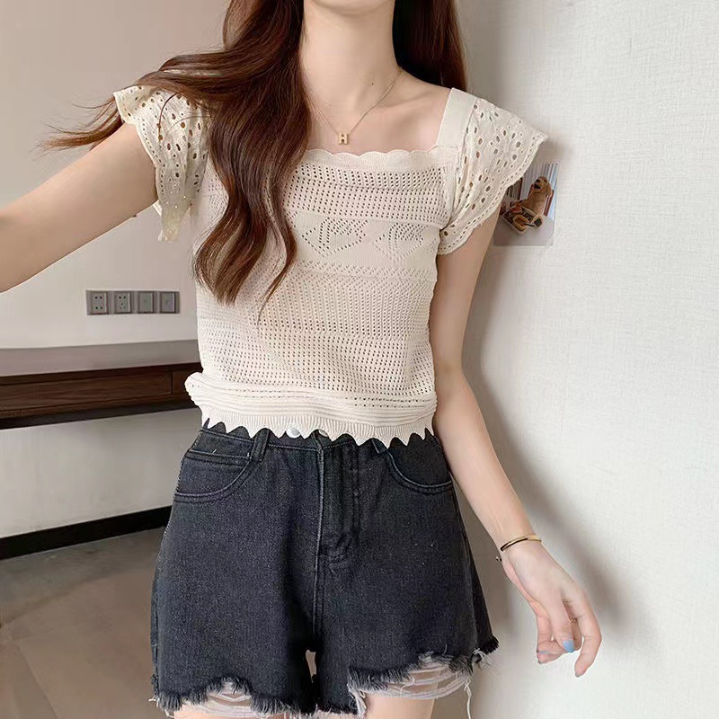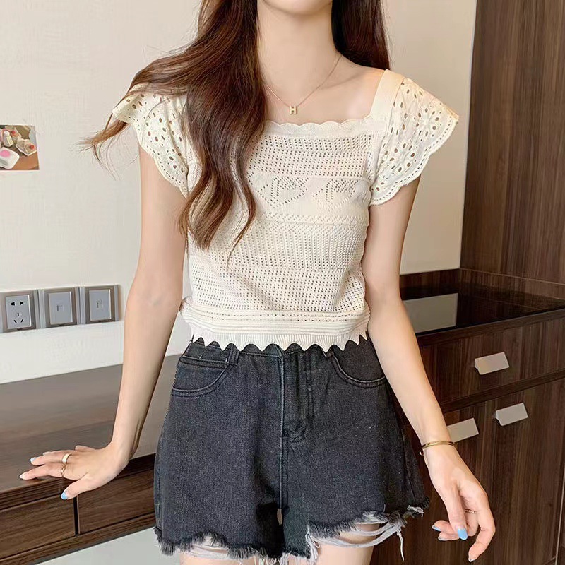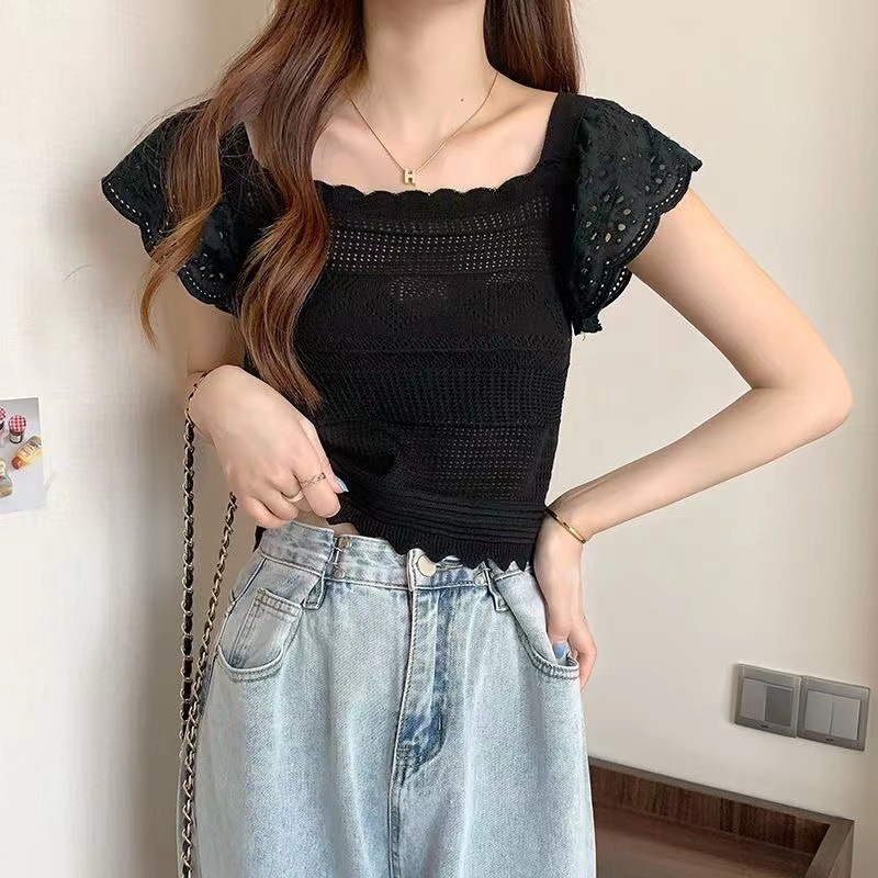 스퀘어 칼라 풀오버 반팔 짧은 니트 스웨터 여성용 여름 얇은 새로운 슬림핏 슬리밍 스몰 탑 여성용 스몰 셔츠스토어 가기