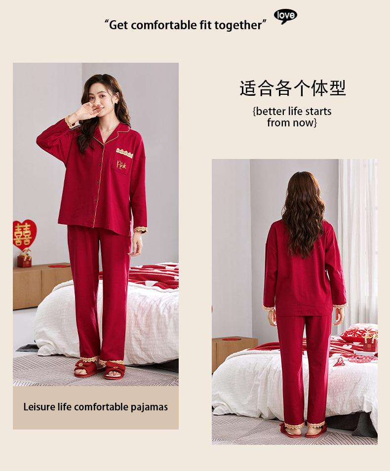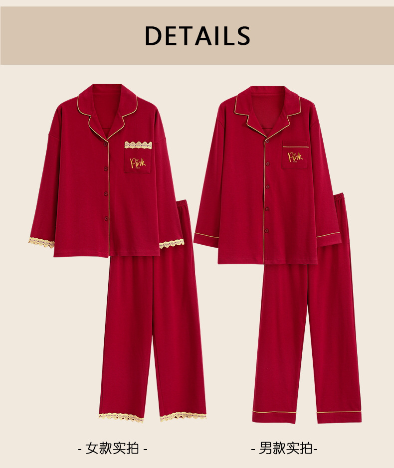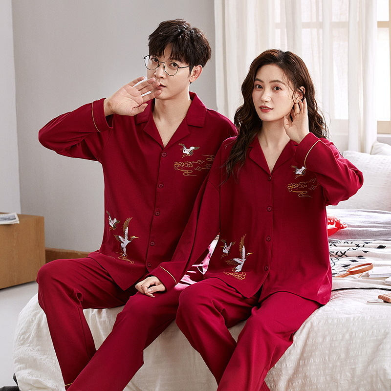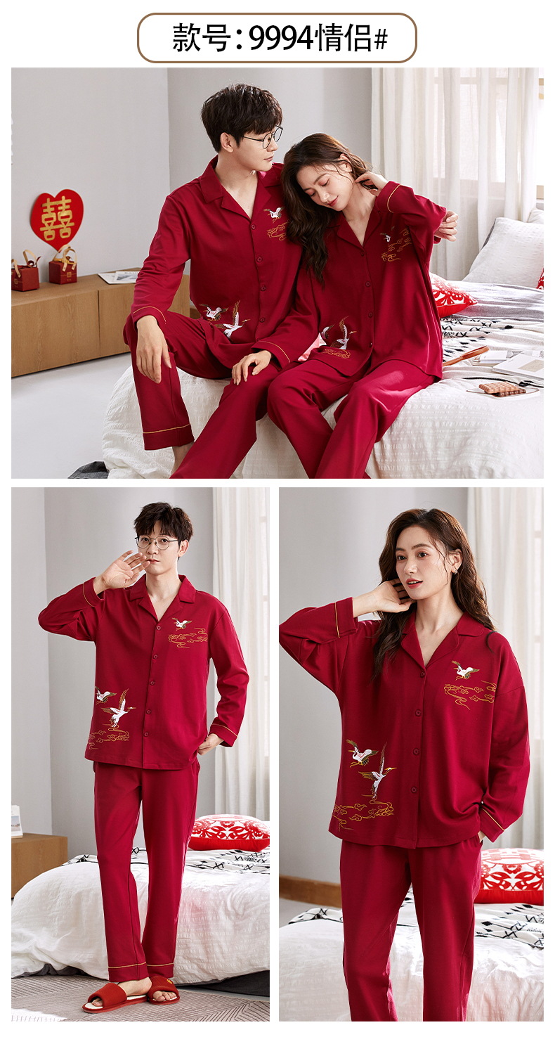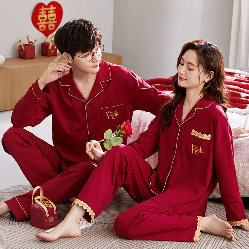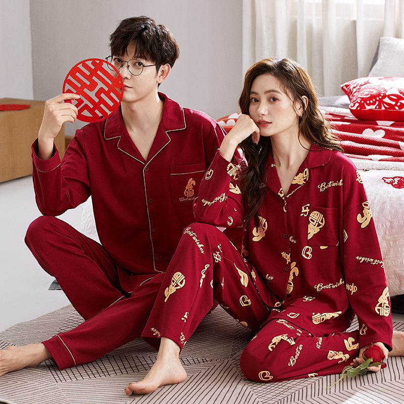 큰 빨간 커플 잠옷 봄과 가을 면 결혼식 남자와 여자의 옷깃 세트 여름 긴 소매 생활 년 가정 옷스토어 가기