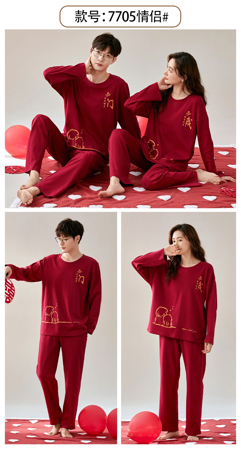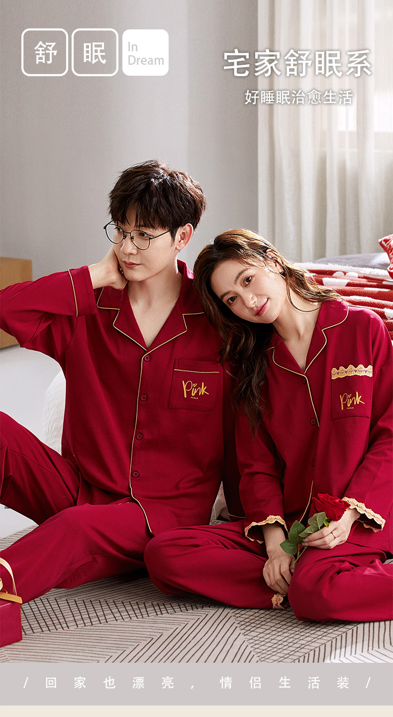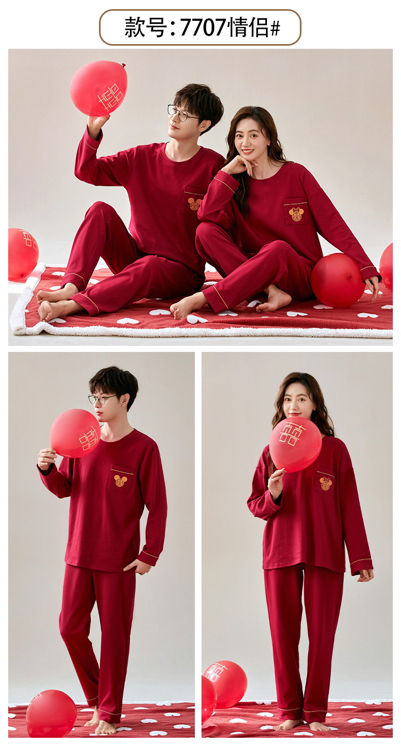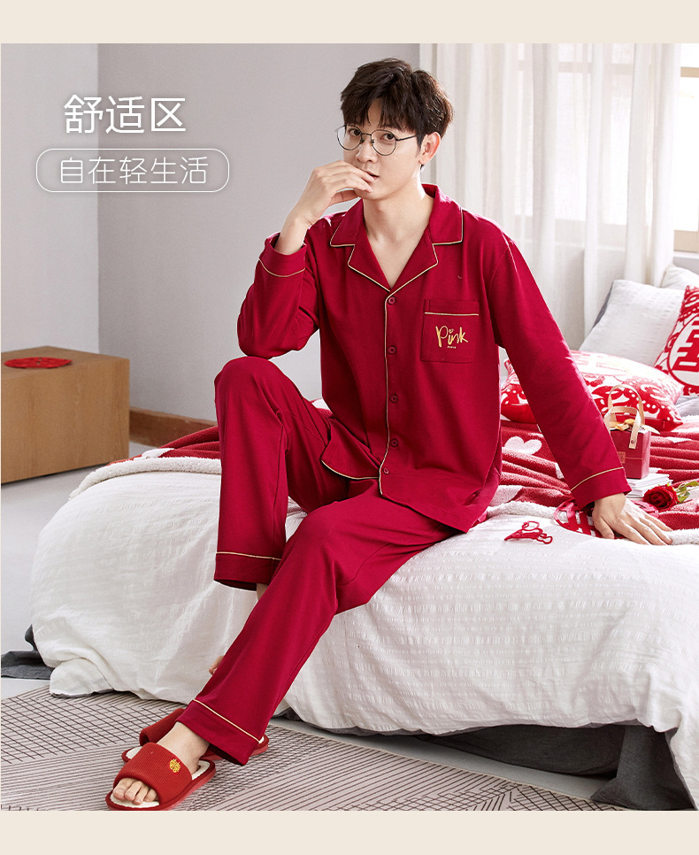 큰 빨간 커플 잠옷 봄과 가을 면 결혼식 남자와 여자의 옷깃 세트 여름 긴 소매 생활 년 가정 옷스토어 가기