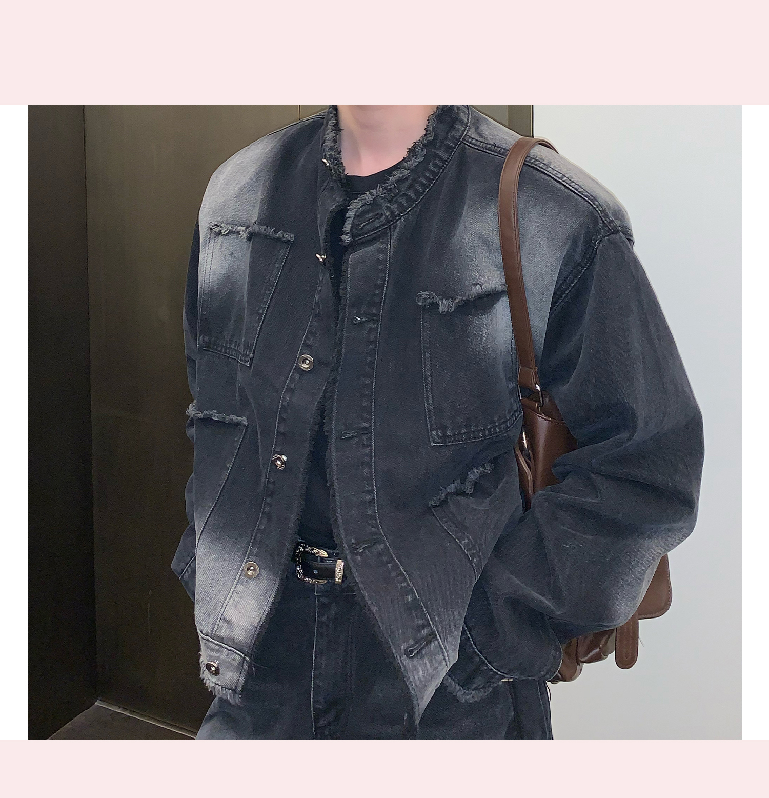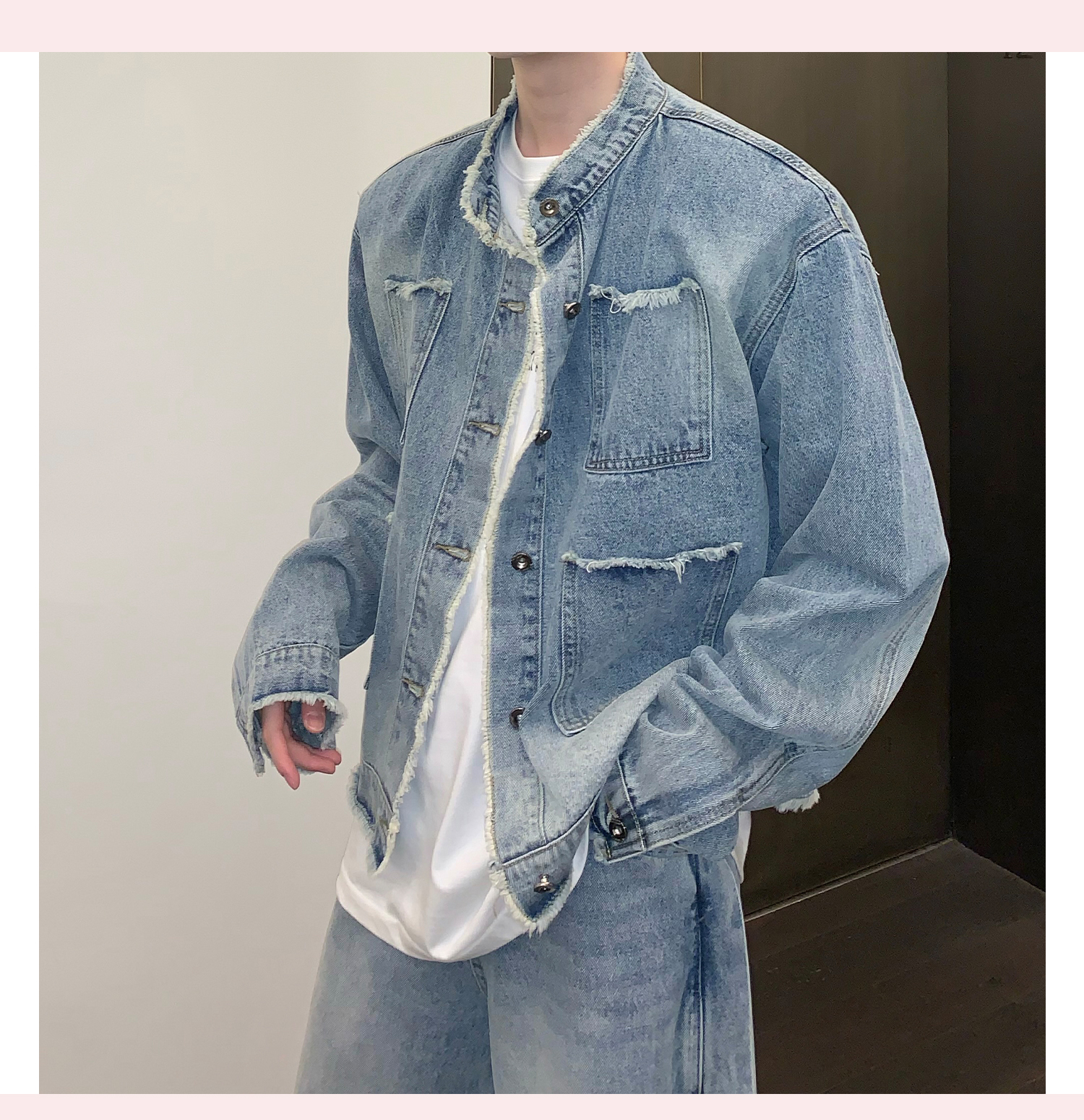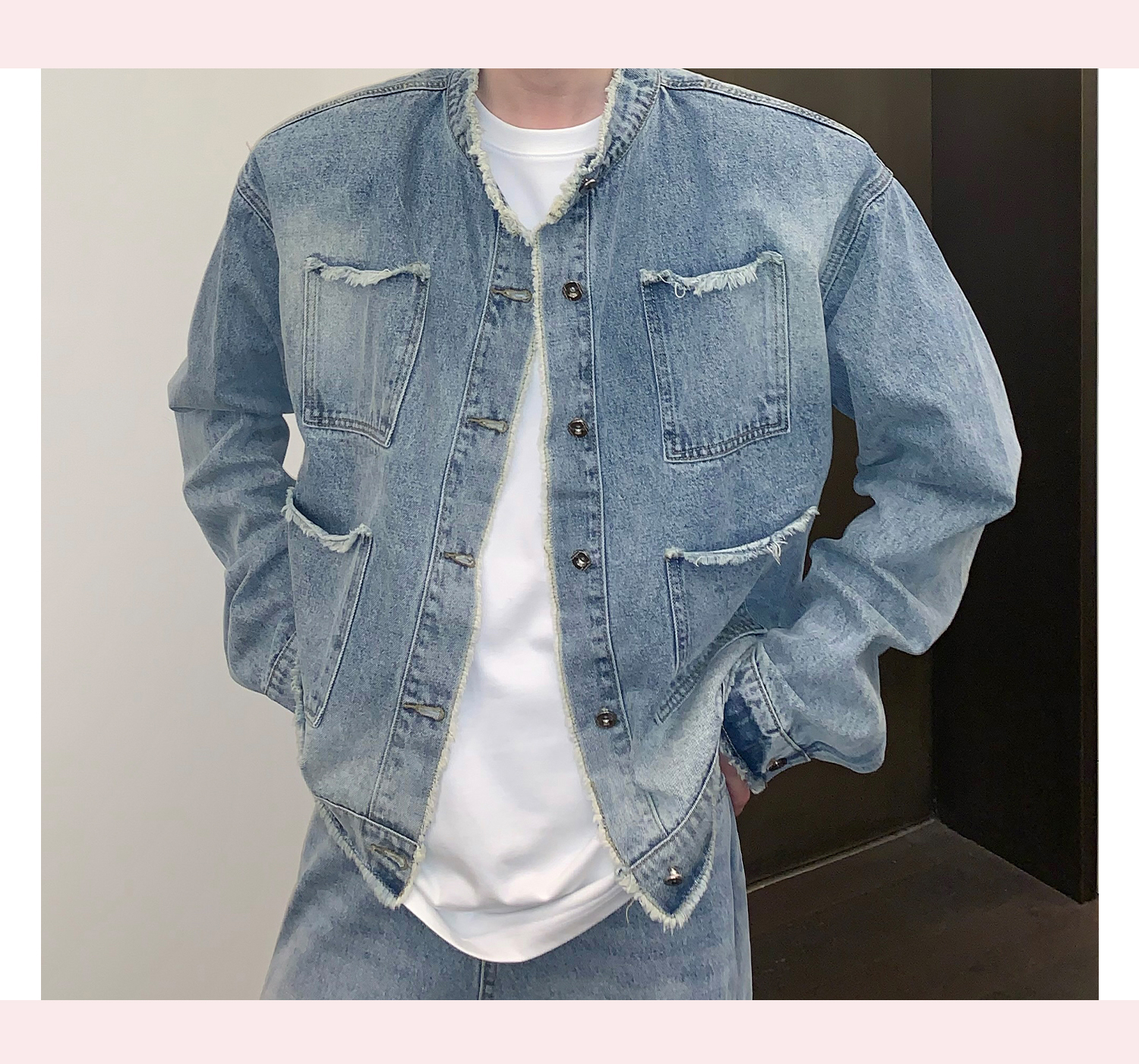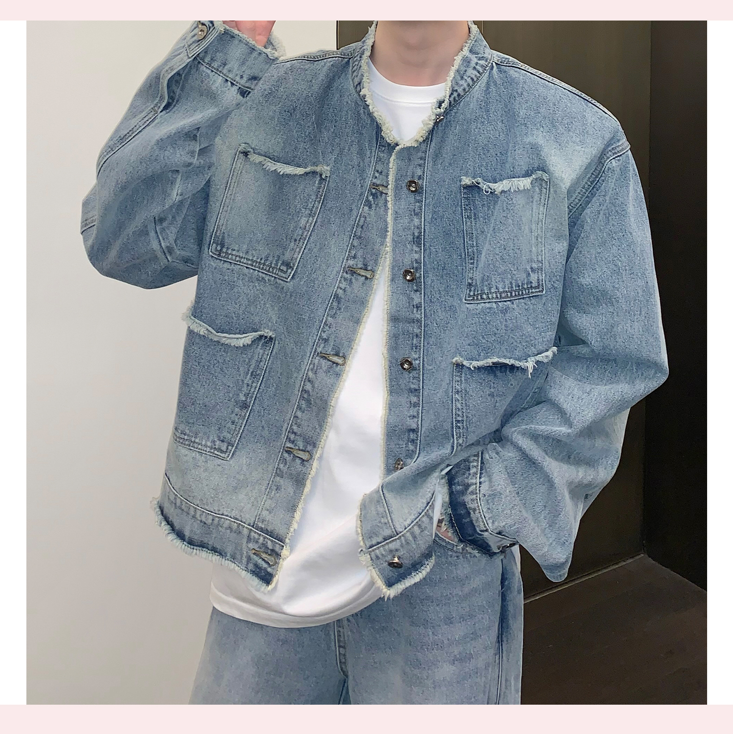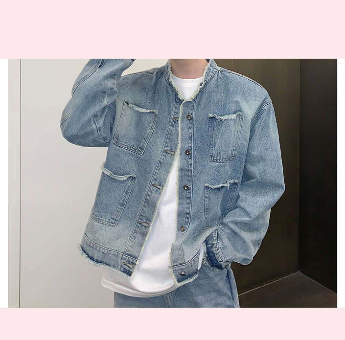 고민 러플 트렌디 브랜드 하이 스트리트 데님 재킷 남자의 느슨한 틈새 디자인 캐주얼 씻어 빈티지 그라디언트 재킷스토어 가기