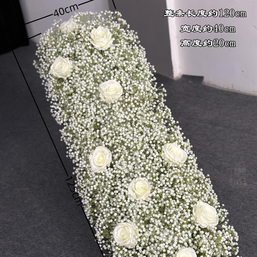 其他尺寸可以定制 客户定制白色满天星玫瑰蝴蝶兰拖尾桌花 长约2米,宽度38-110cm 主要选用白色满天星,玫瑰,蝴蝶兰插花