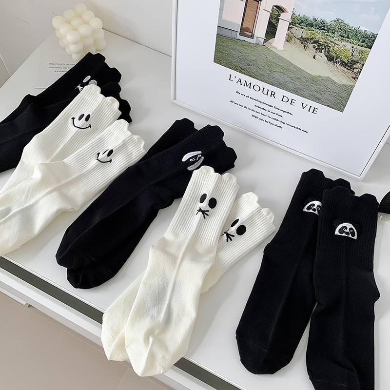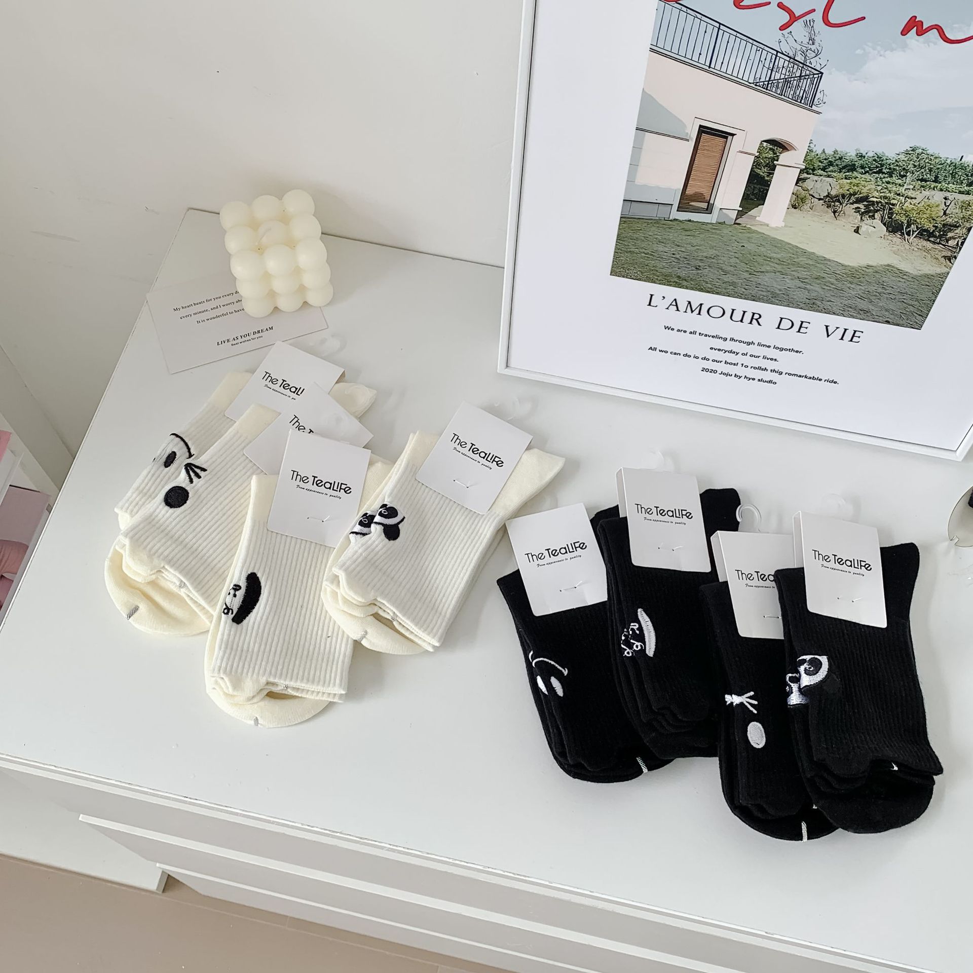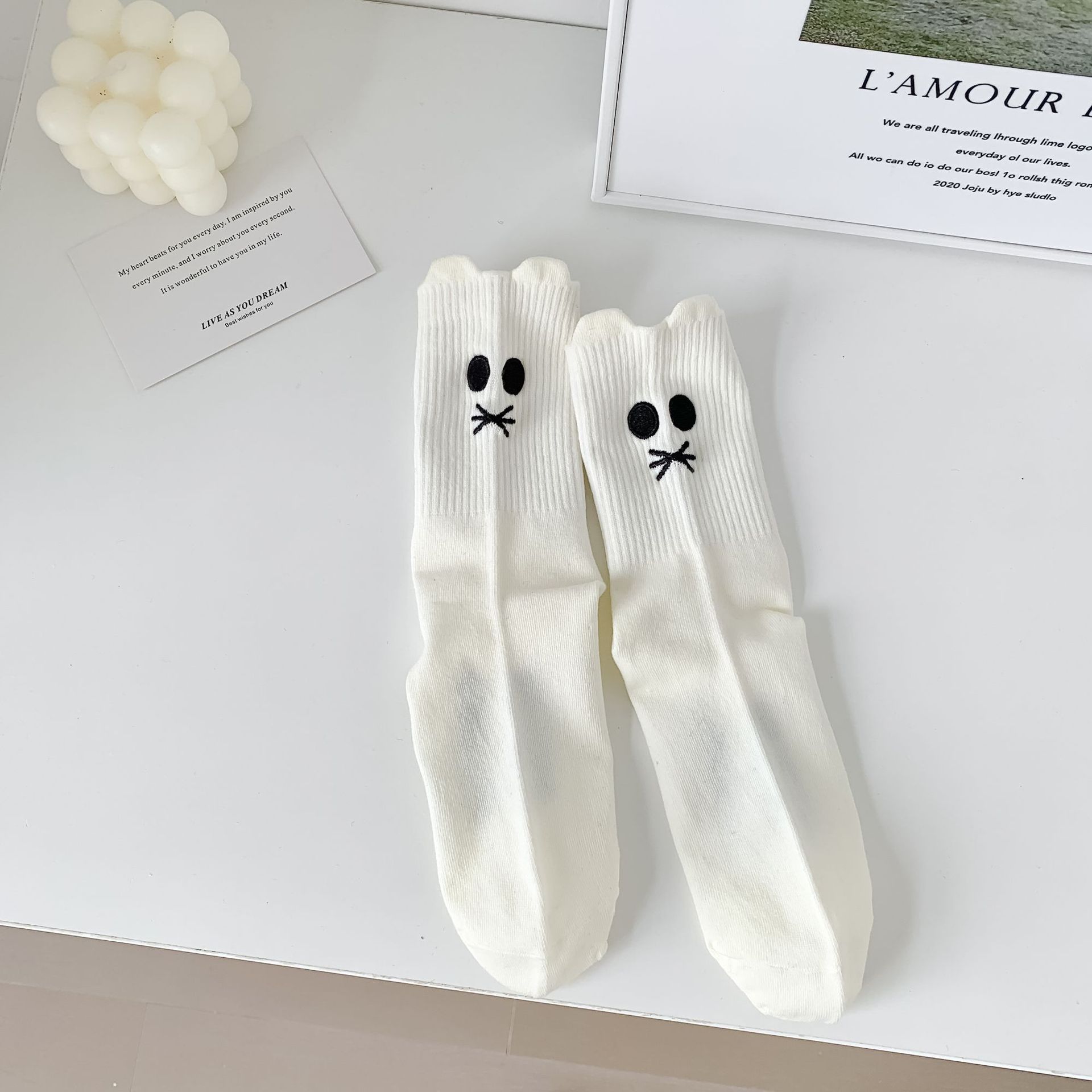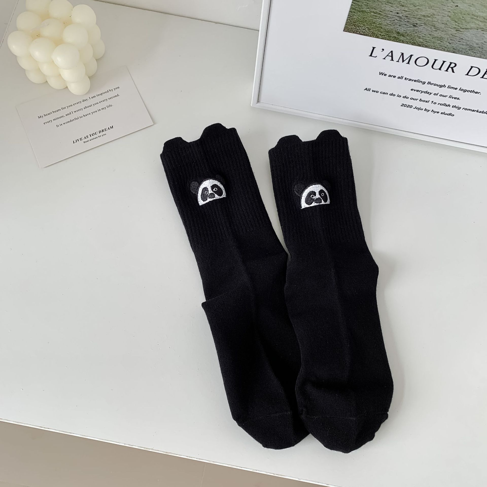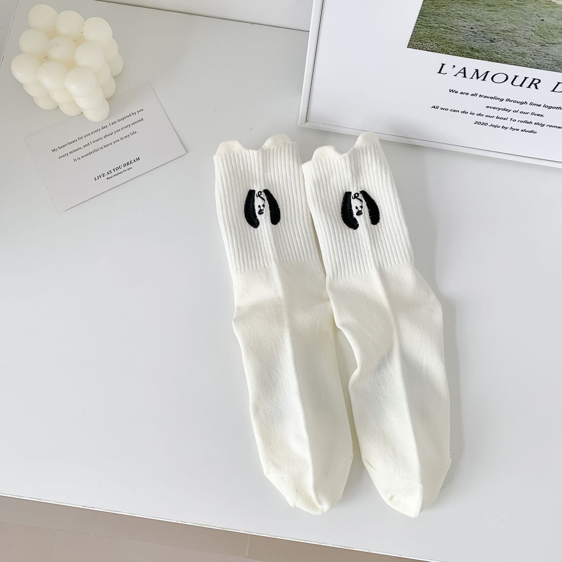 새로운 귀여운 강아지 곰 자수 흑백 양말 여성용 중간 길이 양말 귀여운 작은 귀 양말스토어 가기