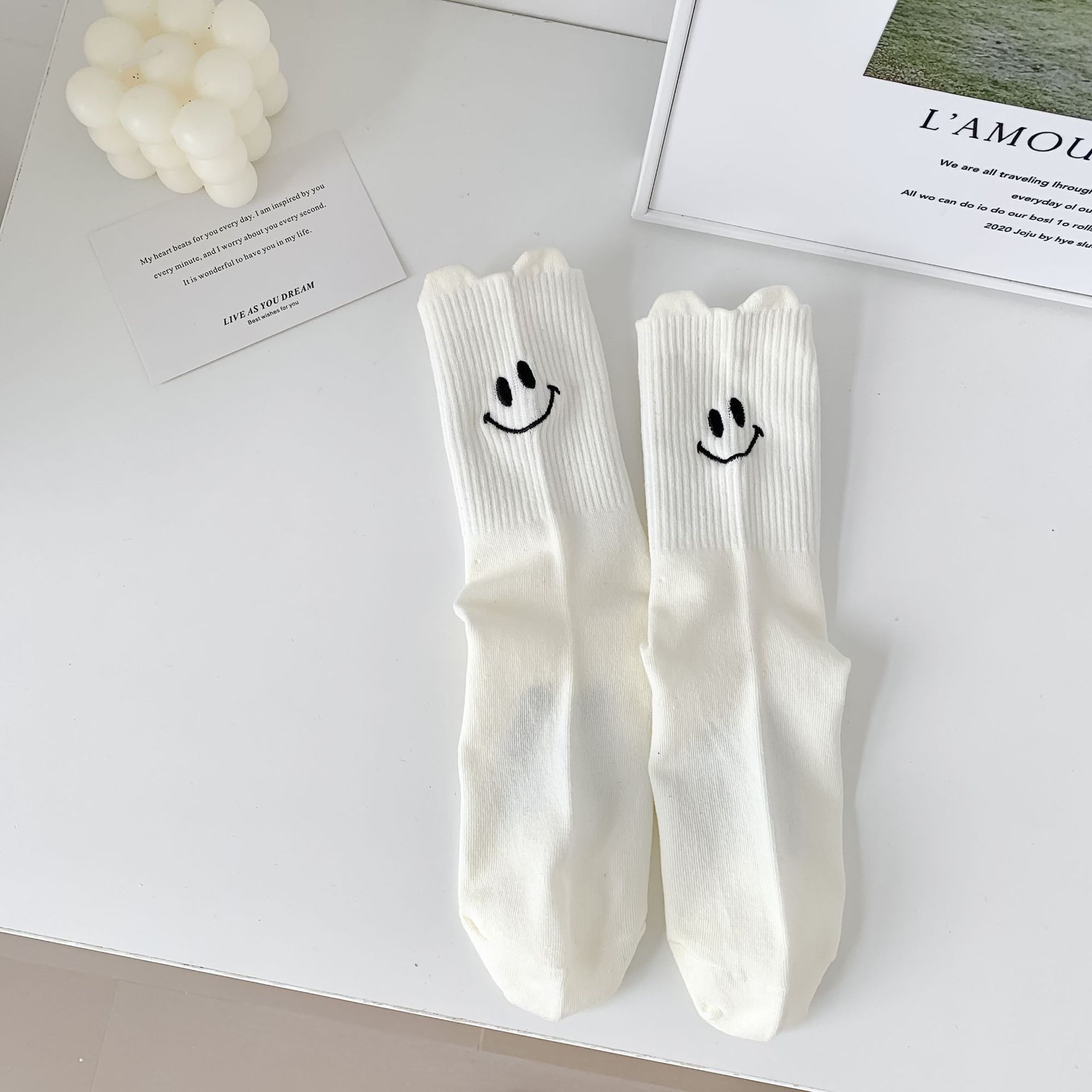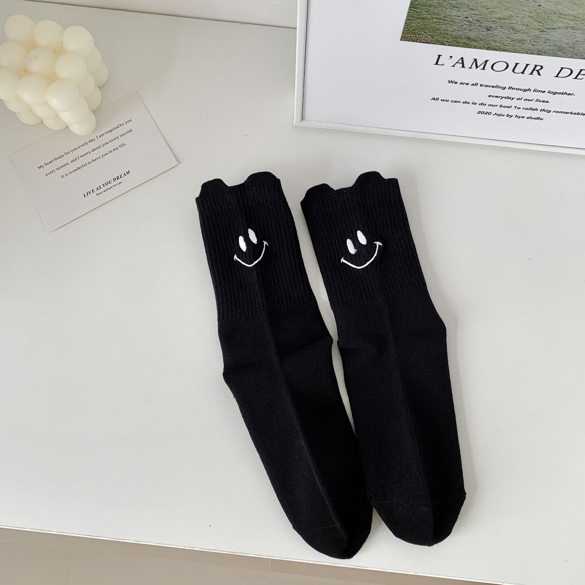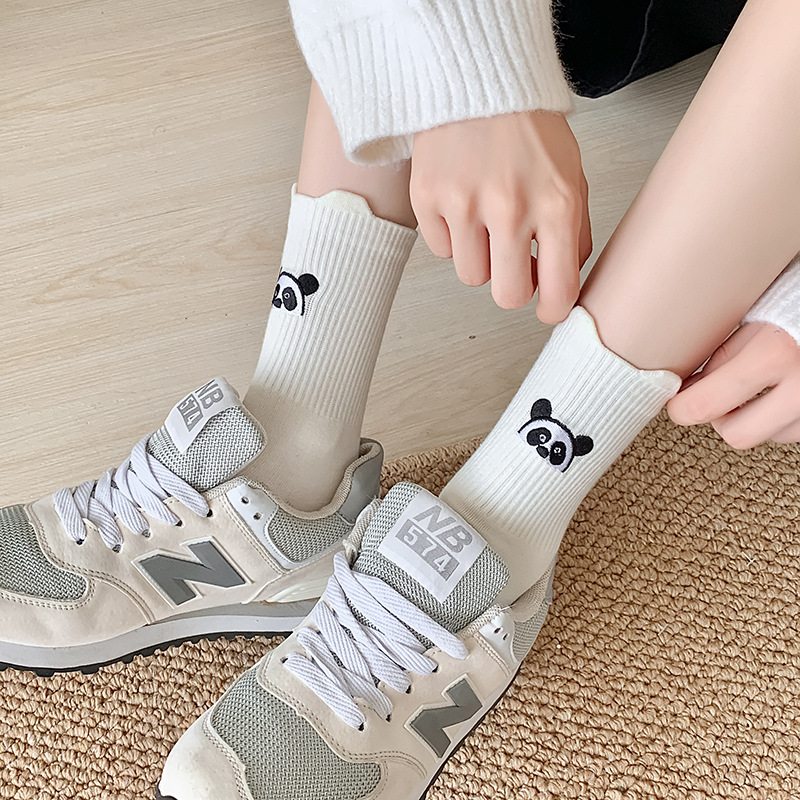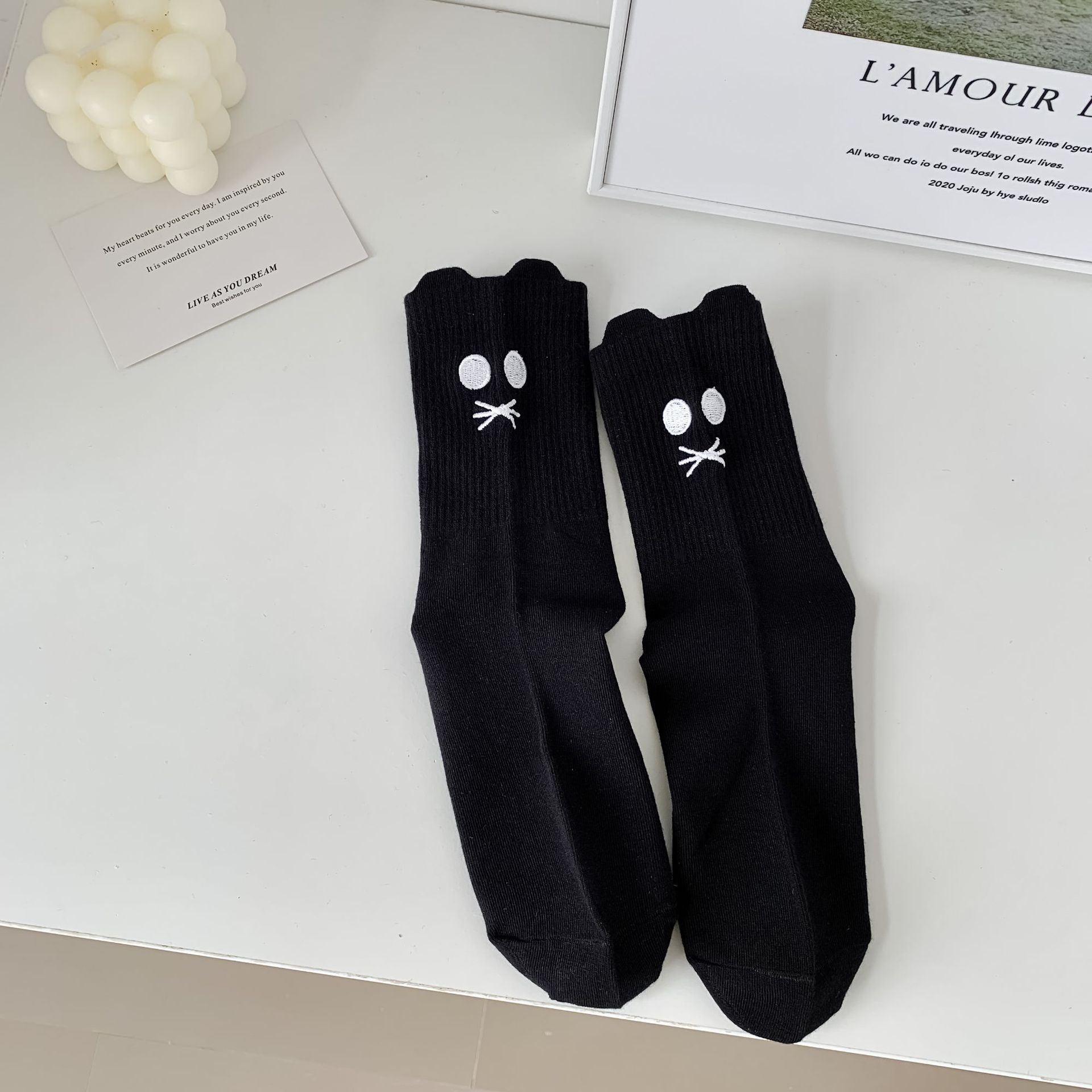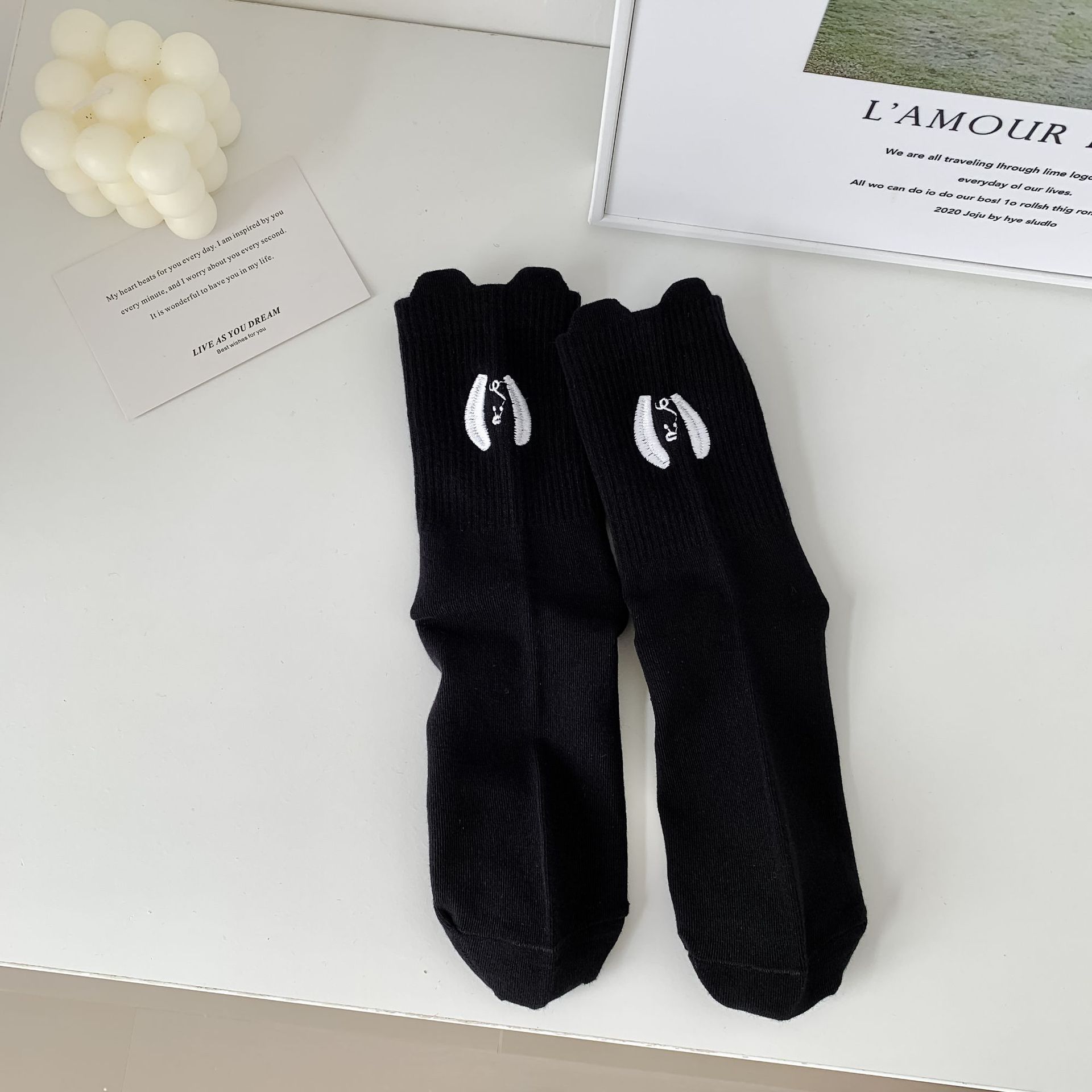 새로운 귀여운 강아지 곰 자수 흑백 양말 여성용 중간 길이 양말 귀여운 작은 귀 양말스토어 가기