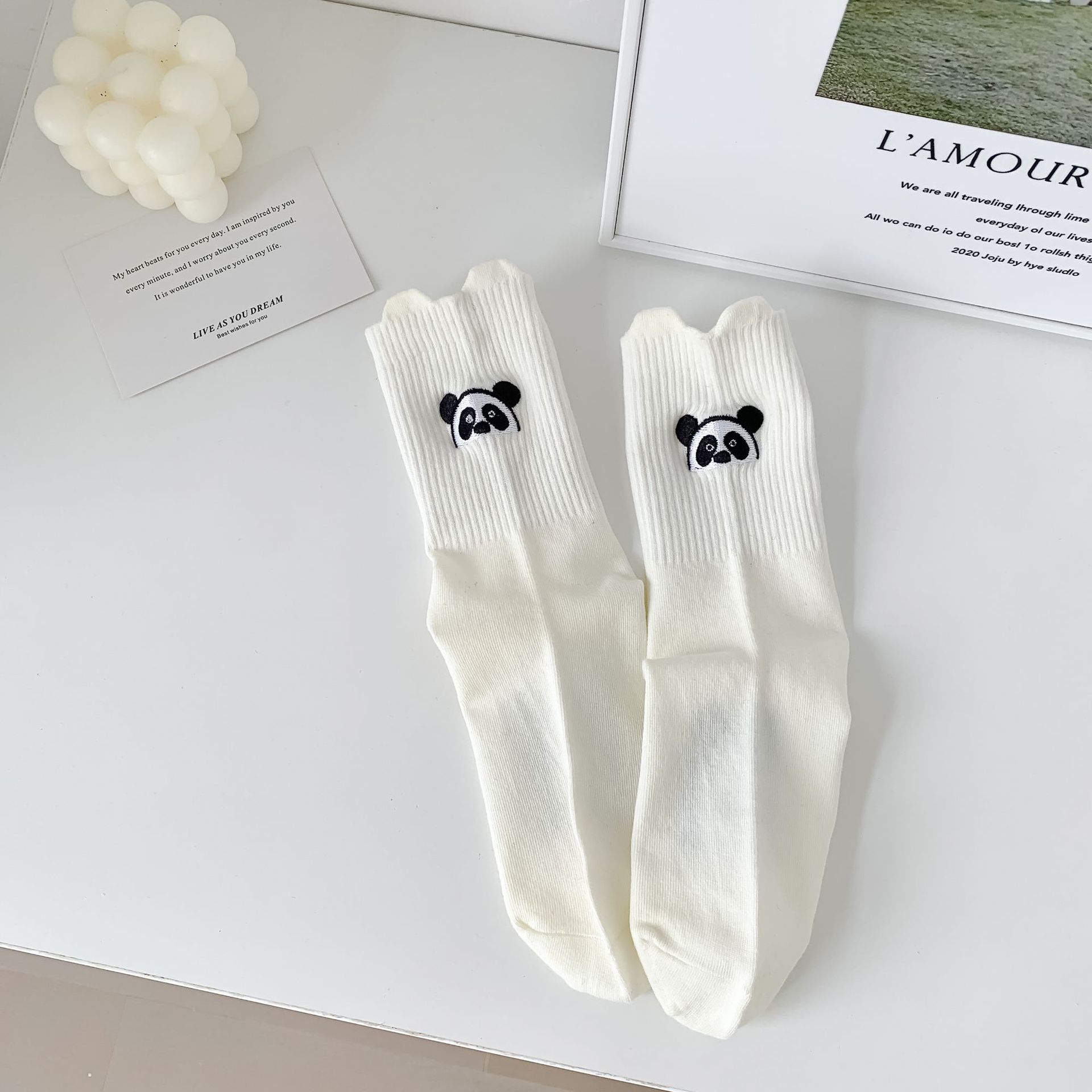 새로운 귀여운 강아지 곰 자수 흑백 양말 여성용 중간 길이 양말 귀여운 작은 귀 양말