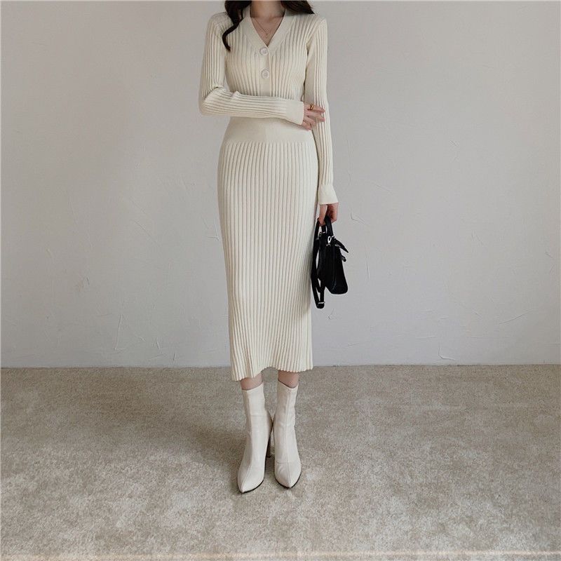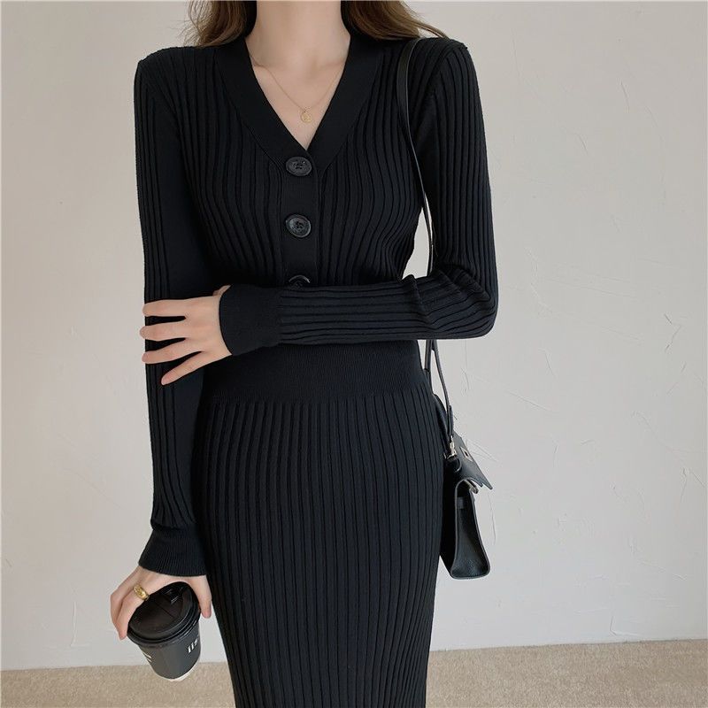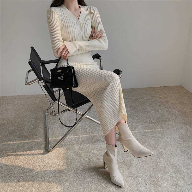 이른 가을 매칭 코트 롱 슬림 핏 스웨터 바깥 착용 허리 및 힙 랩 스타일리스트베이스 니트 원피스 무릎 위에 원피스
