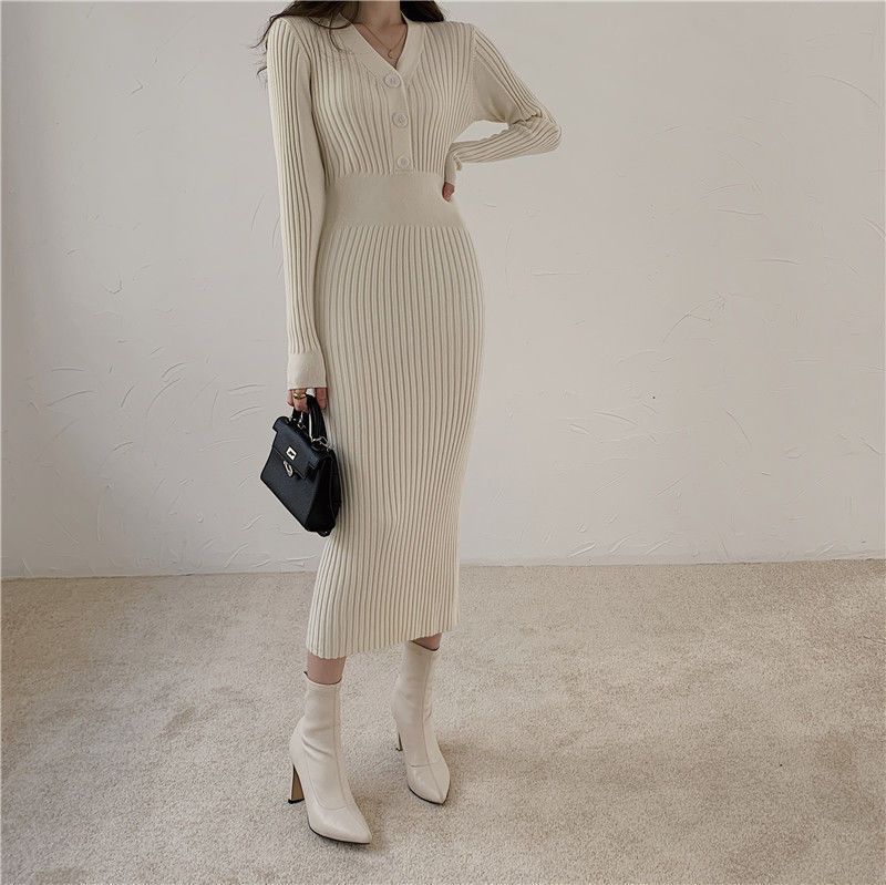 이른 가을 매칭 코트 롱 슬림 핏 스웨터 바깥 착용 허리 및 힙 랩 스타일리스트베이스 니트 원피스 무릎 위에 원피스스토어 가기