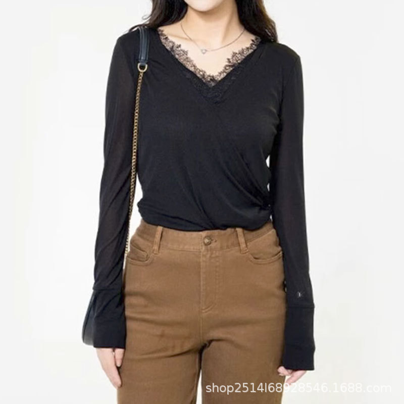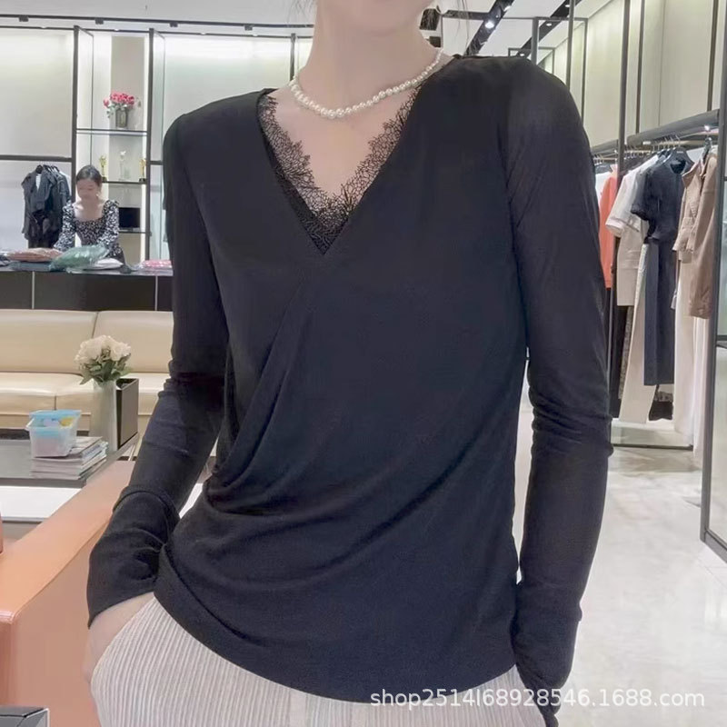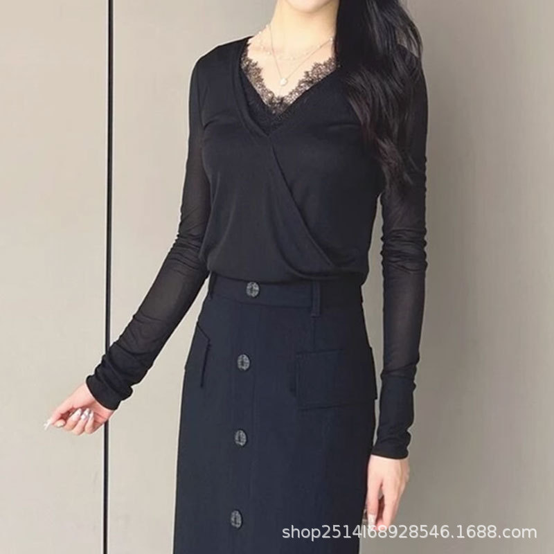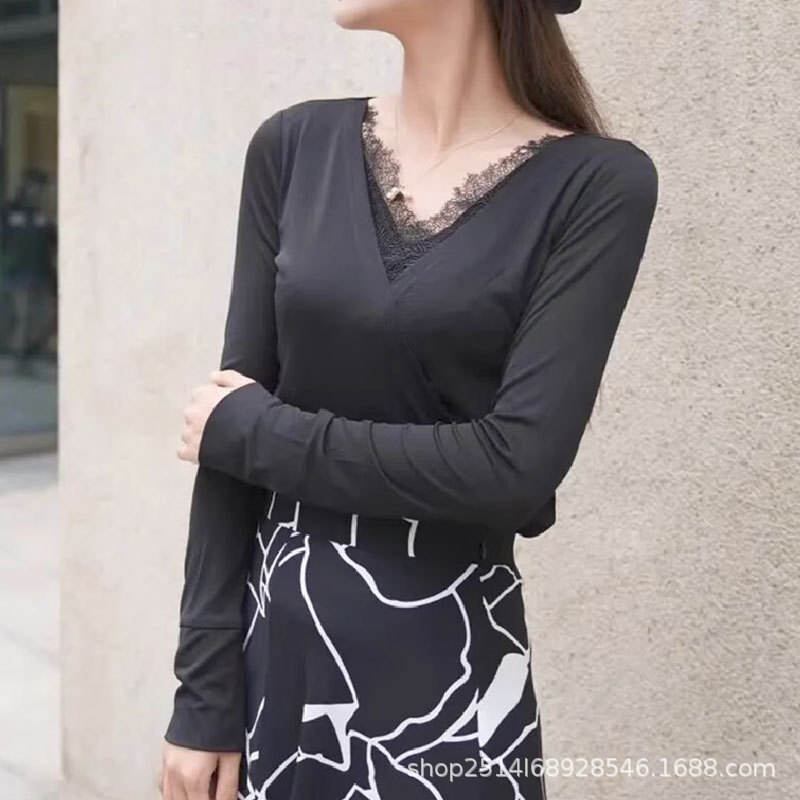 형 새 여성 의류 2023 가을 새 통근 슬림 V 넥 레이스 스티칭 가짜 투피스 베이스 셔츠 티셔츠 여성