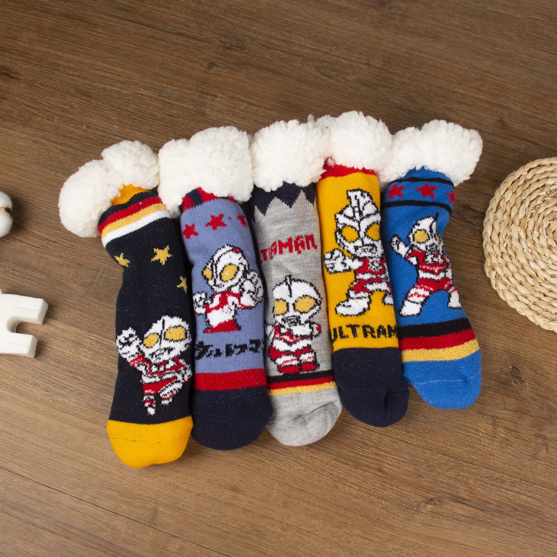 새로운 가을과 겨울 기모 두꺼운 반 벨벳 산호 벨벳 울트라 맨 만화 바닥 양말 어린이 중 큰 어린이 아기 양말