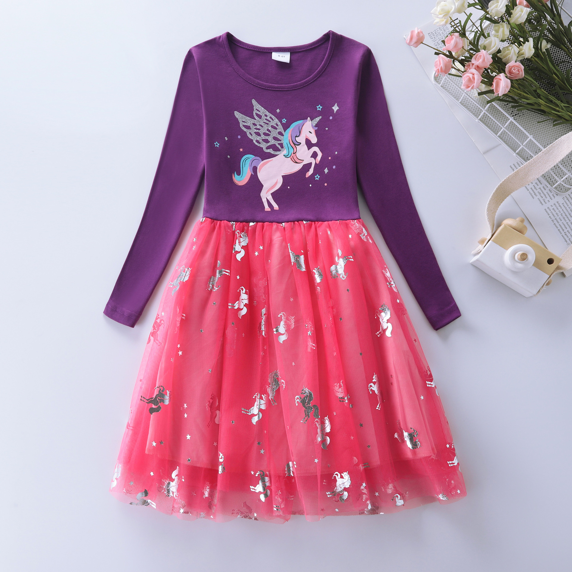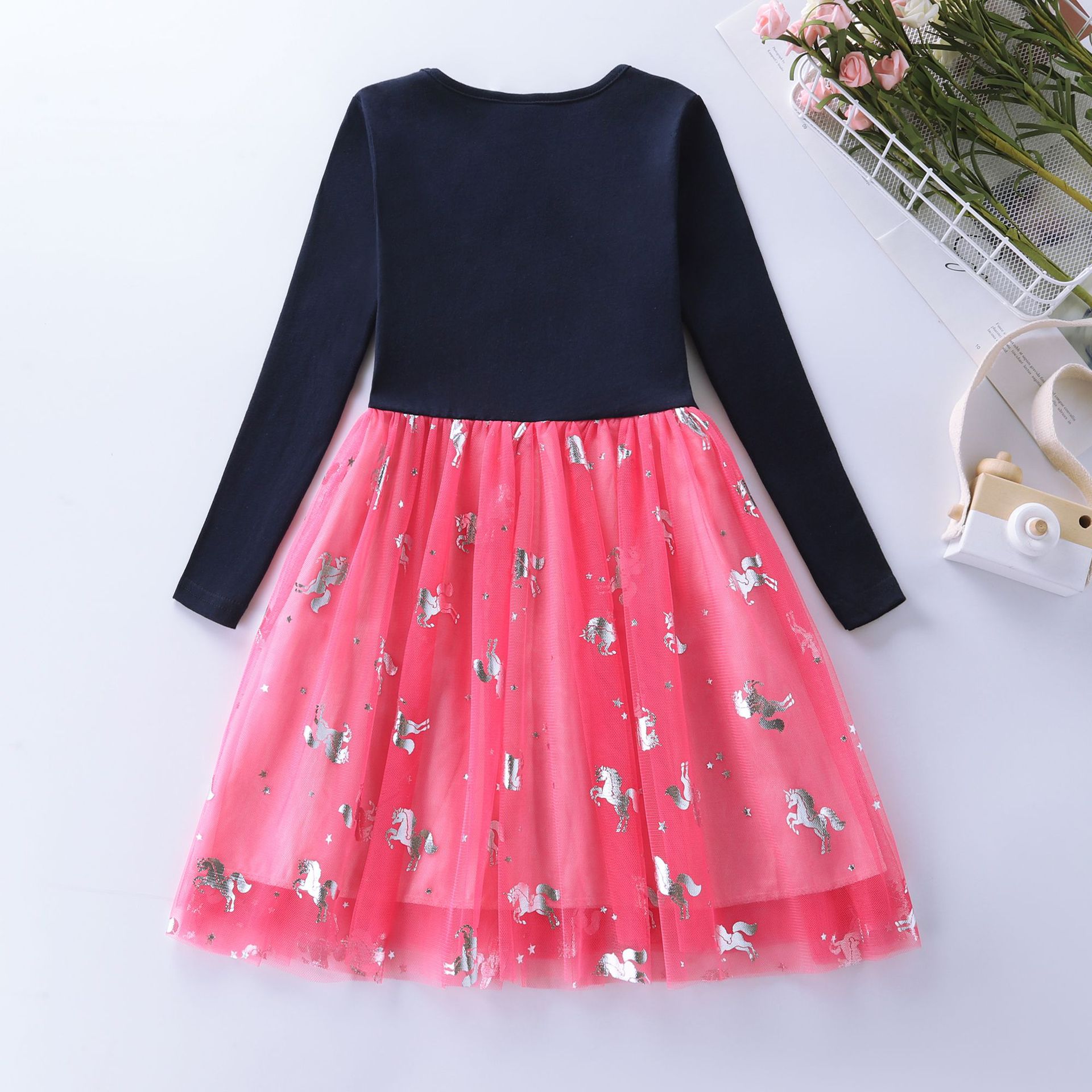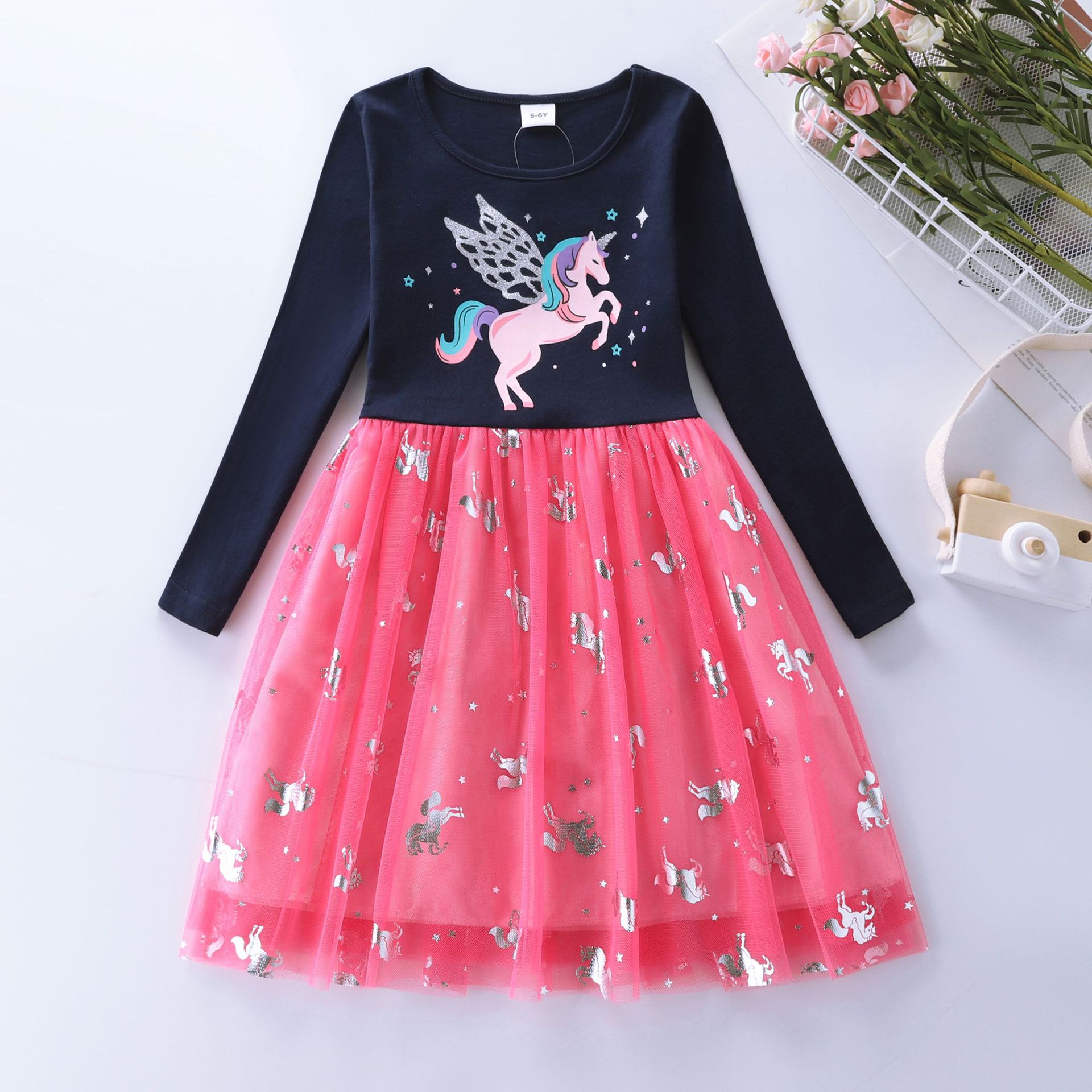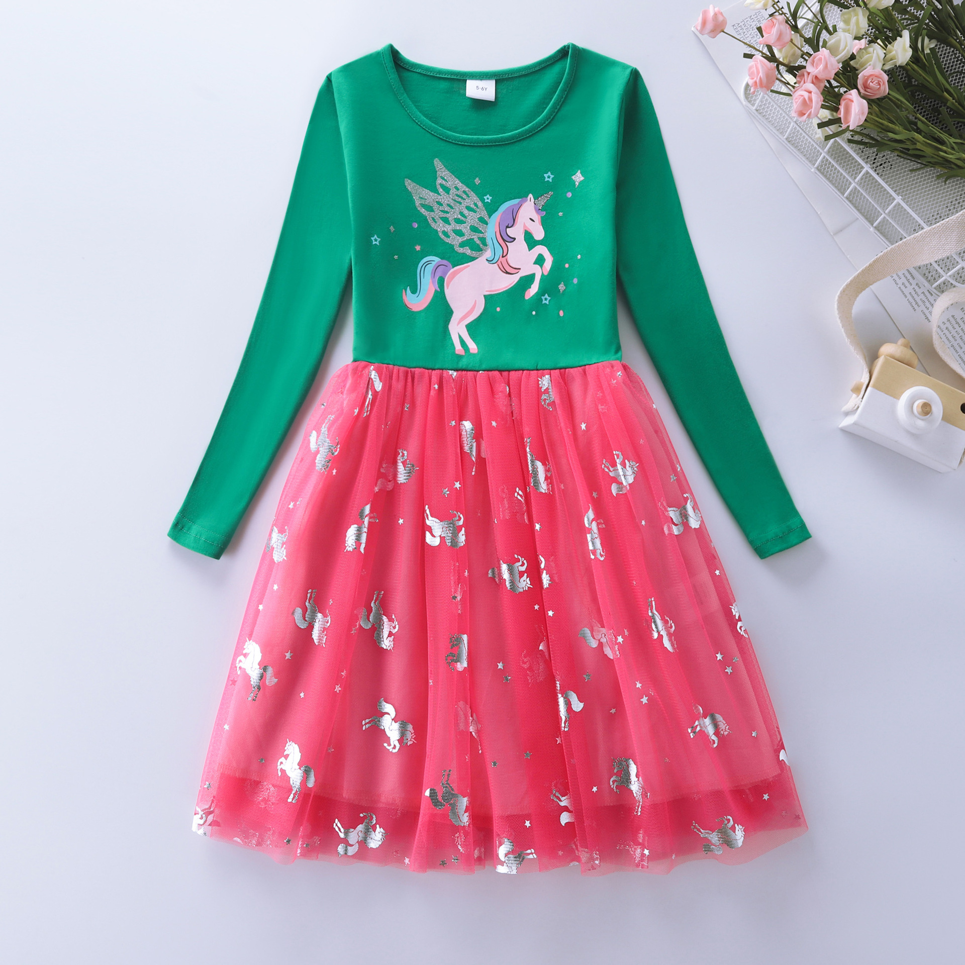 어린이 소녀 긴 소매 만화 유니콘 인쇄 가을 메쉬 스티칭 원피스 LH1702