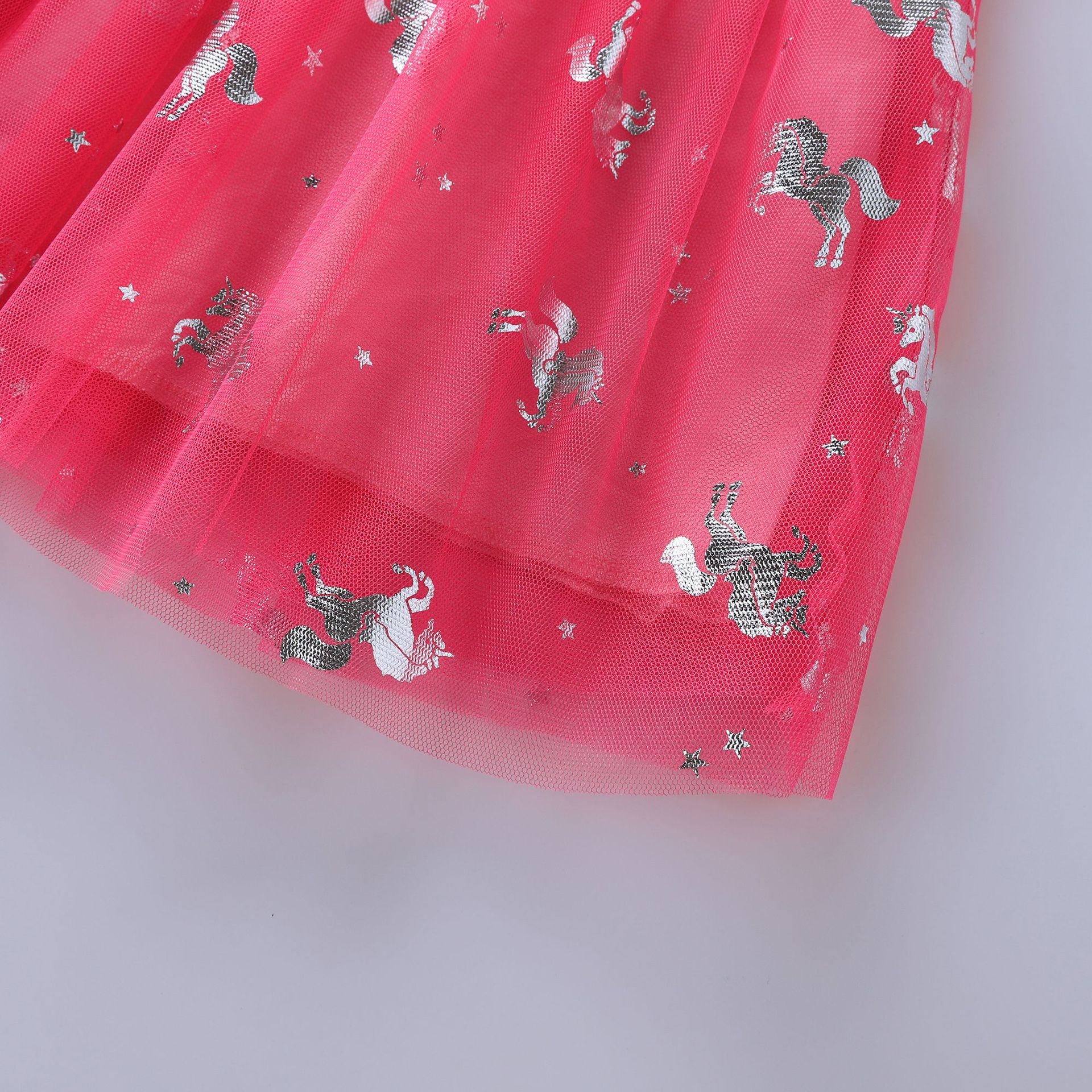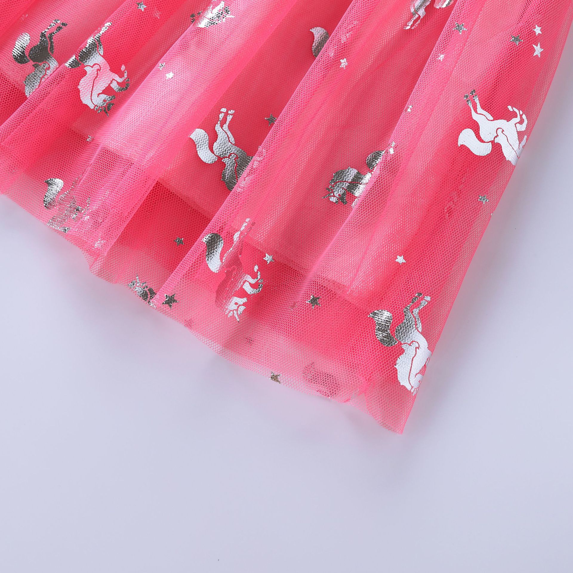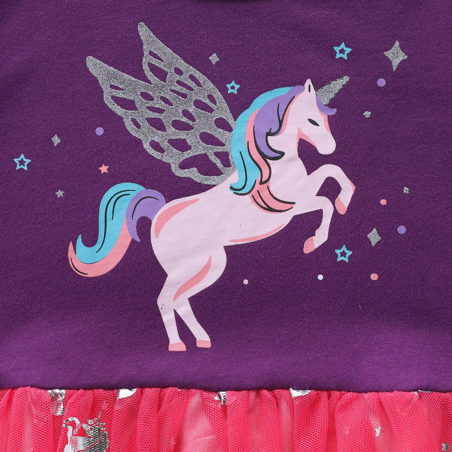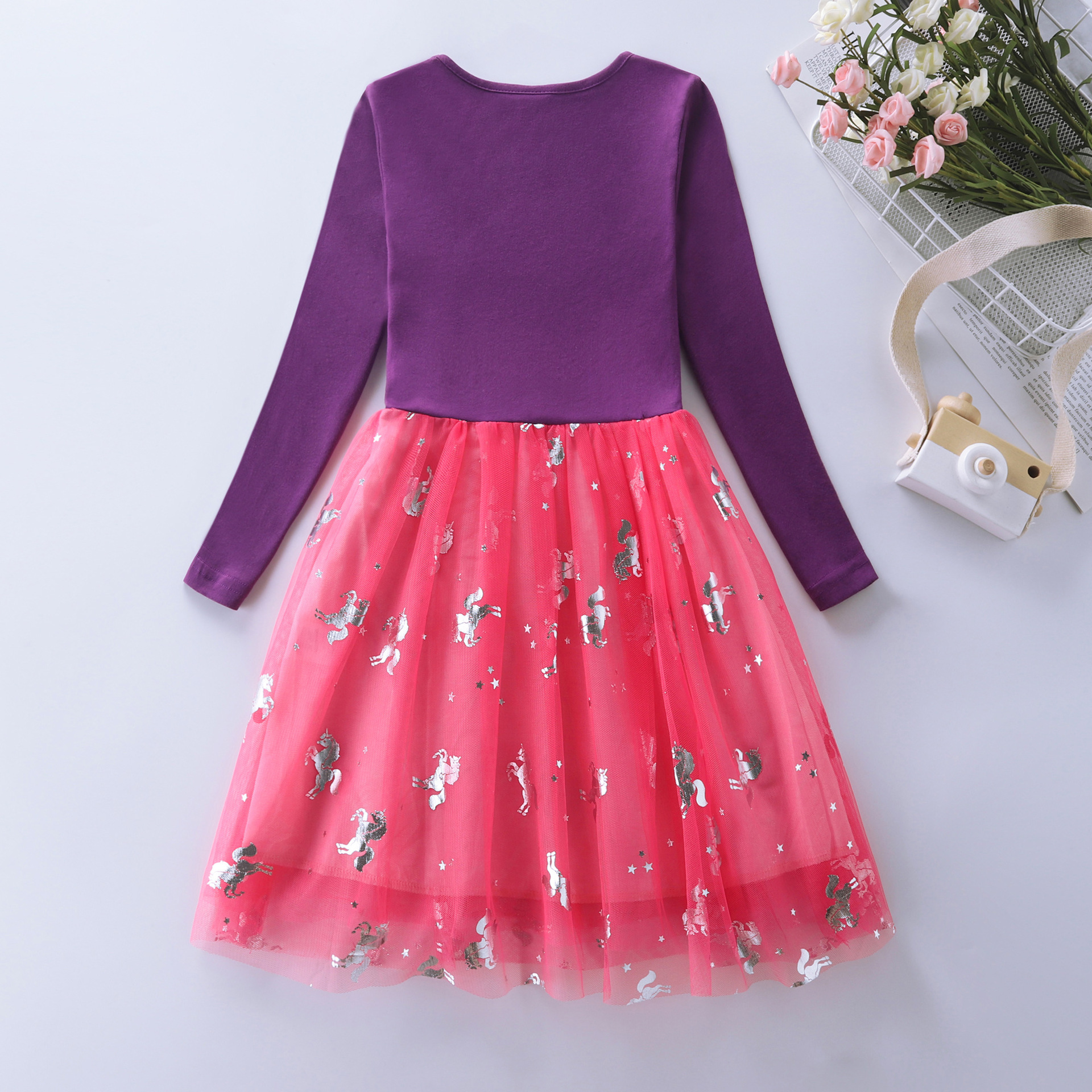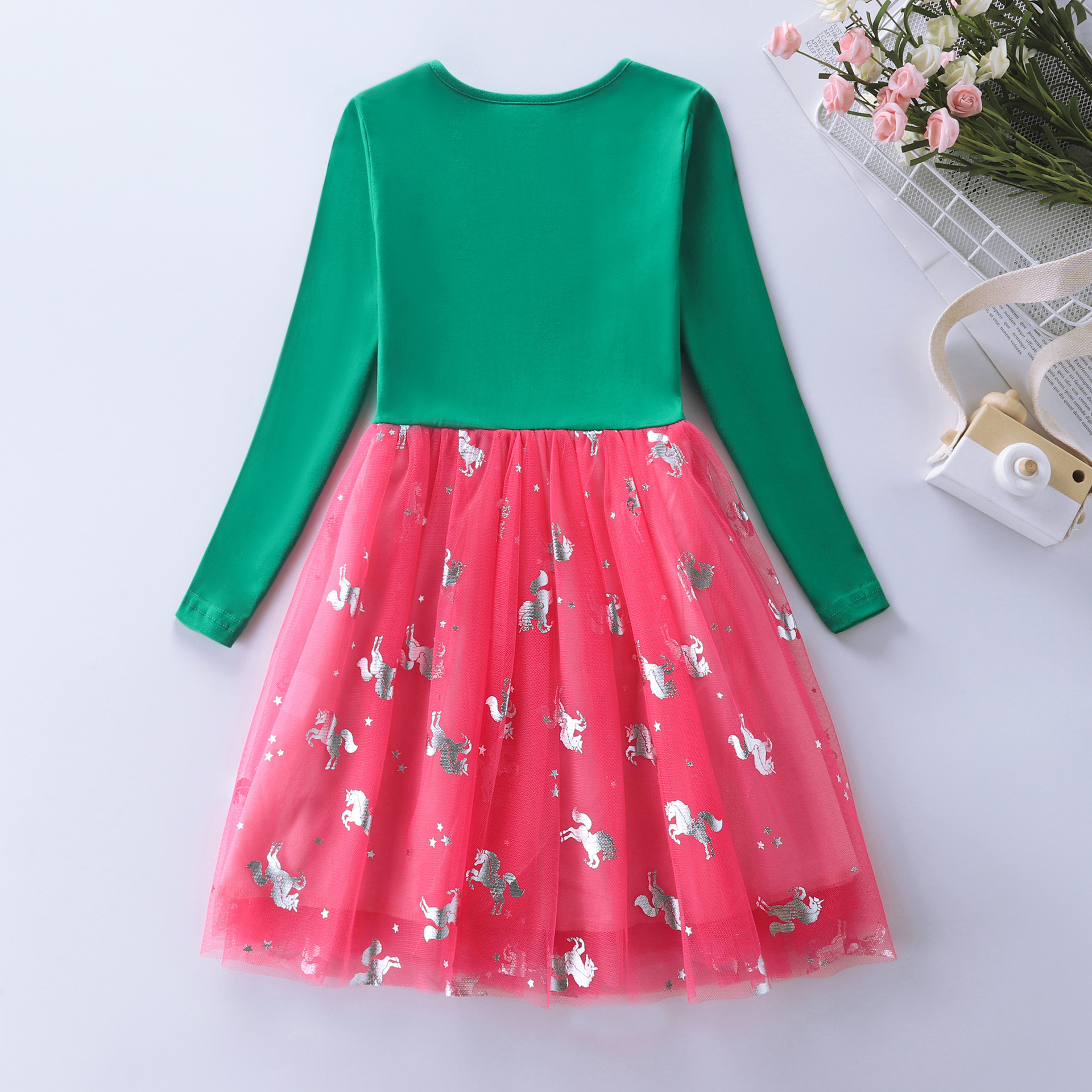 어린이 소녀 긴 소매 만화 유니콘 인쇄 가을 메쉬 스티칭 원피스 LH1702