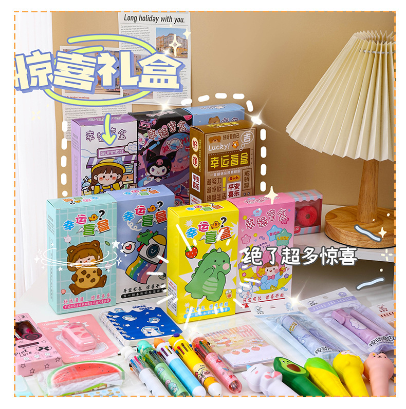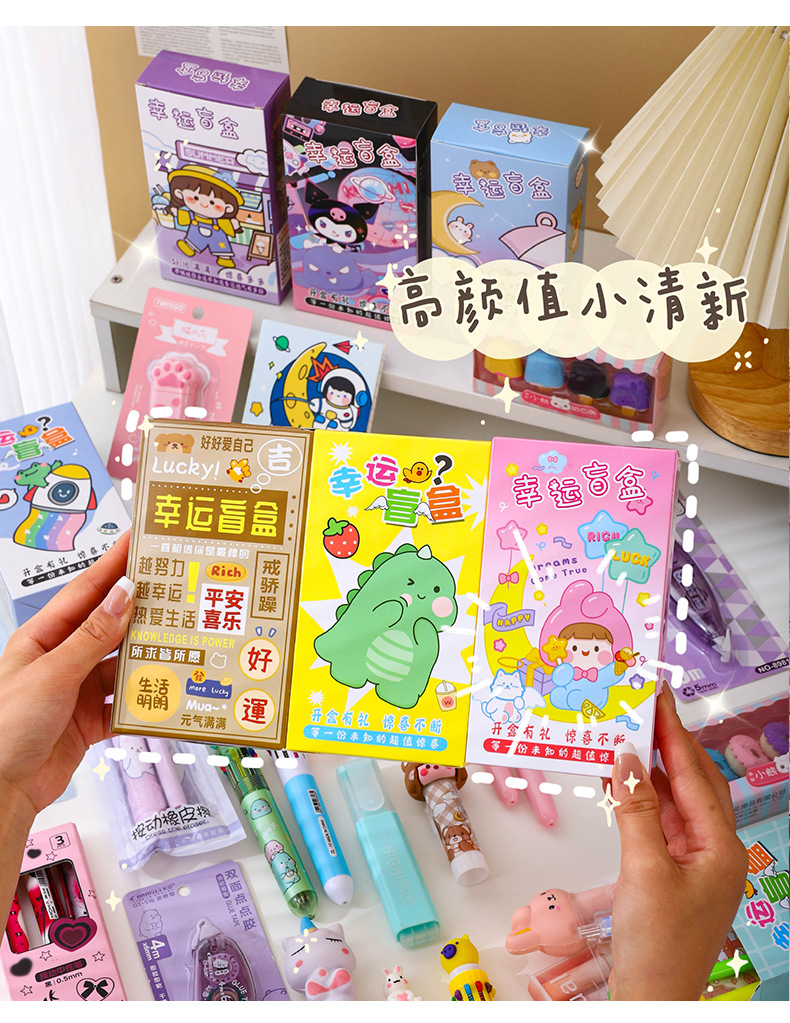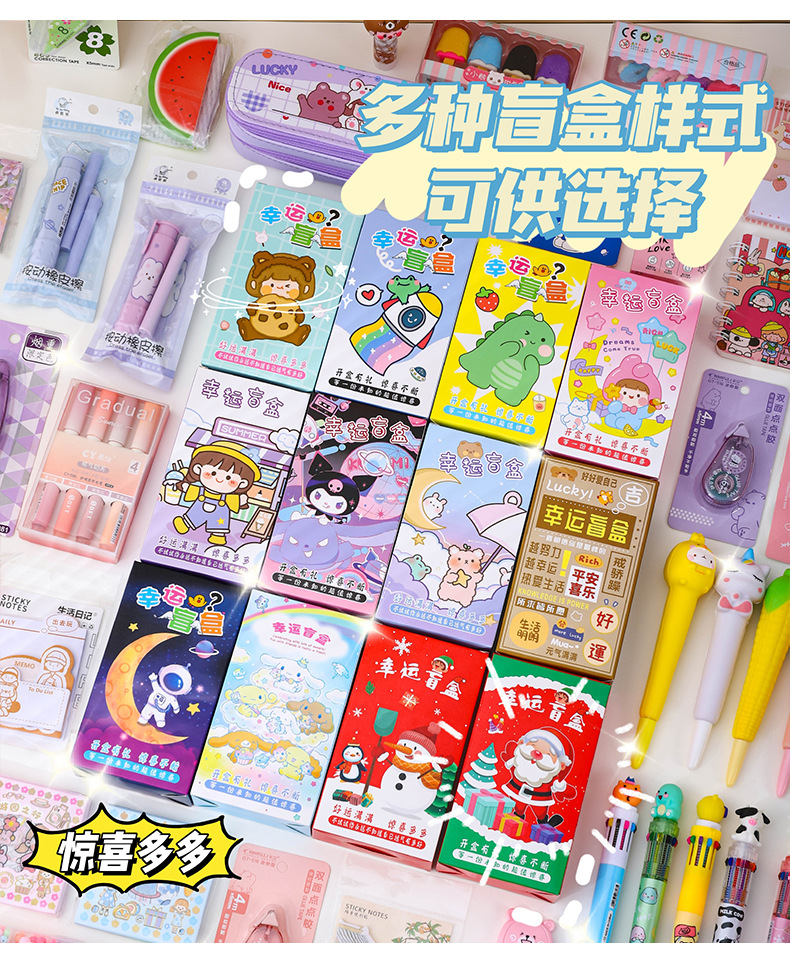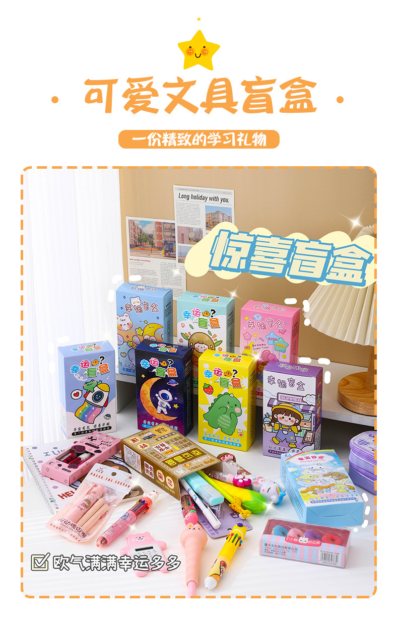 文具盲盒必出6-8样,图片仅供参考!!!以收到实物为准,如想知道里面大概有什么的可以咨询客服索要实拍图,实物图或观看直播讲解提前看下大概有什么,在考虑要不要买,不支持收到不满意和说图片不符要退差价或仅退款等要求