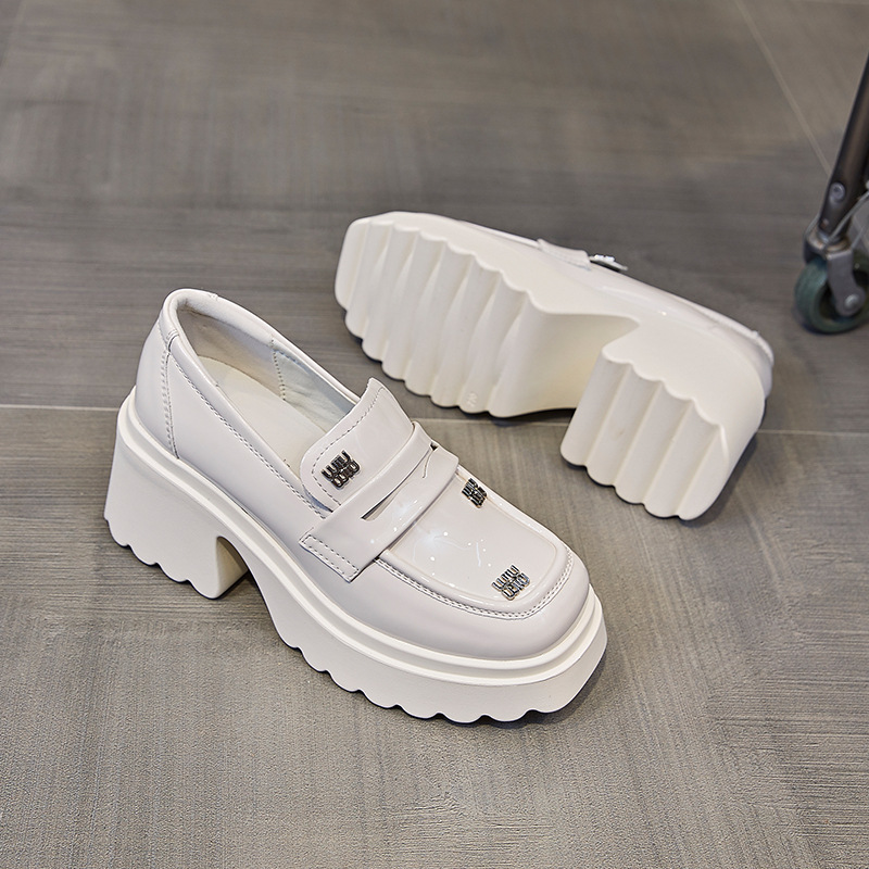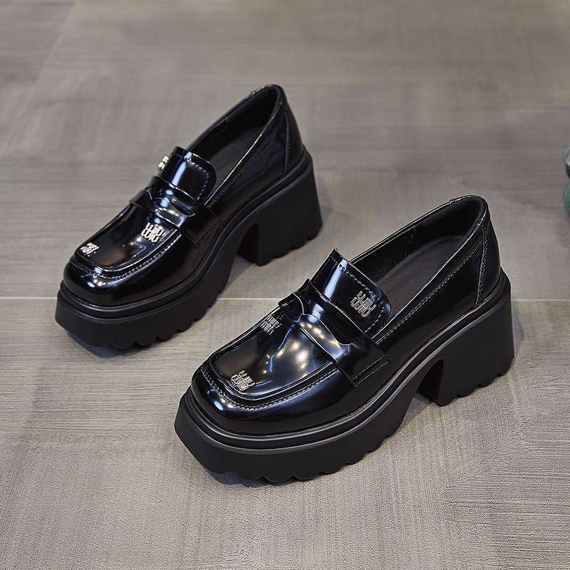 페이턴트 가죽 두꺼운 밑창 청키 힐 조커 작은 가죽 신발 여성용 2023 가을과 겨울 새로운 라운드 토 브리티시 스타일 슬립온 로퍼