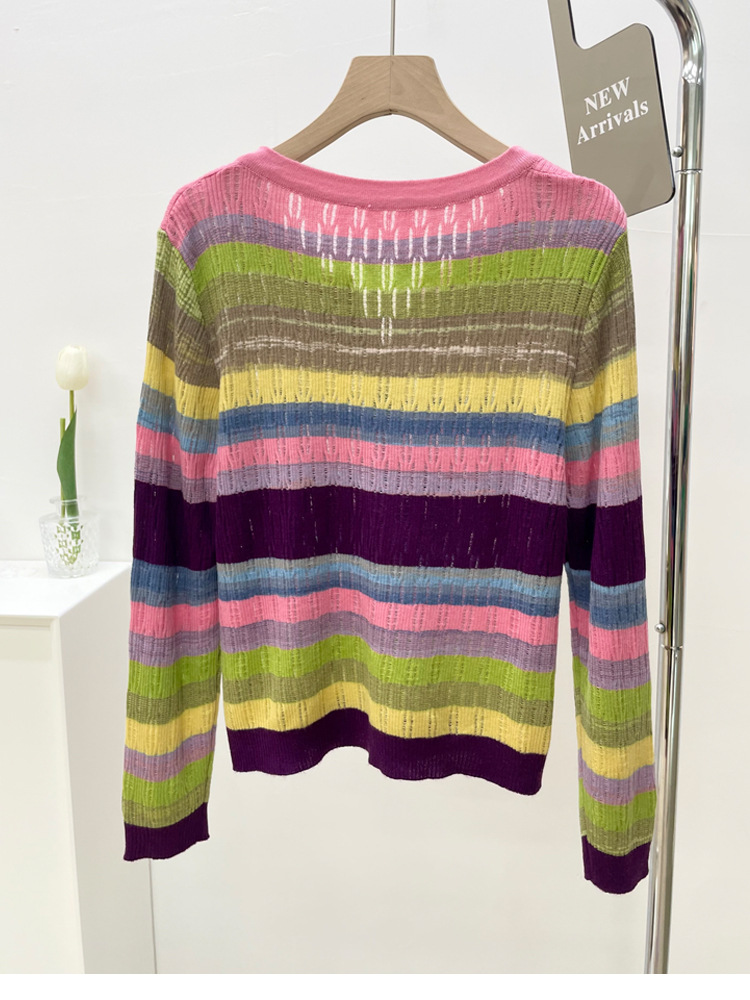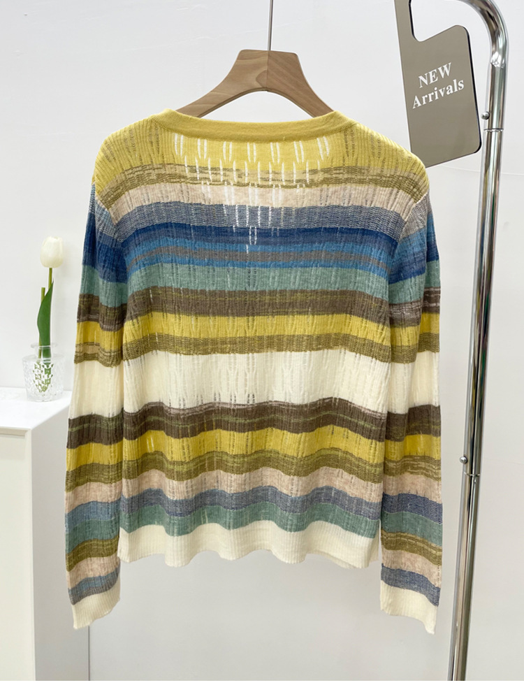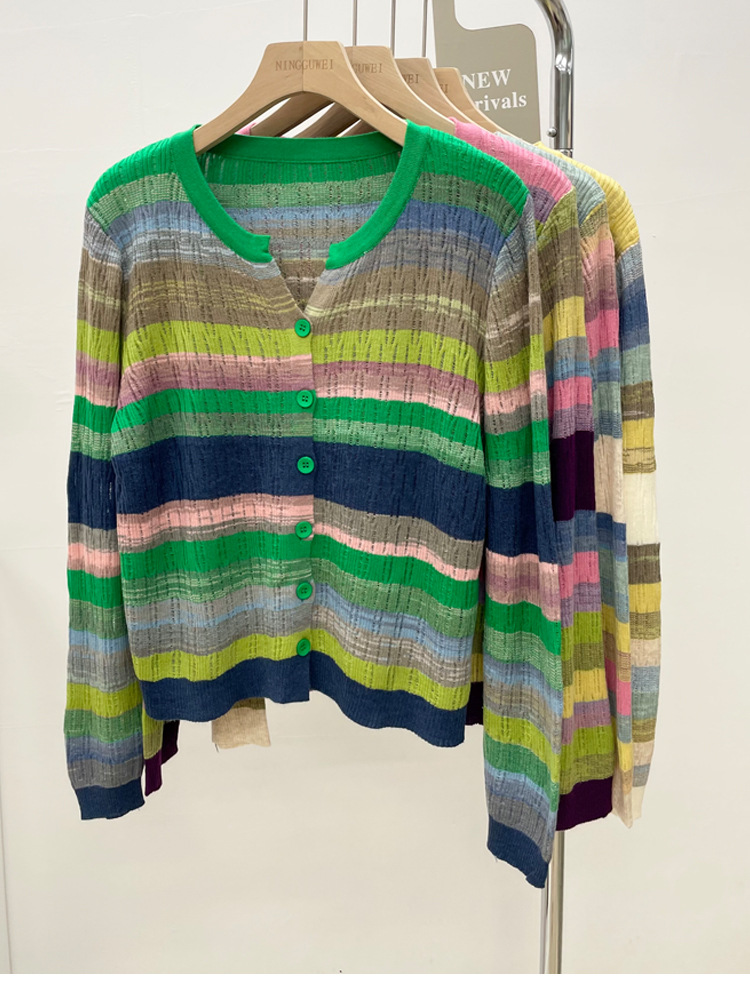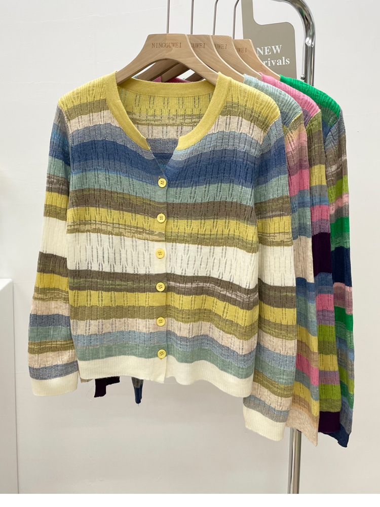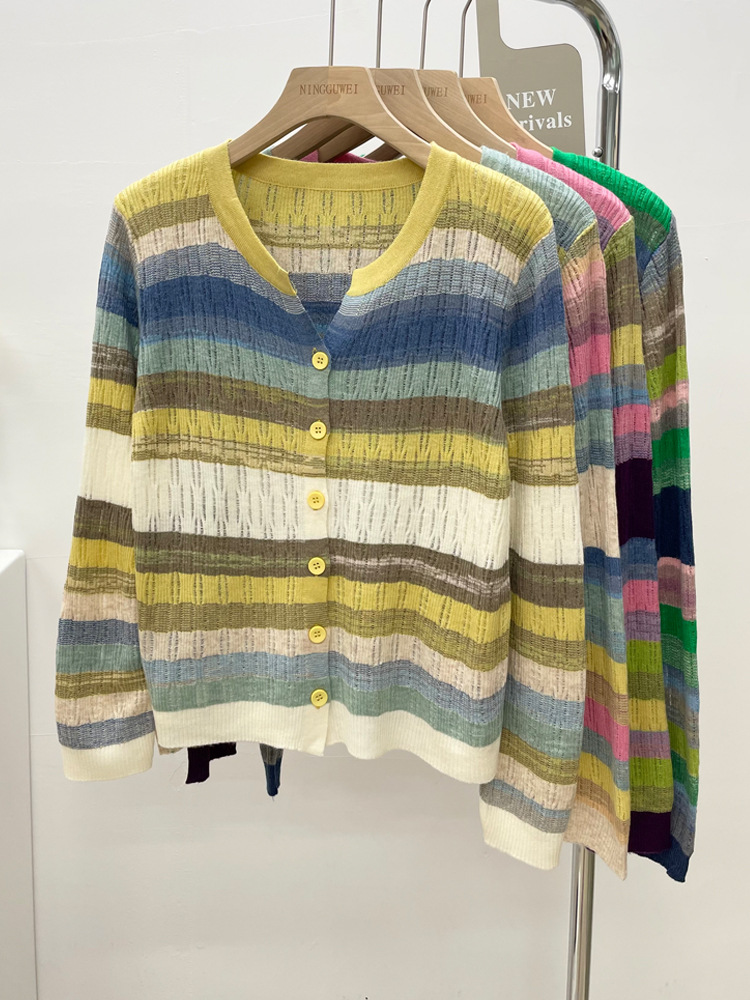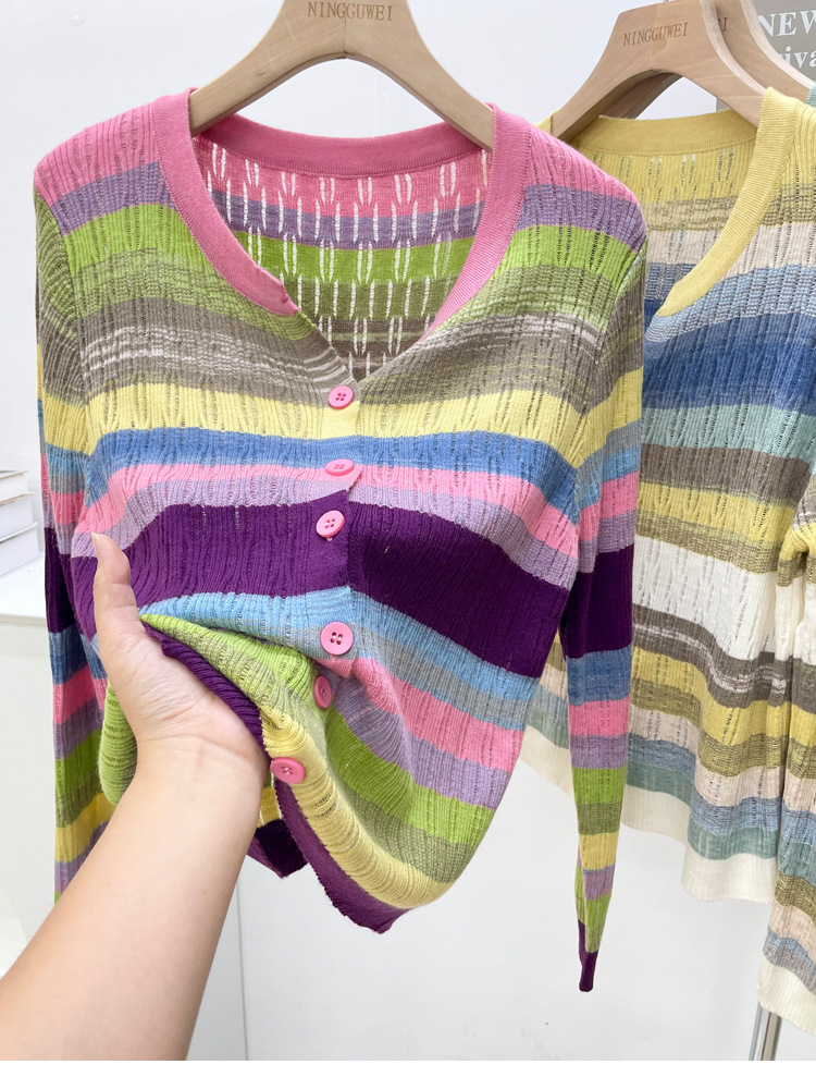 국경 간 유럽 컬러 니트 스웨터 카디건 여성의 봄 새로운 V 넥 할로우 스트라이프 베이스 탑 긴팔 스웨터스토어 가기