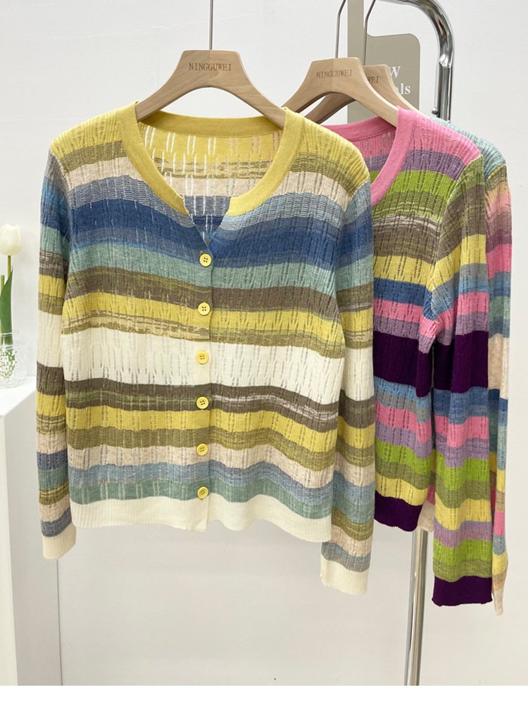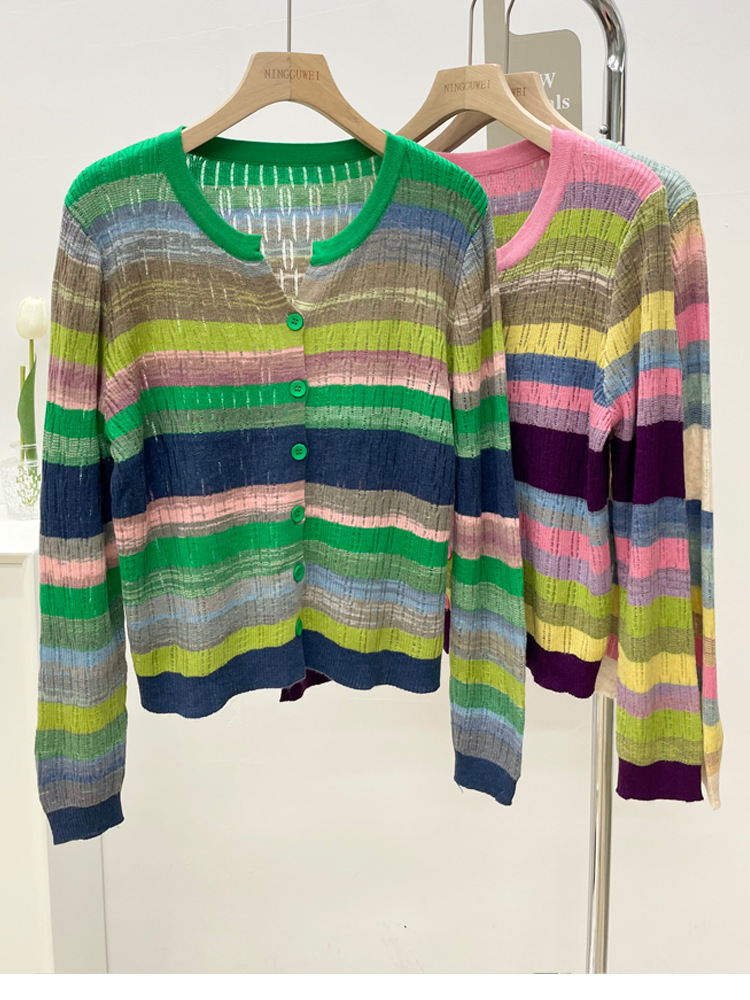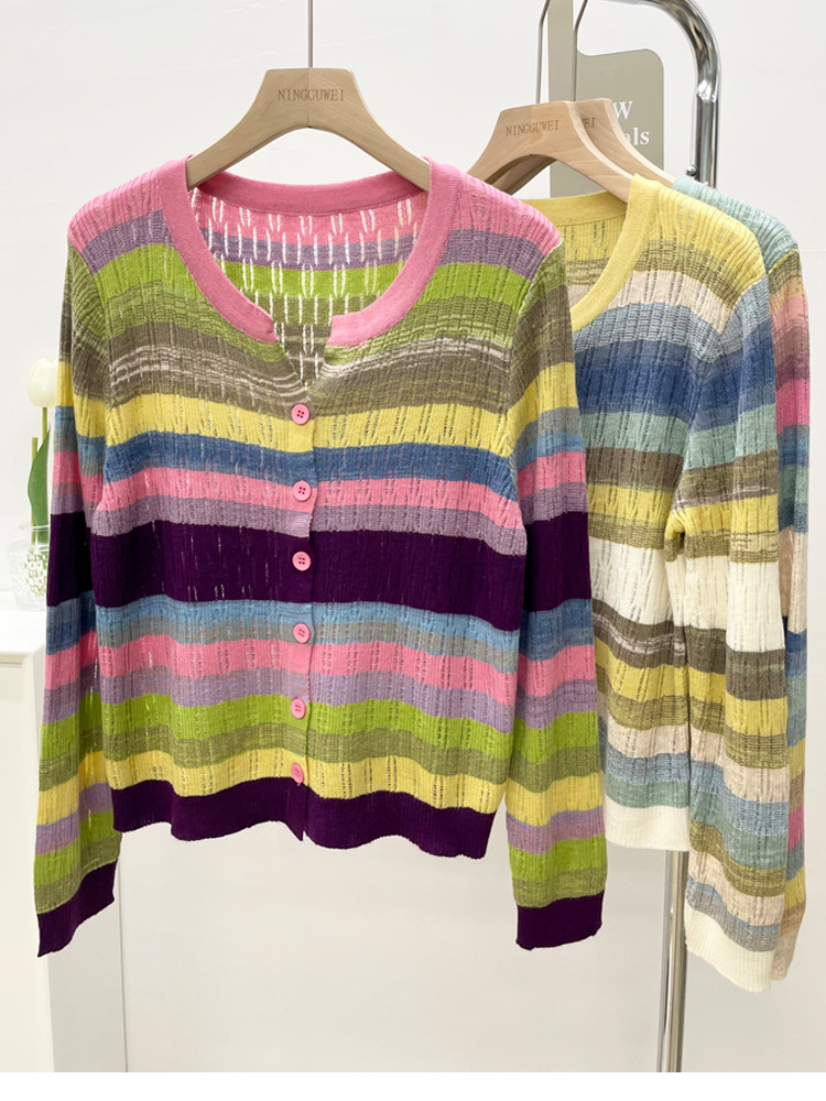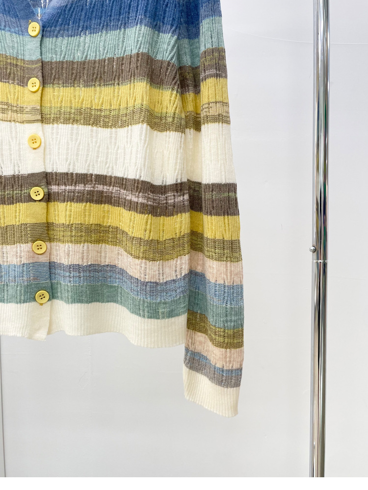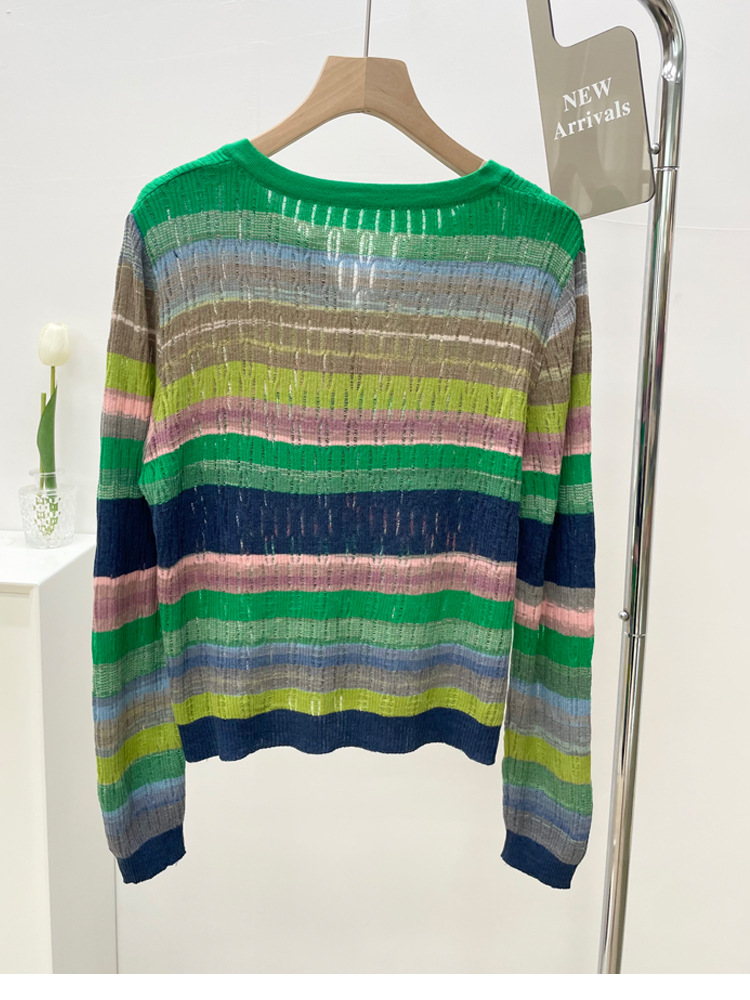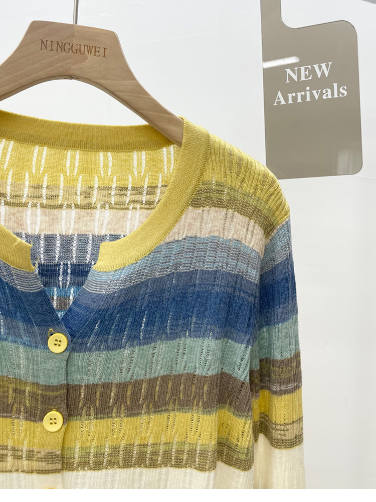 국경 간 유럽 컬러 니트 스웨터 카디건 여성의 봄 새로운 V 넥 할로우 스트라이프 베이스 탑 긴팔 스웨터스토어 가기