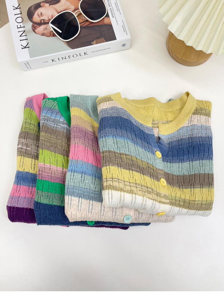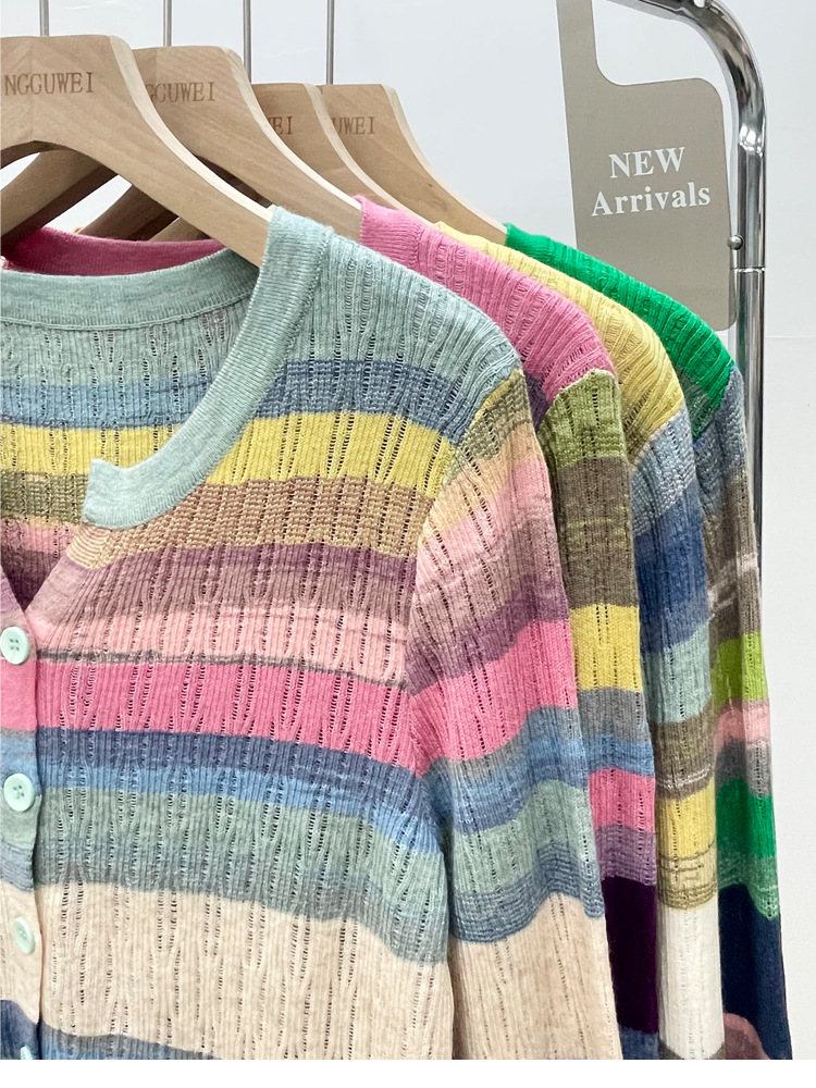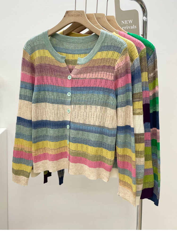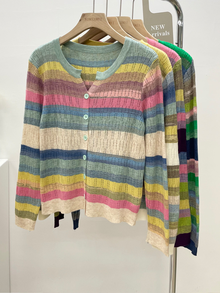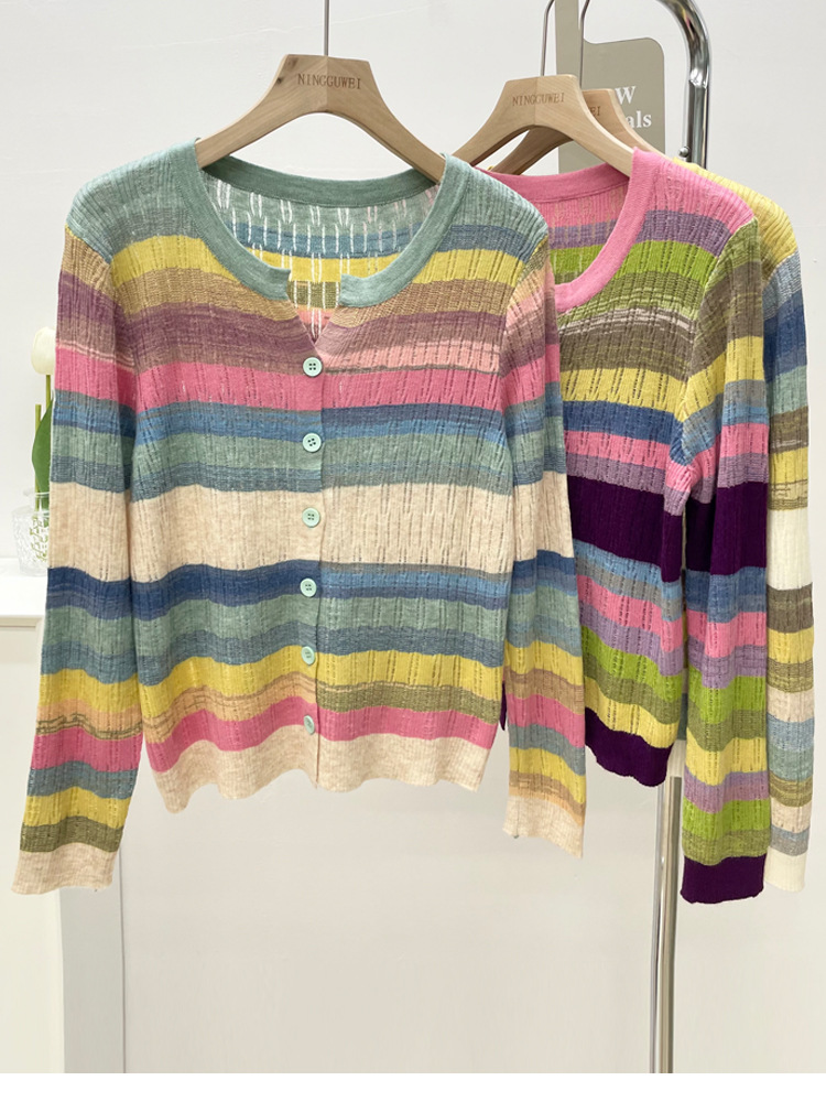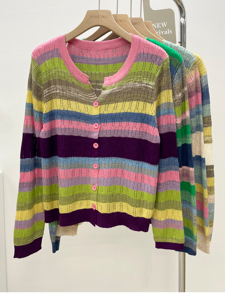 국경 간 유럽 컬러 니트 스웨터 카디건 여성의 봄 새로운 V 넥 할로우 스트라이프 베이스 탑 긴팔 스웨터스토어 가기