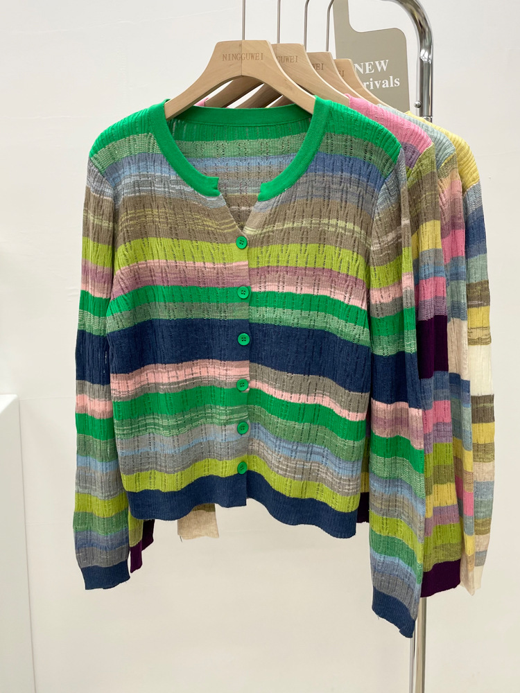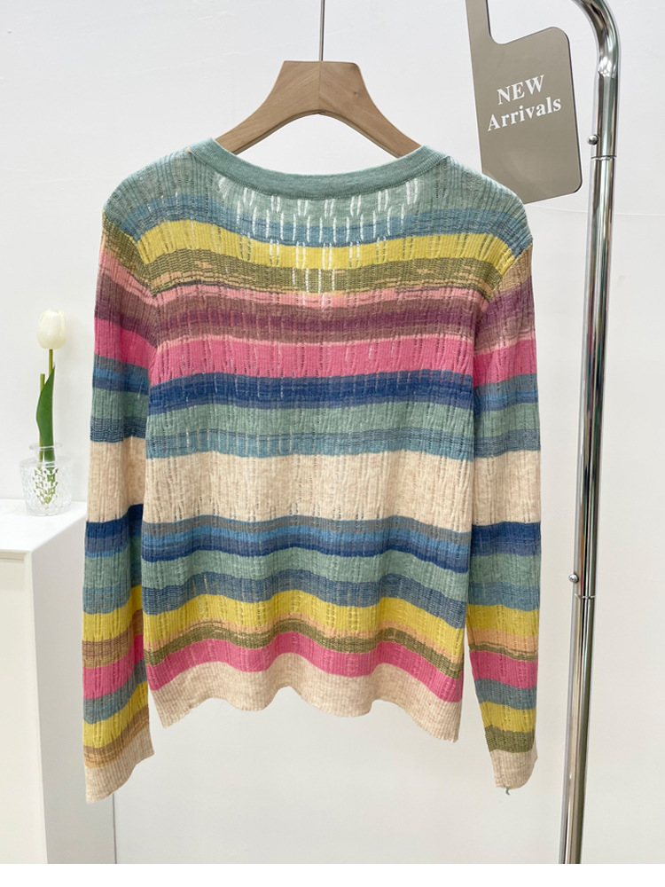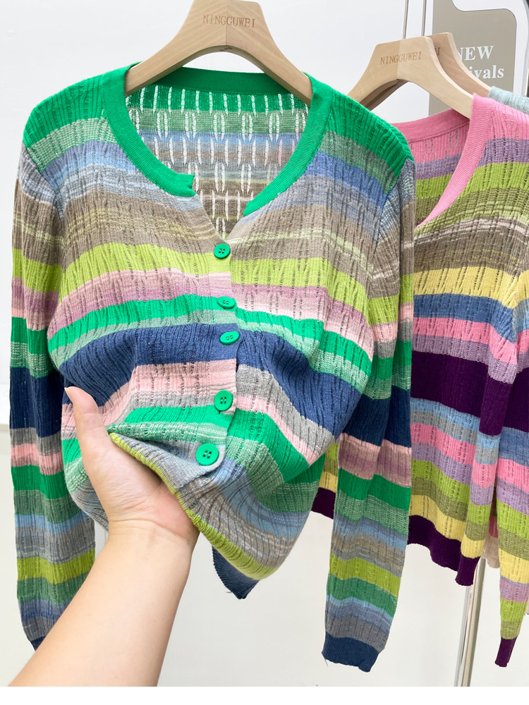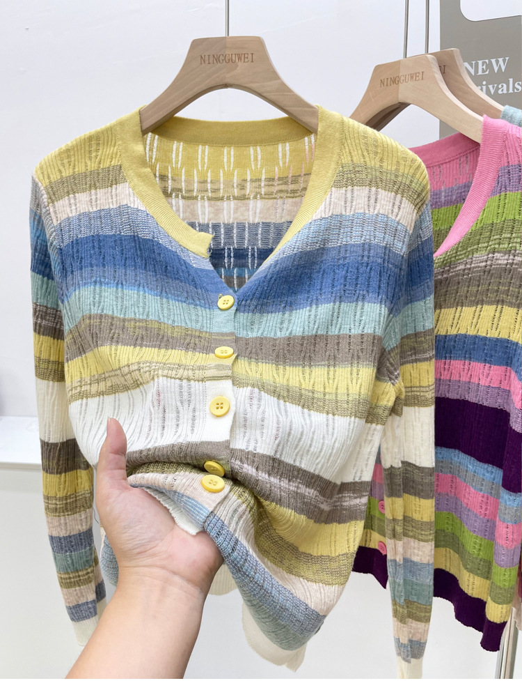 국경 간 유럽 컬러 니트 스웨터 카디건 여성의 봄 새로운 V 넥 할로우 스트라이프 베이스 탑 긴팔 스웨터