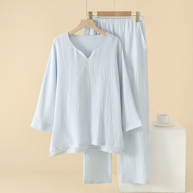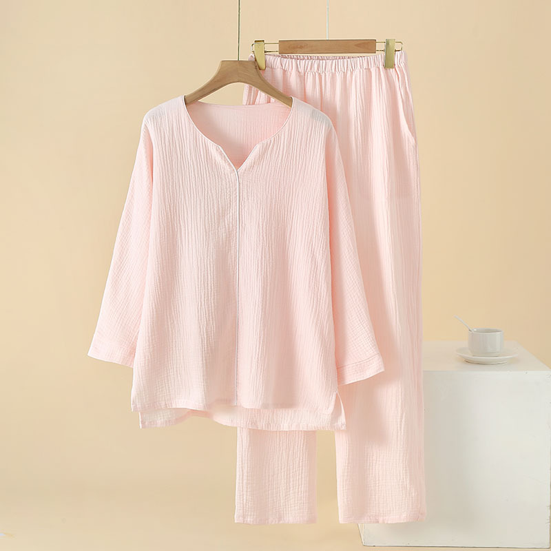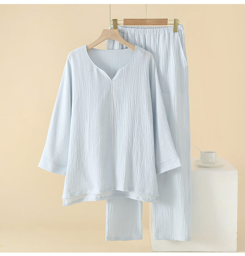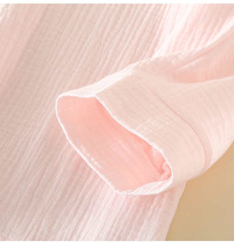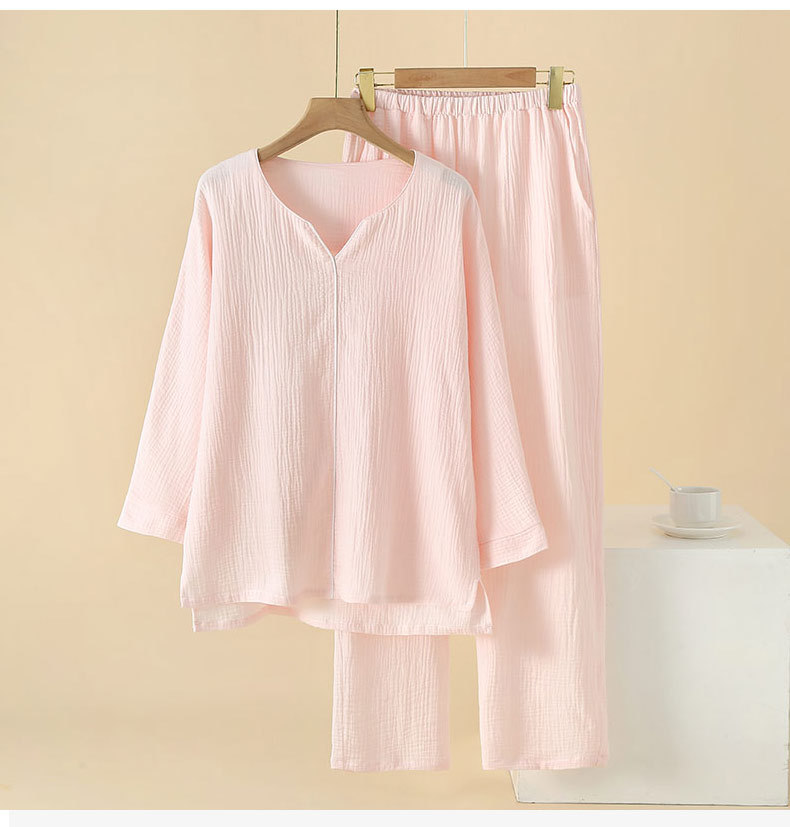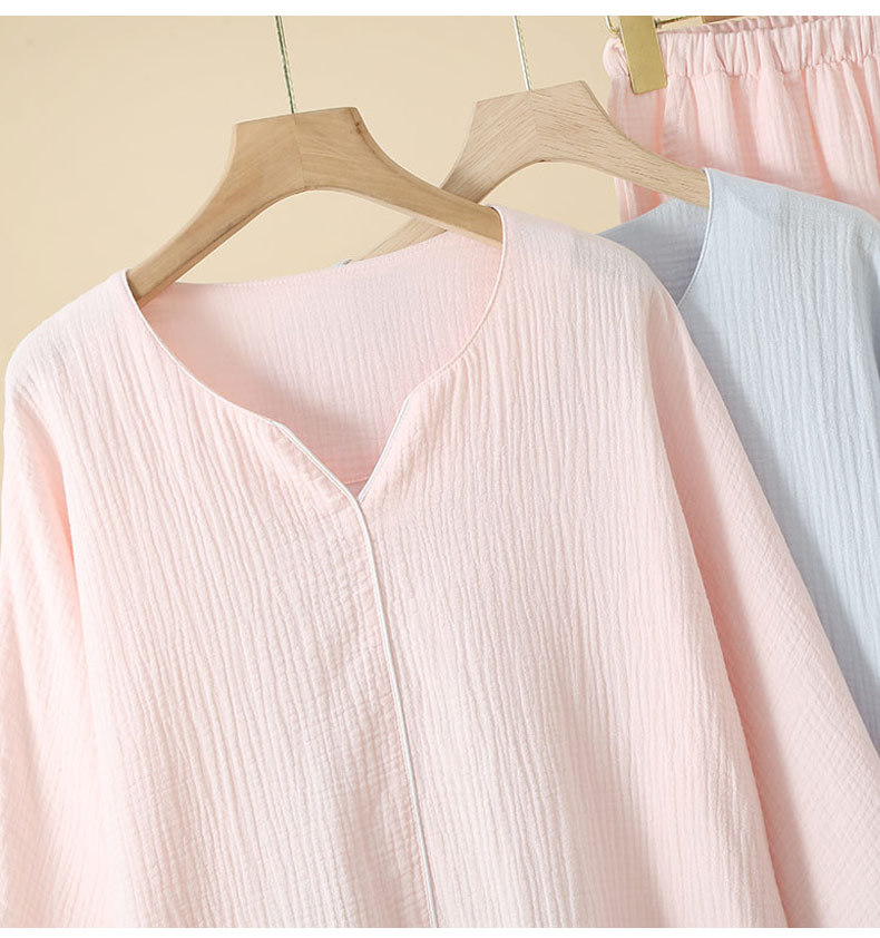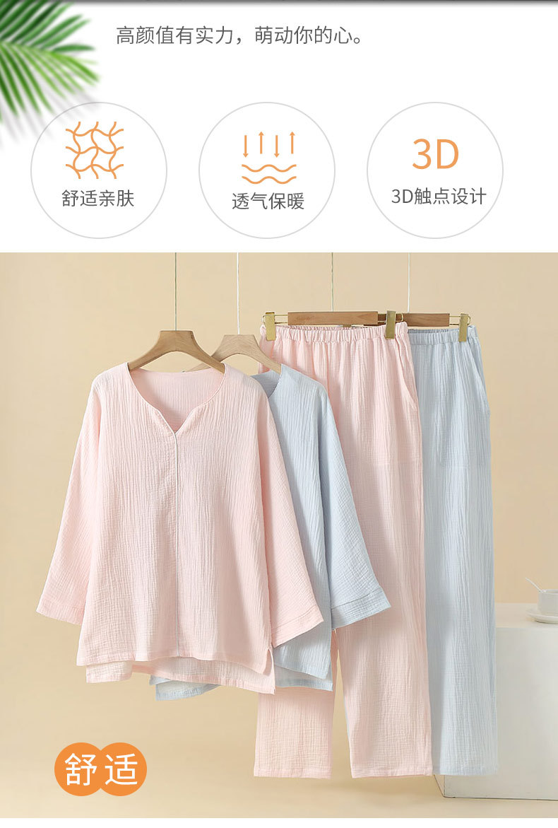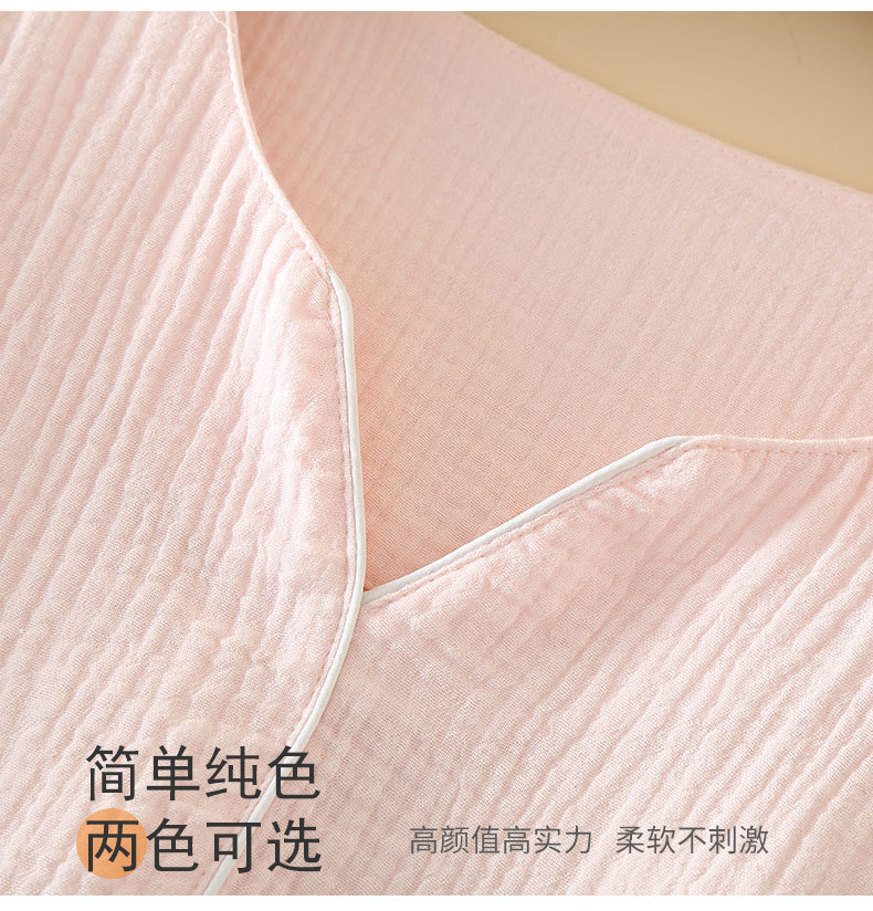 새로운 봄과 여름 여성의 면사 일본 잠옷 더블 거즈 통기성 캐주얼 가정 옷 세트 면 닙 소매스토어 가기